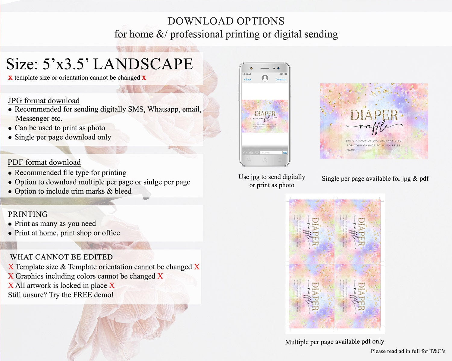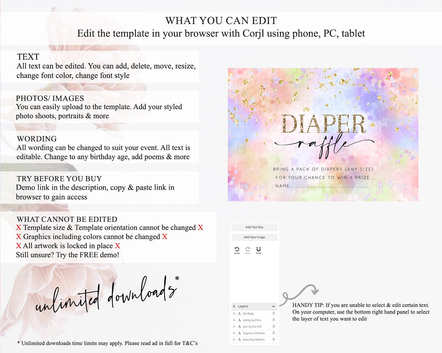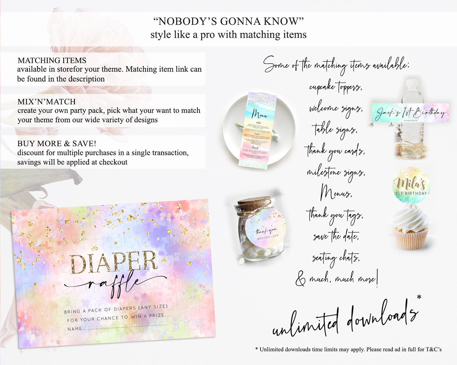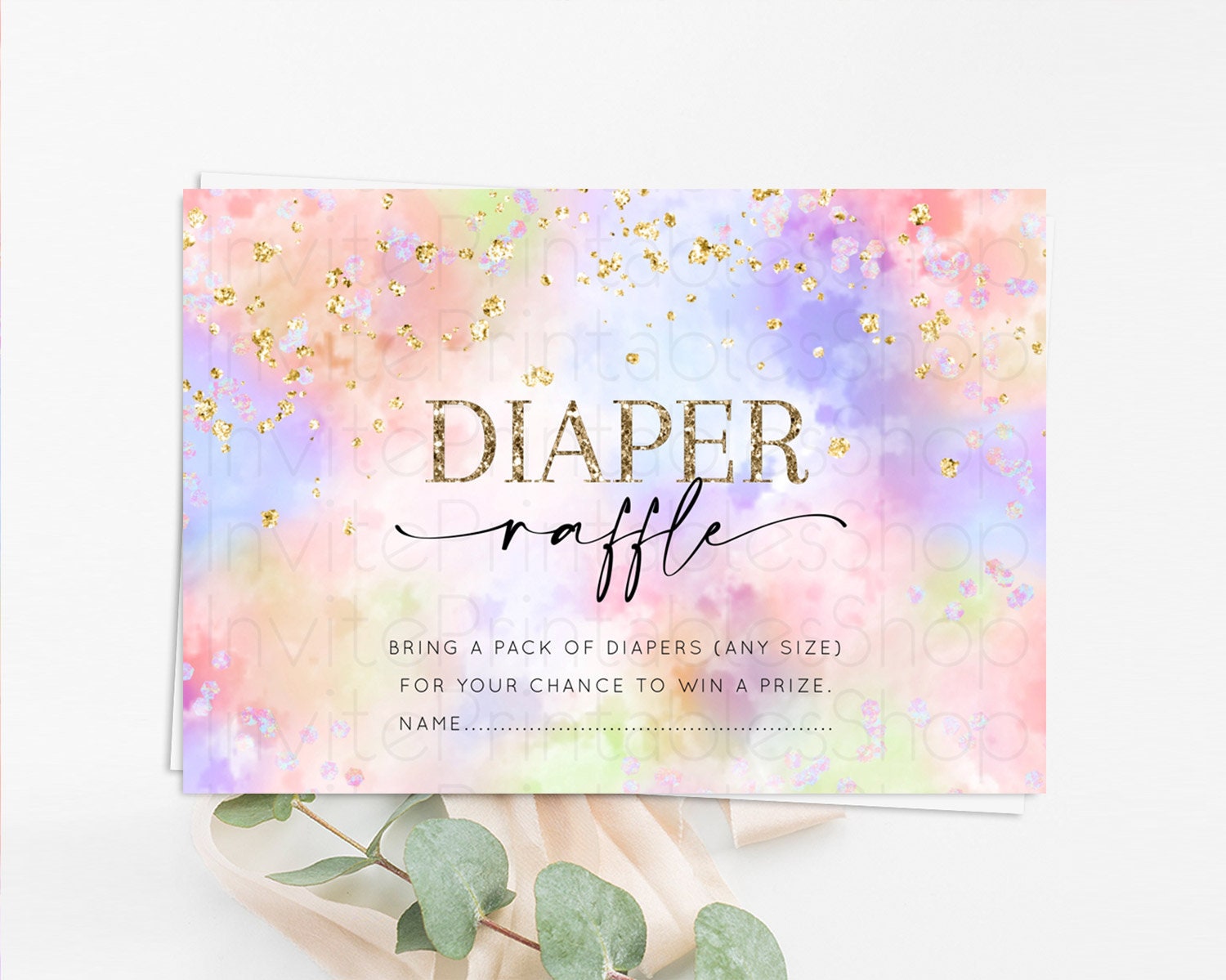 Pastel Diaper Raffle Card Pastel Rainbow Diaper Raffle Insert Colorful Ombre Watercolor Diaper Ticket Confetti Glitter Raffle Game D10610