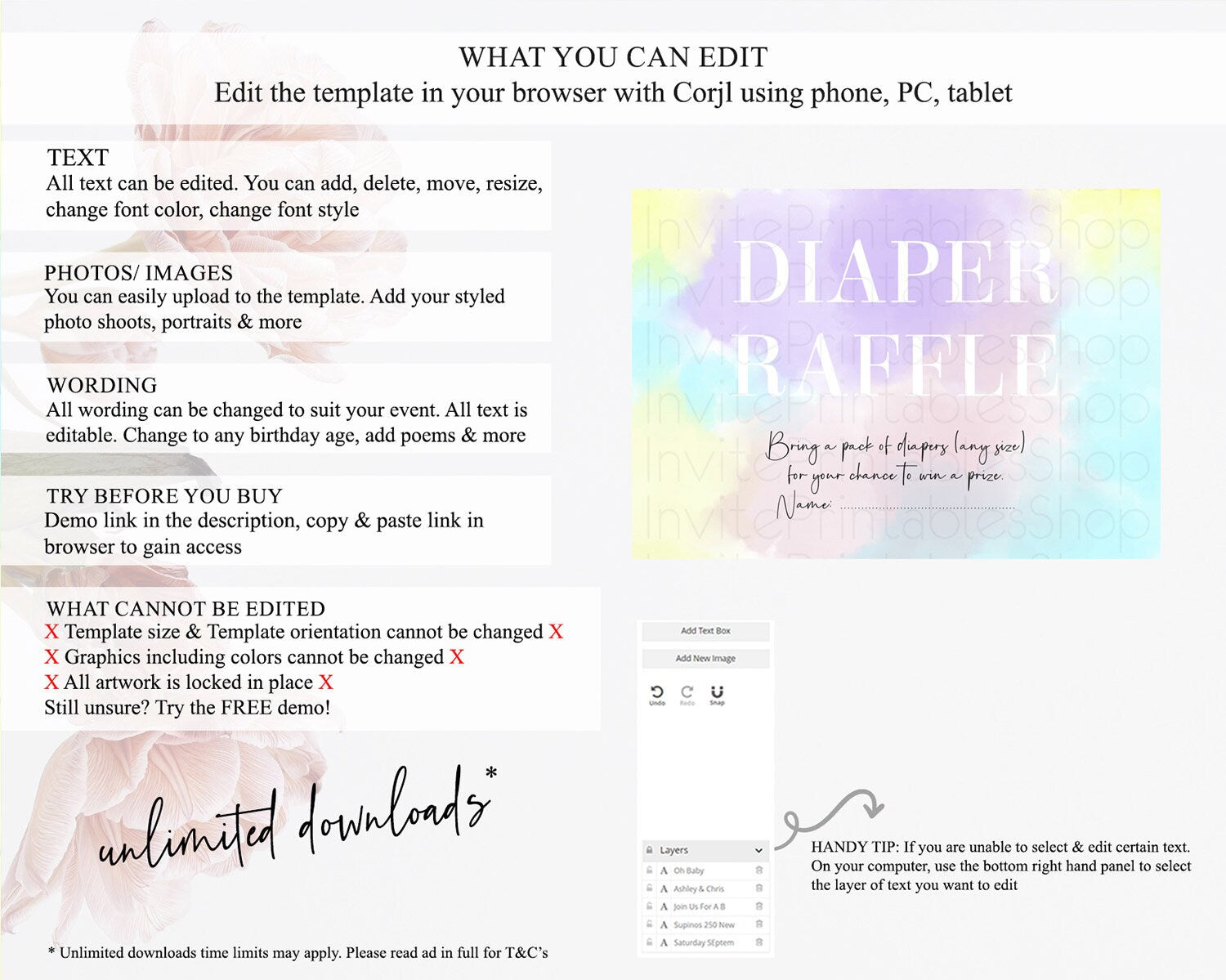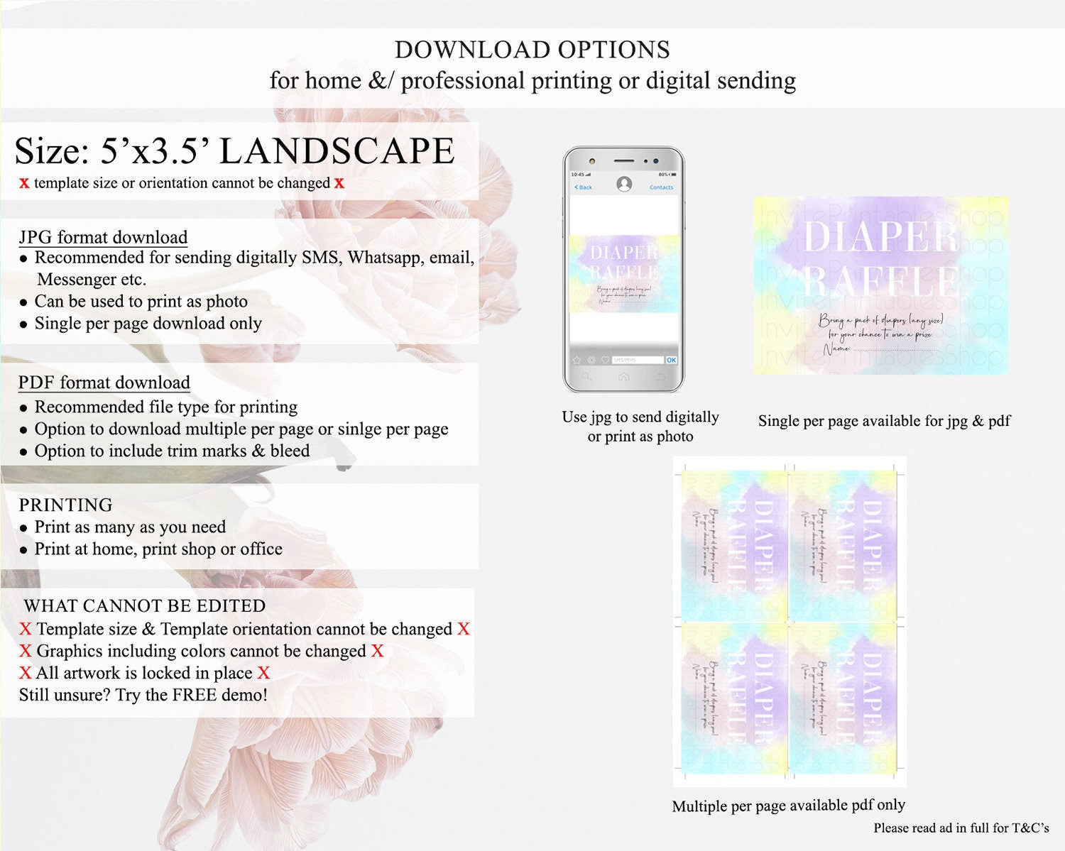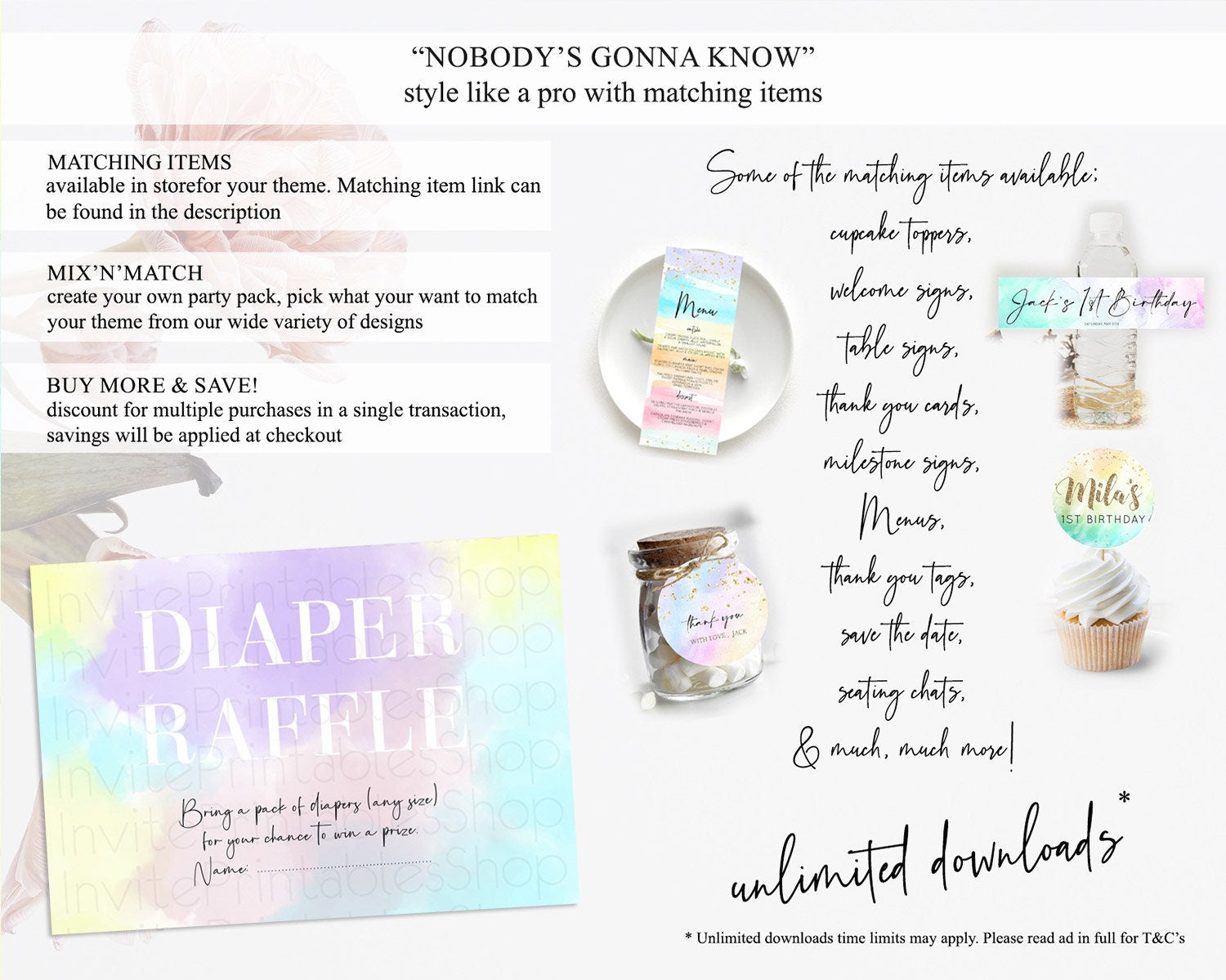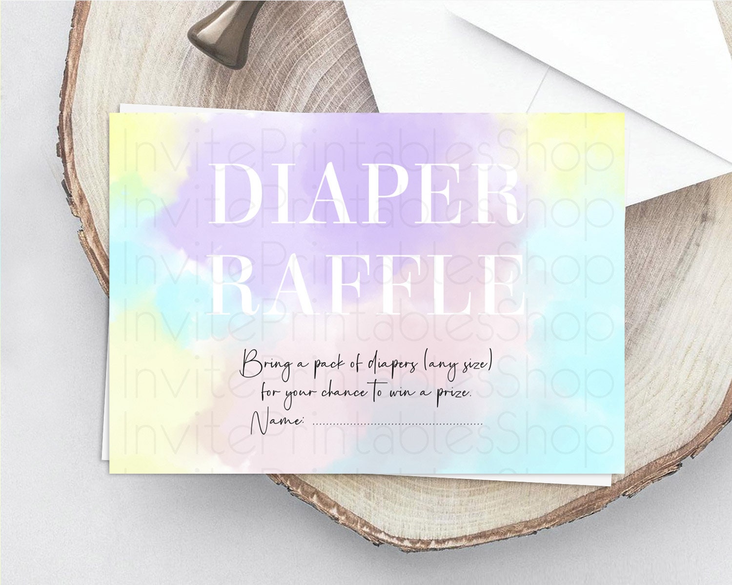 Pastel Diaper Raffle Card Pastel Rainbow Diaper Raffle Insert Colorful Ombre Watercolor Diaper Ticket Confetti Glitter Raffle Game D10617