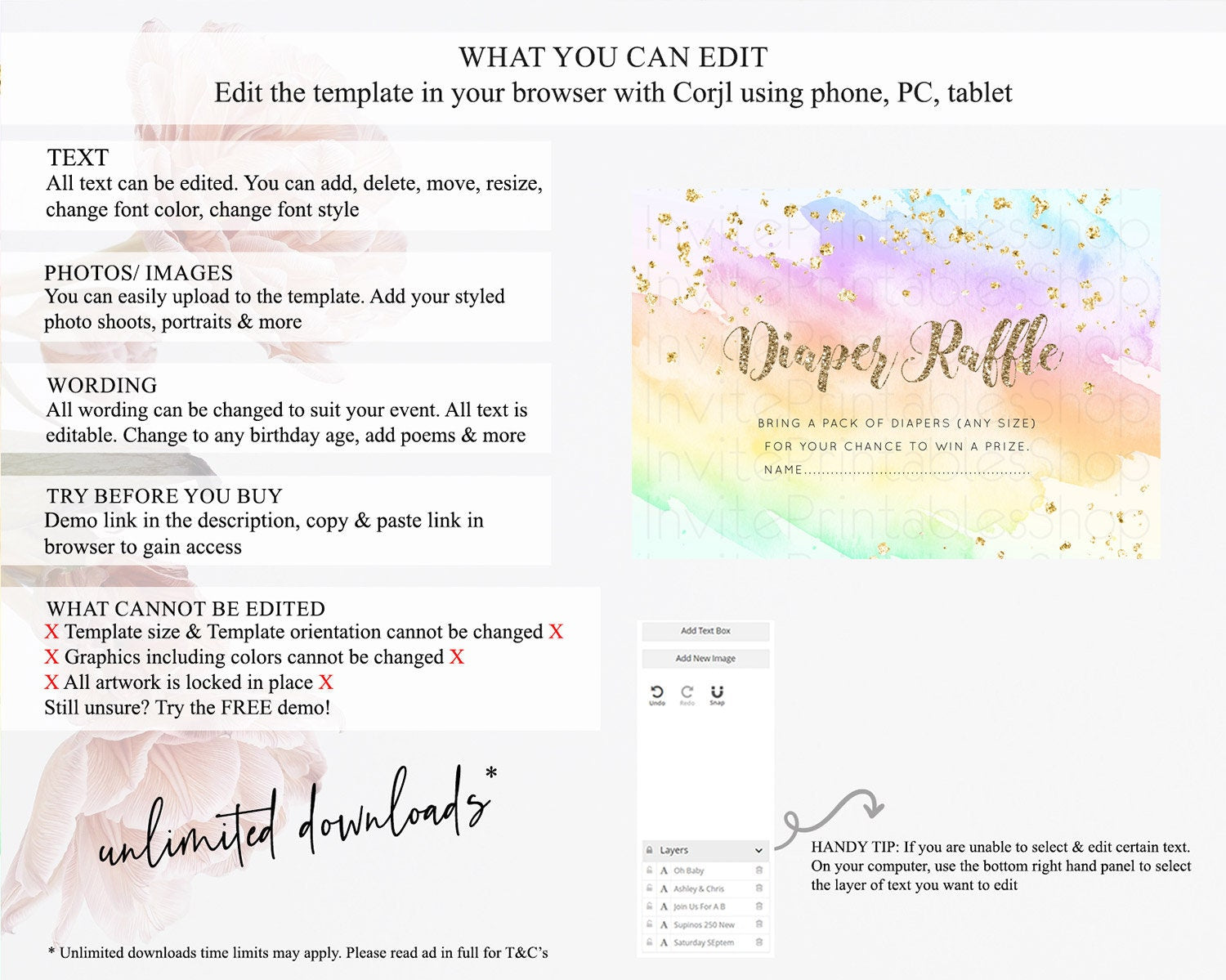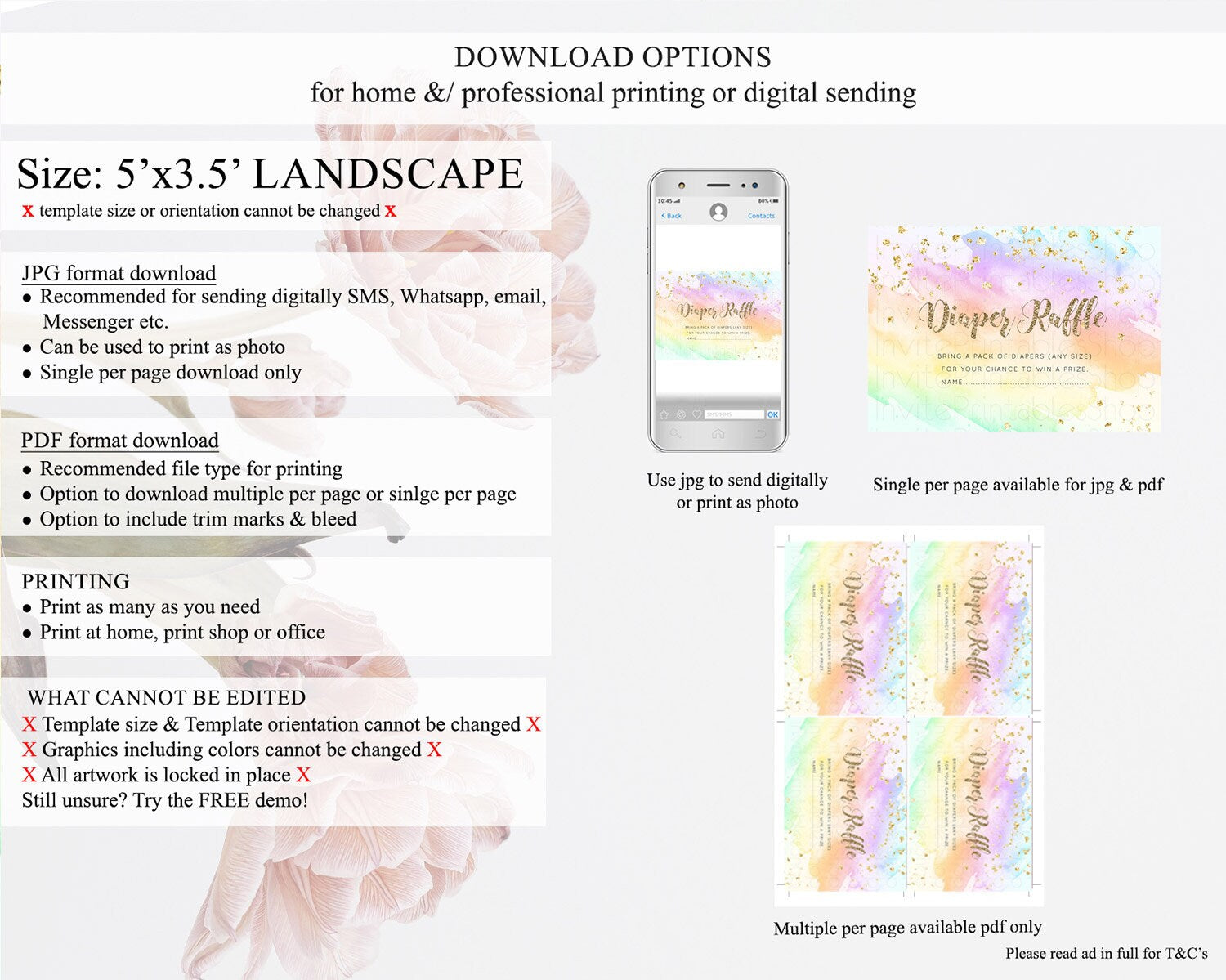 Pastel Diaper Raffle Card Pastel Rainbow Diaper Raffle Insert Colorful Ombre Watercolor Diaper Ticket Confetti Glitter Raffle Game D10643
