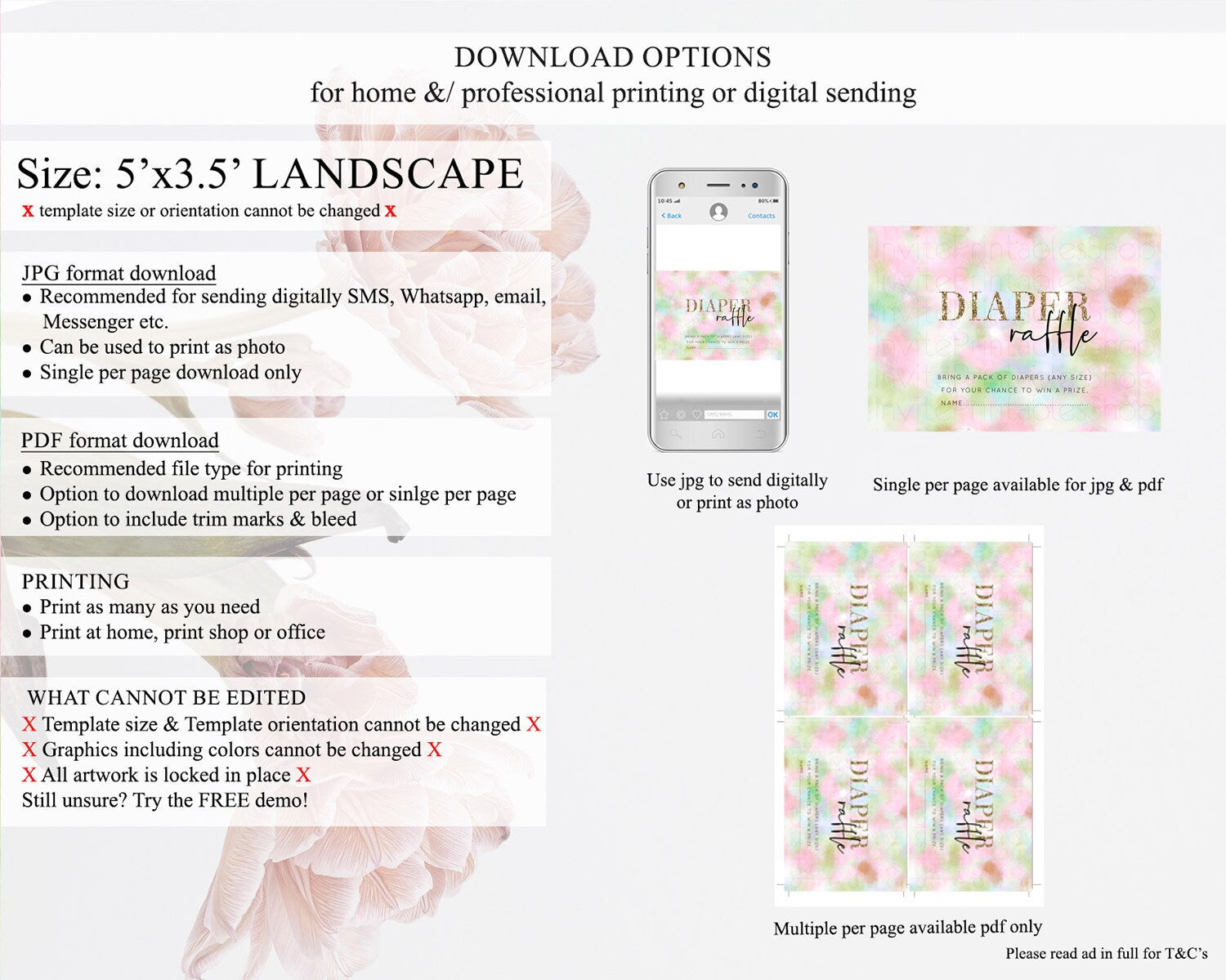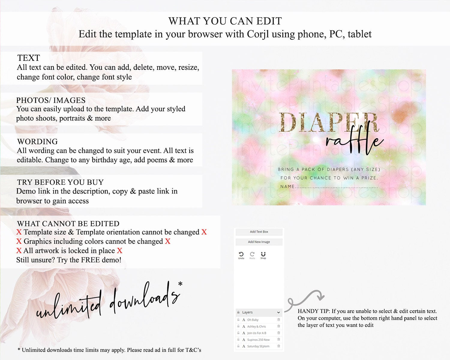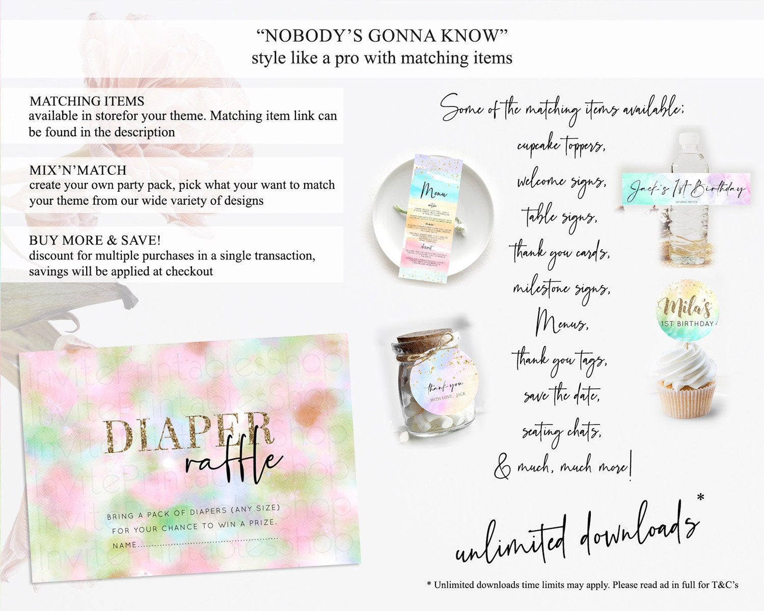 Pastel Diaper Raffle Card Pastel Rainbow Diaper Raffle Insert Colorful Ombre Watercolor Diaper Ticket Confetti Glitter Raffle Game D10698