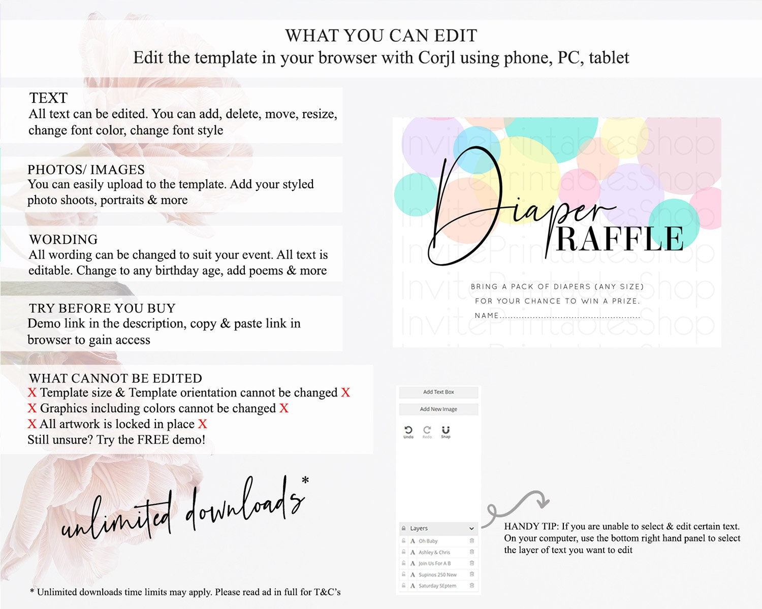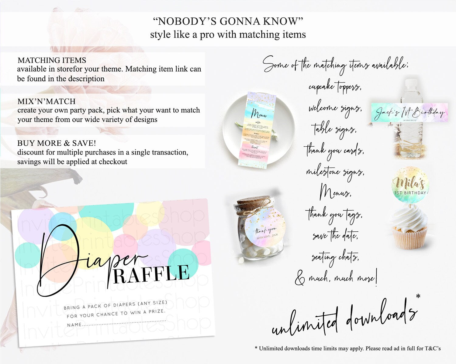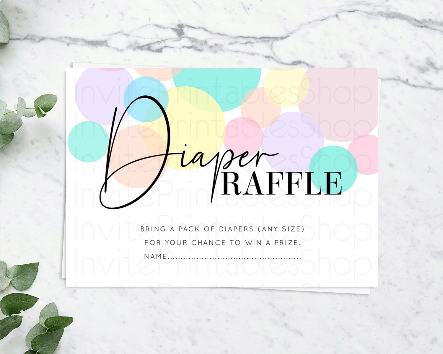 Pastel Diaper Raffle Card Pastel Rainbow Diaper Raffle Insert Colorful Ombre Watercolor Diaper Ticket Confetti Glitter Raffle Game D10784