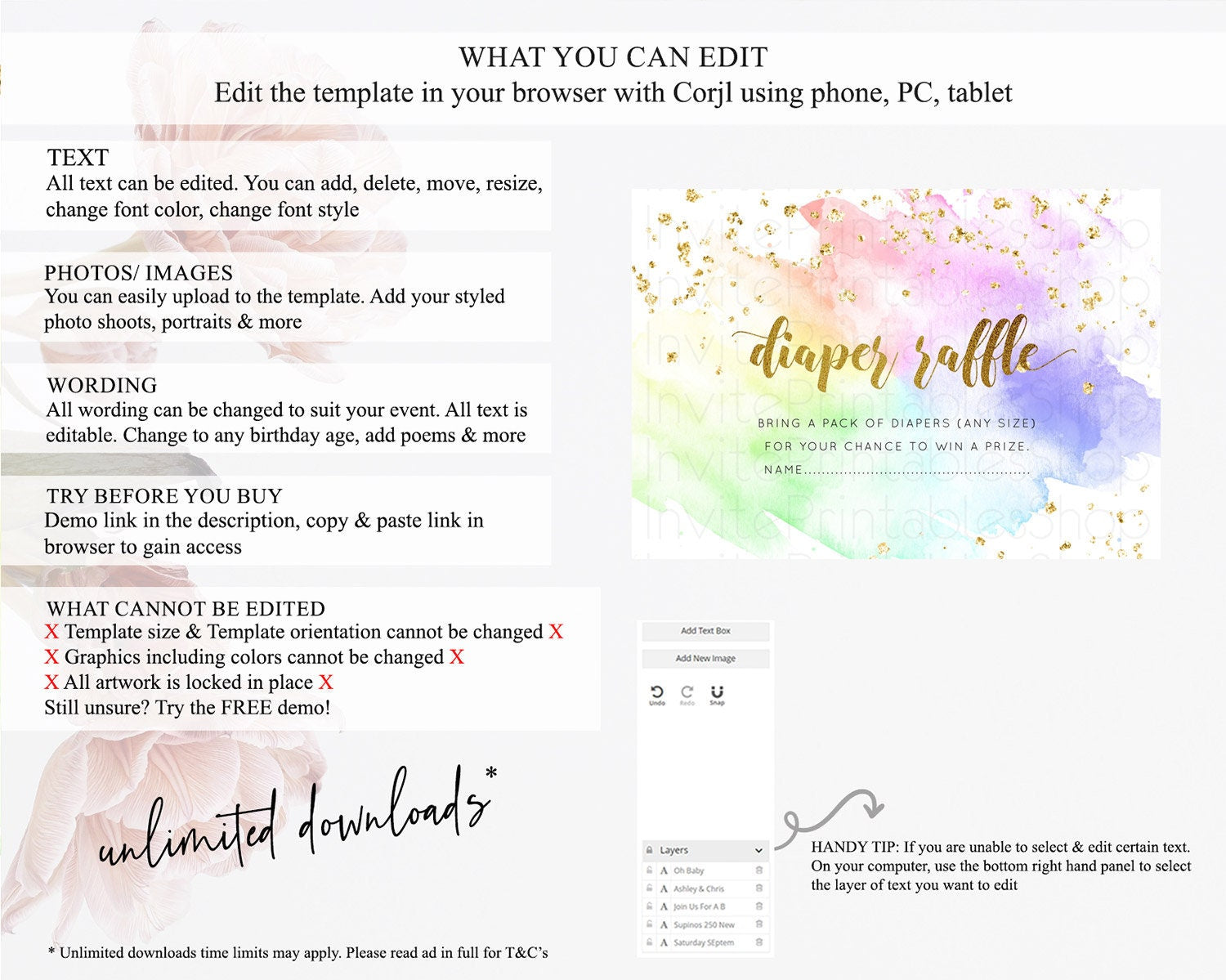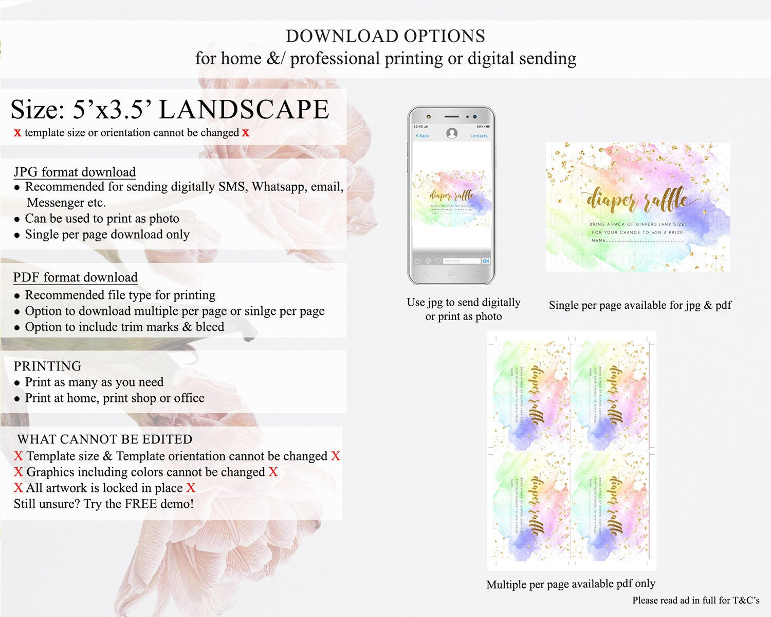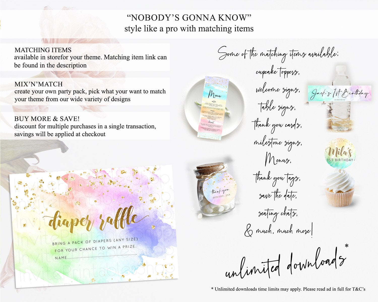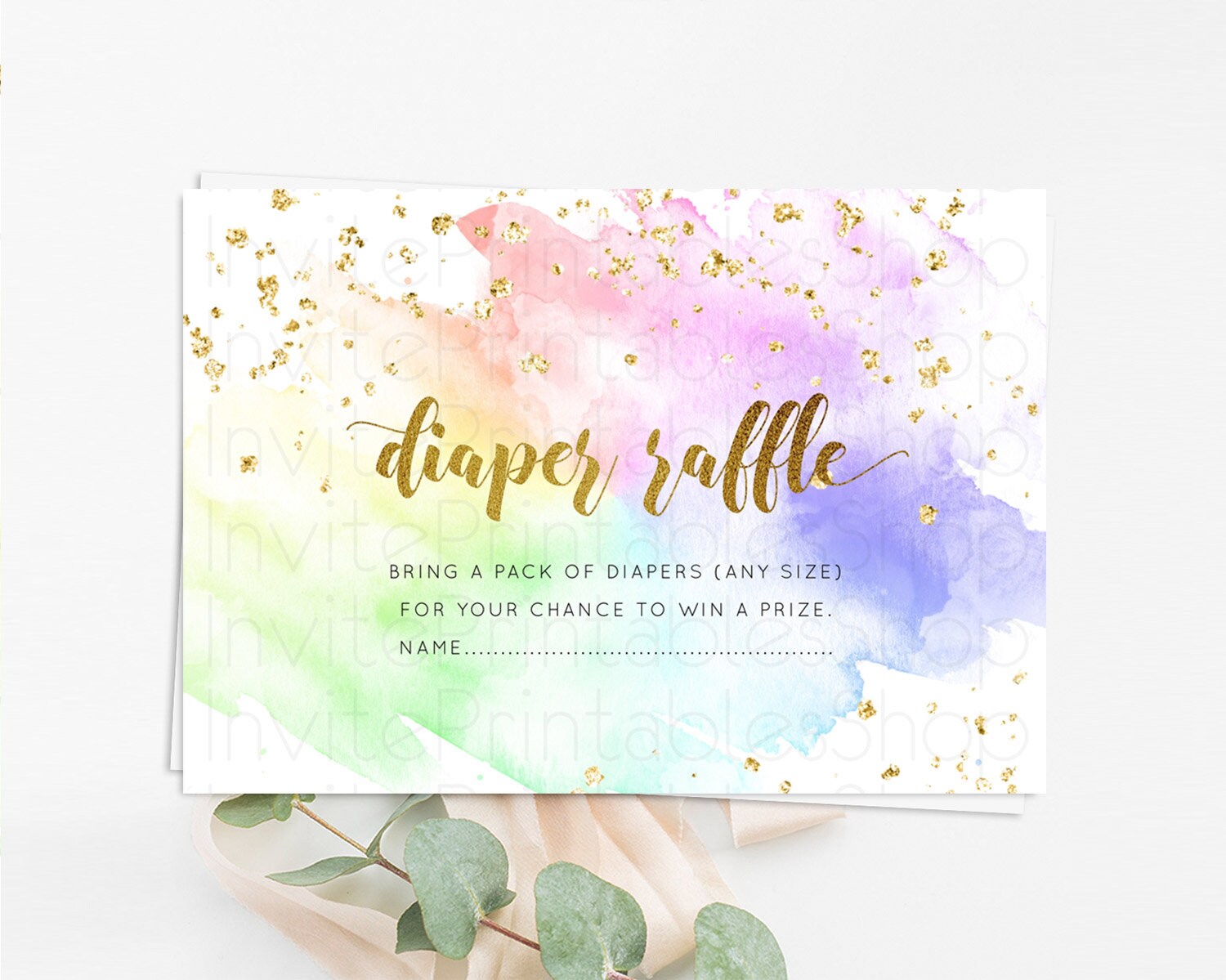 Pastel Diaper Raffle Card Pastel Rainbow Diaper Raffle Insert Colorful Ombre Watercolor Diaper Ticket Confetti Glitter Raffle Game D10876