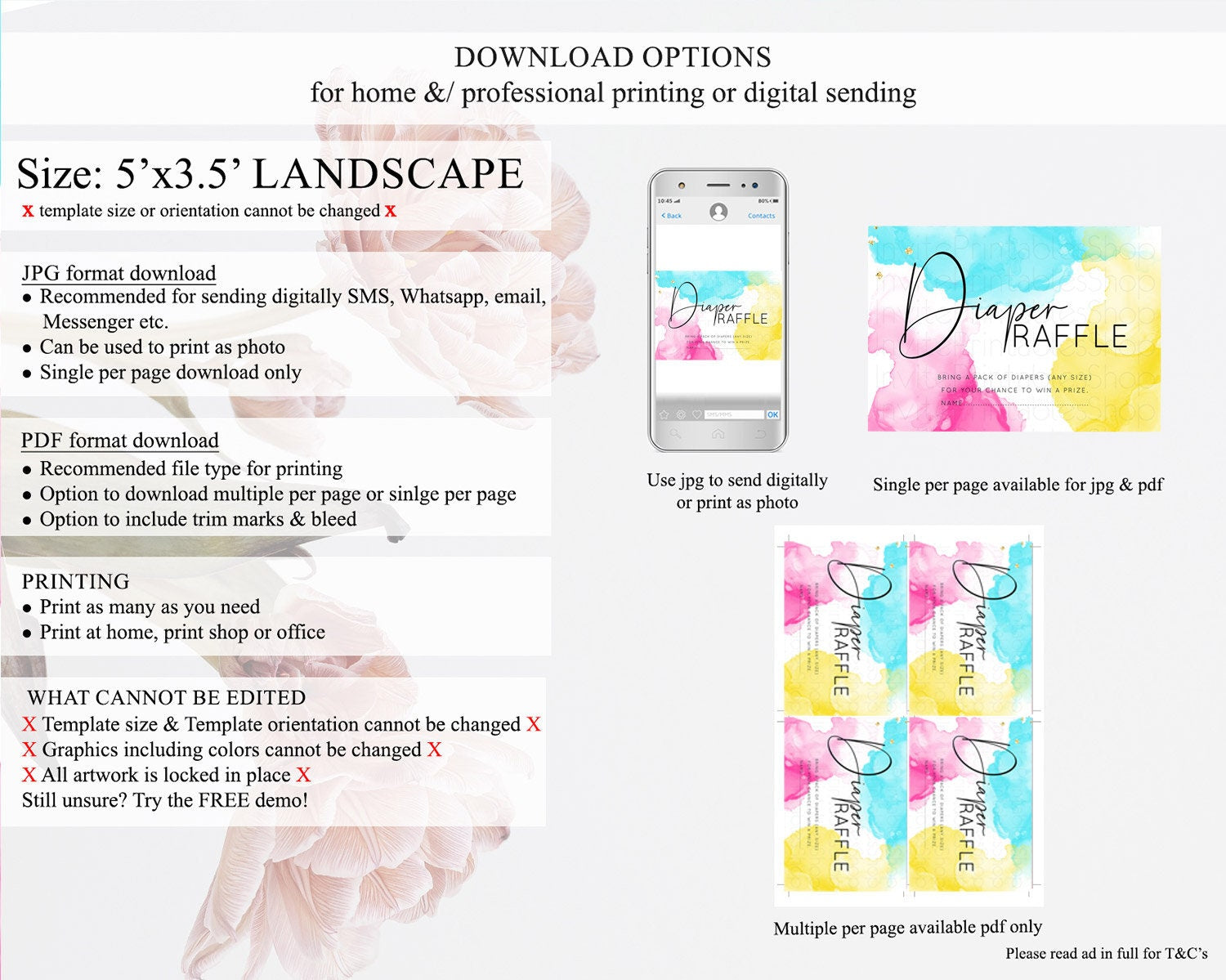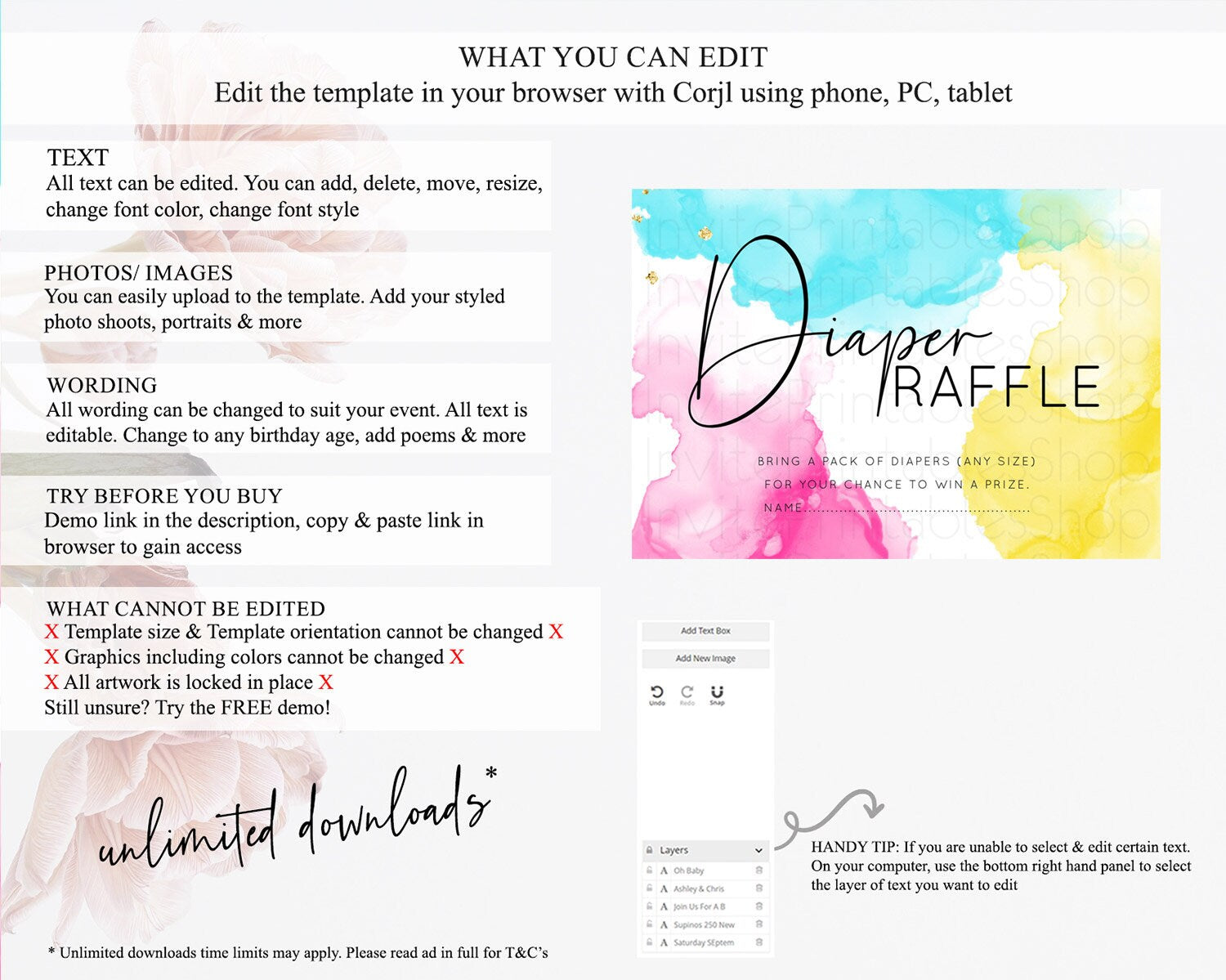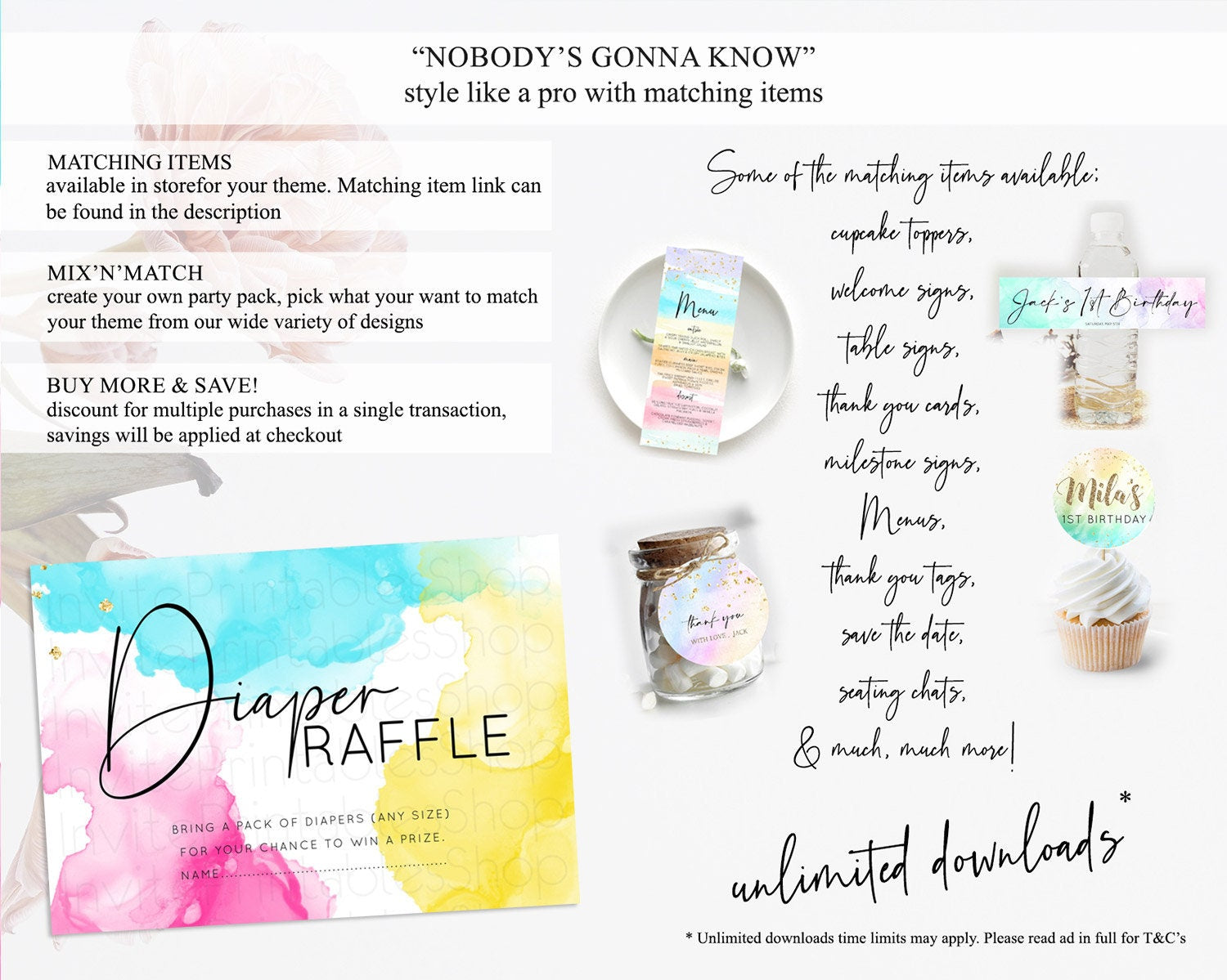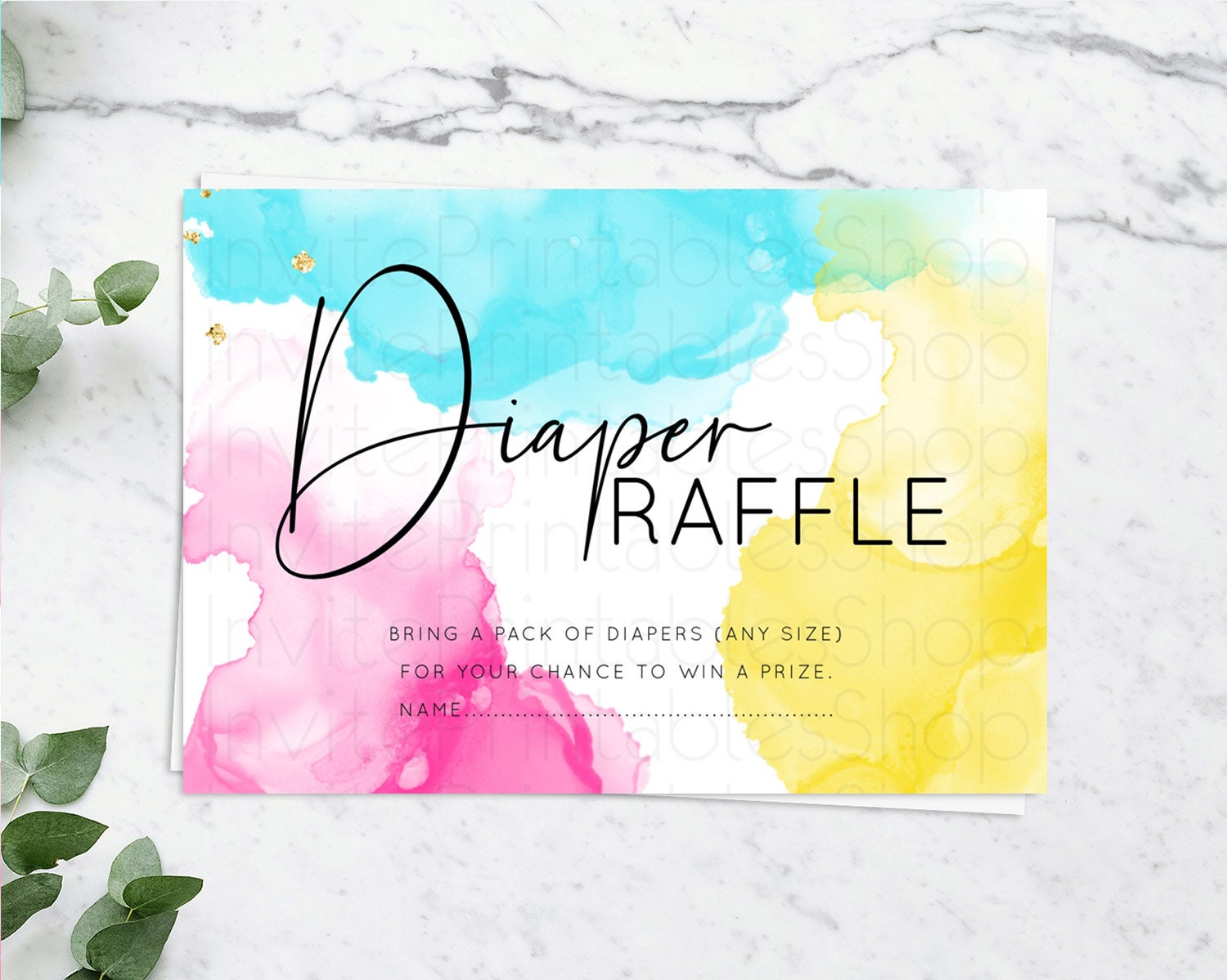 Pastel Diaper Raffle Card Pastel Rainbow Diaper Raffle Insert Colorful Ombre Watercolor Diaper Ticket Confetti Glitter Raffle Game D10898