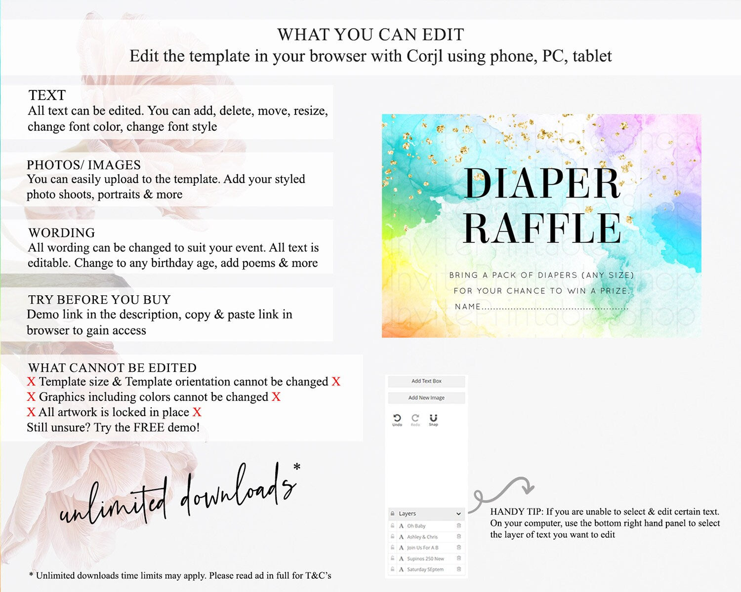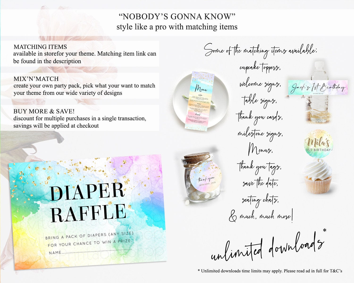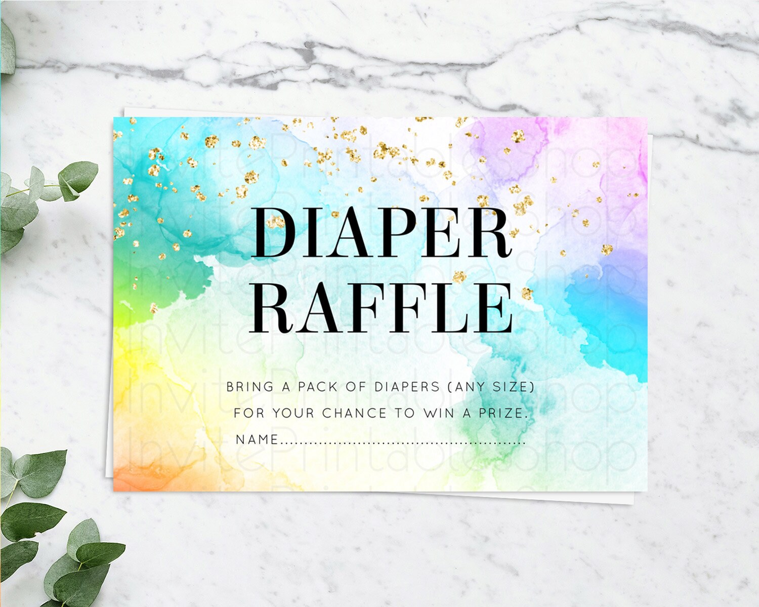 Pastel Diaper Raffle Card Pastel Rainbow Diaper Raffle Insert Colorful Ombre Watercolor Diaper Ticket Confetti Glitter Raffle Game D10961