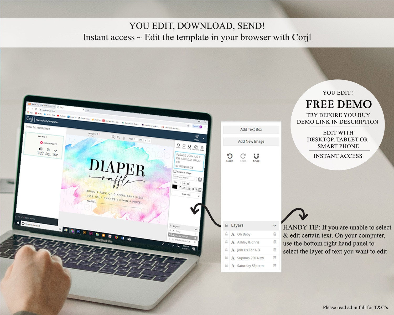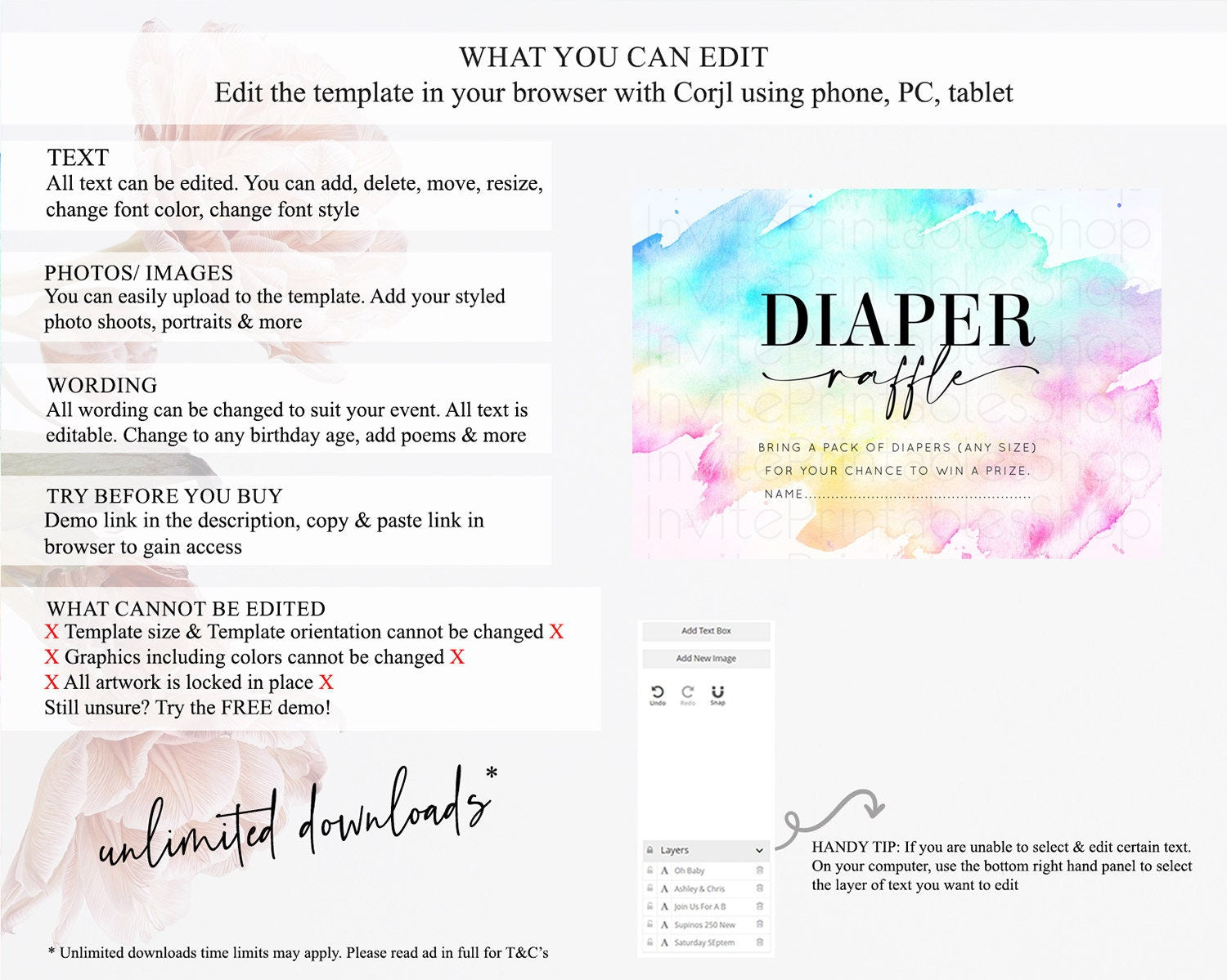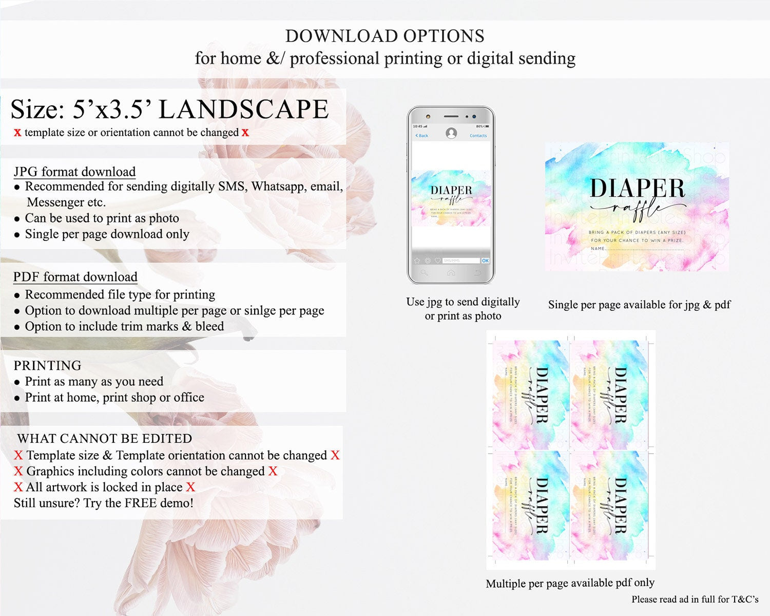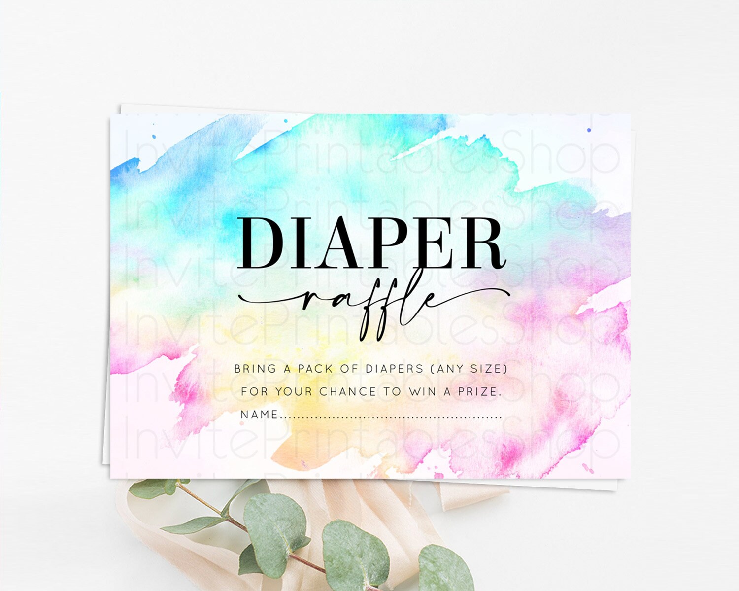 Pastel Diaper Raffle Card Pastel Rainbow Diaper Raffle Insert Colorful Ombre Watercolor Diaper Ticket Confetti Glitter Raffle Game D11020