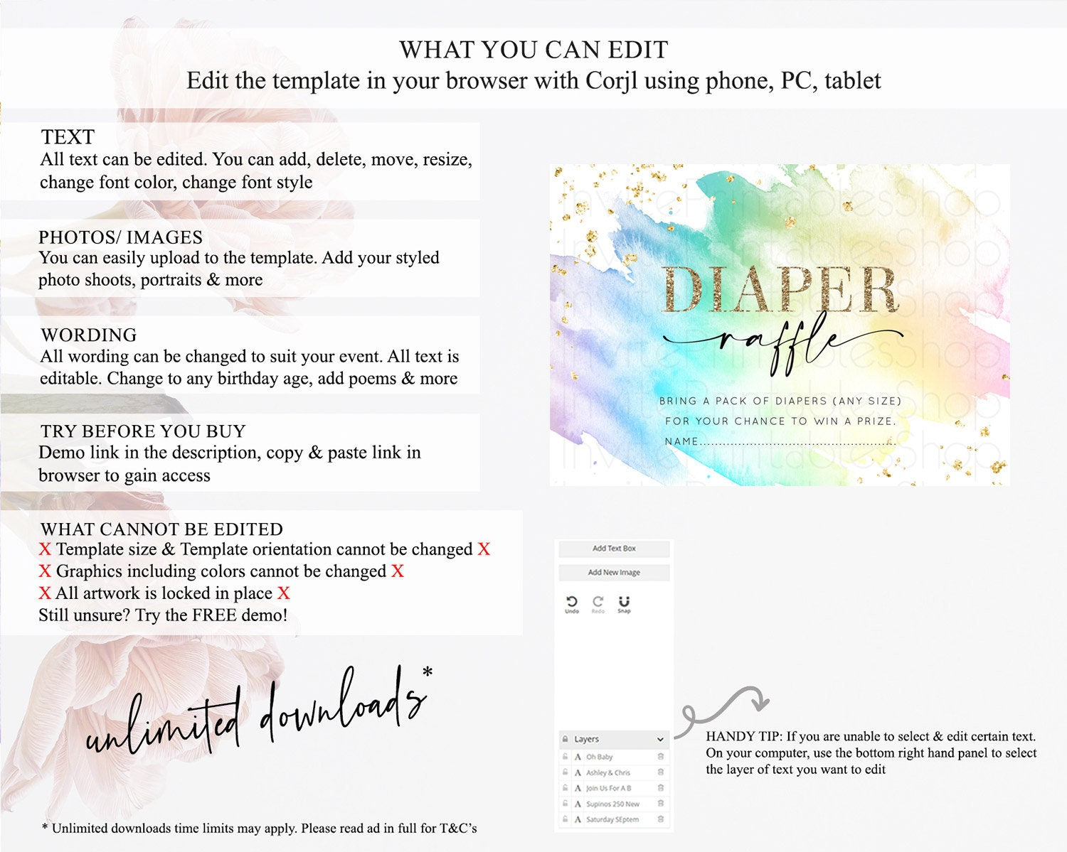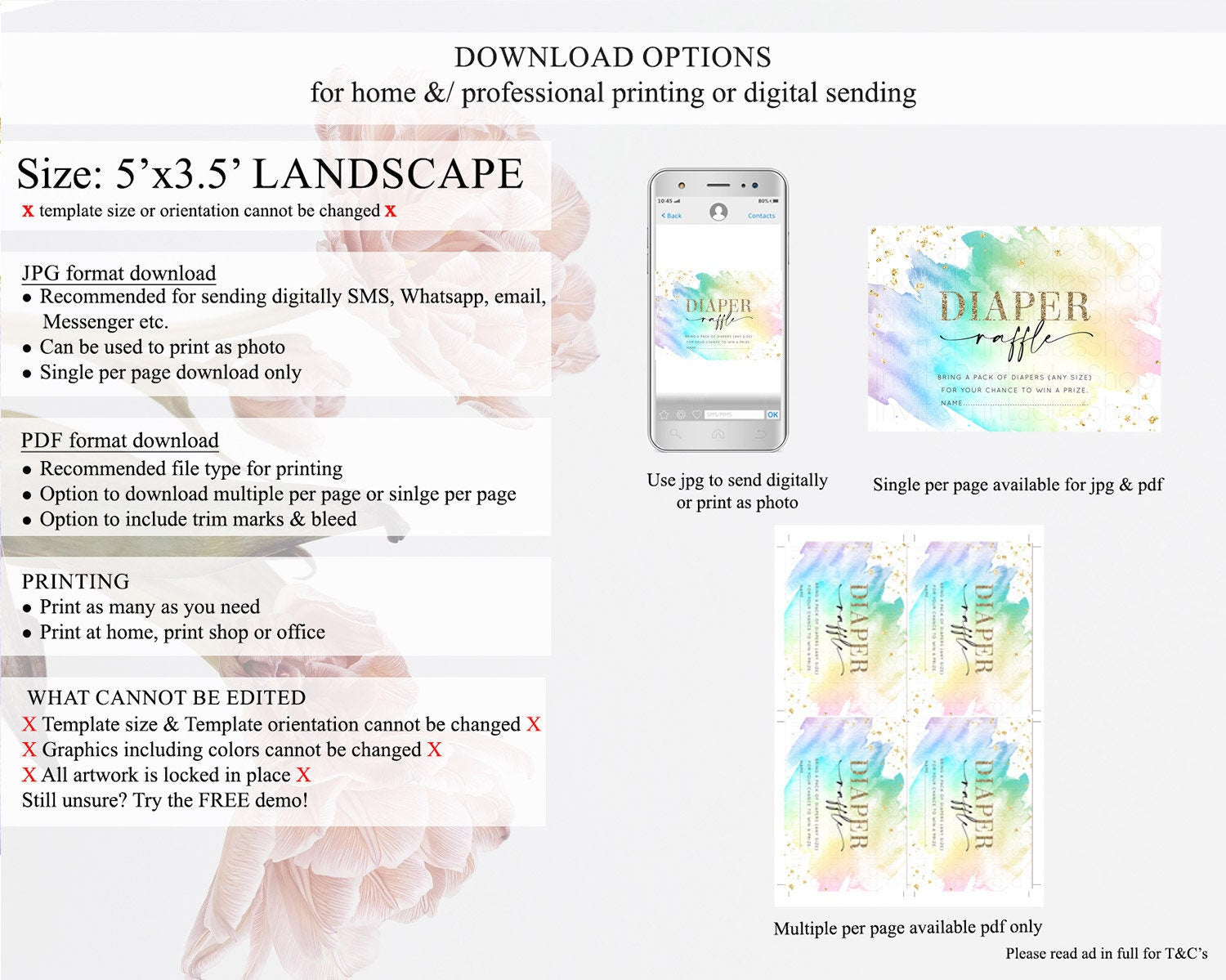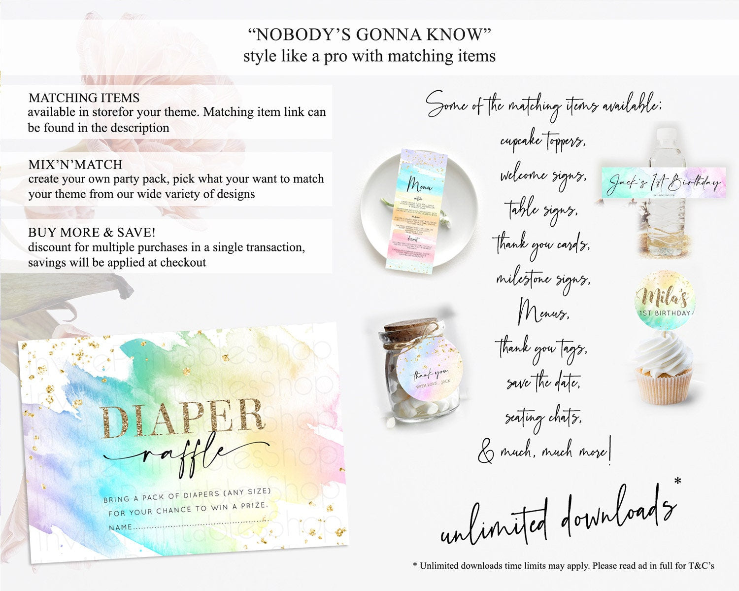 Pastel Diaper Raffle Card Pastel Rainbow Diaper Raffle Insert Colorful Ombre Watercolor Diaper Ticket Confetti Glitter Raffle Game D11028