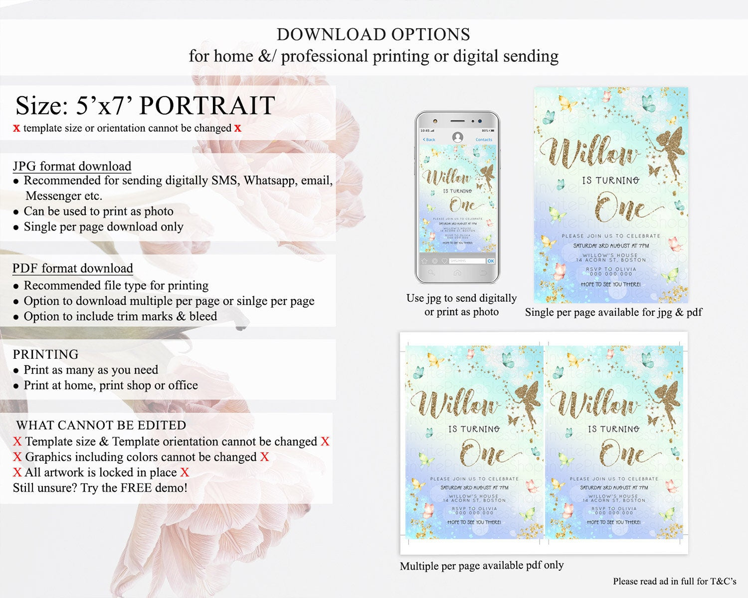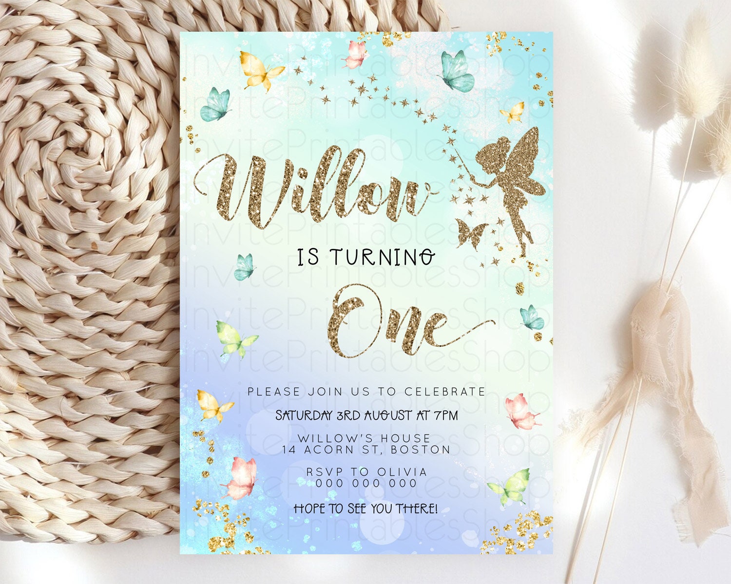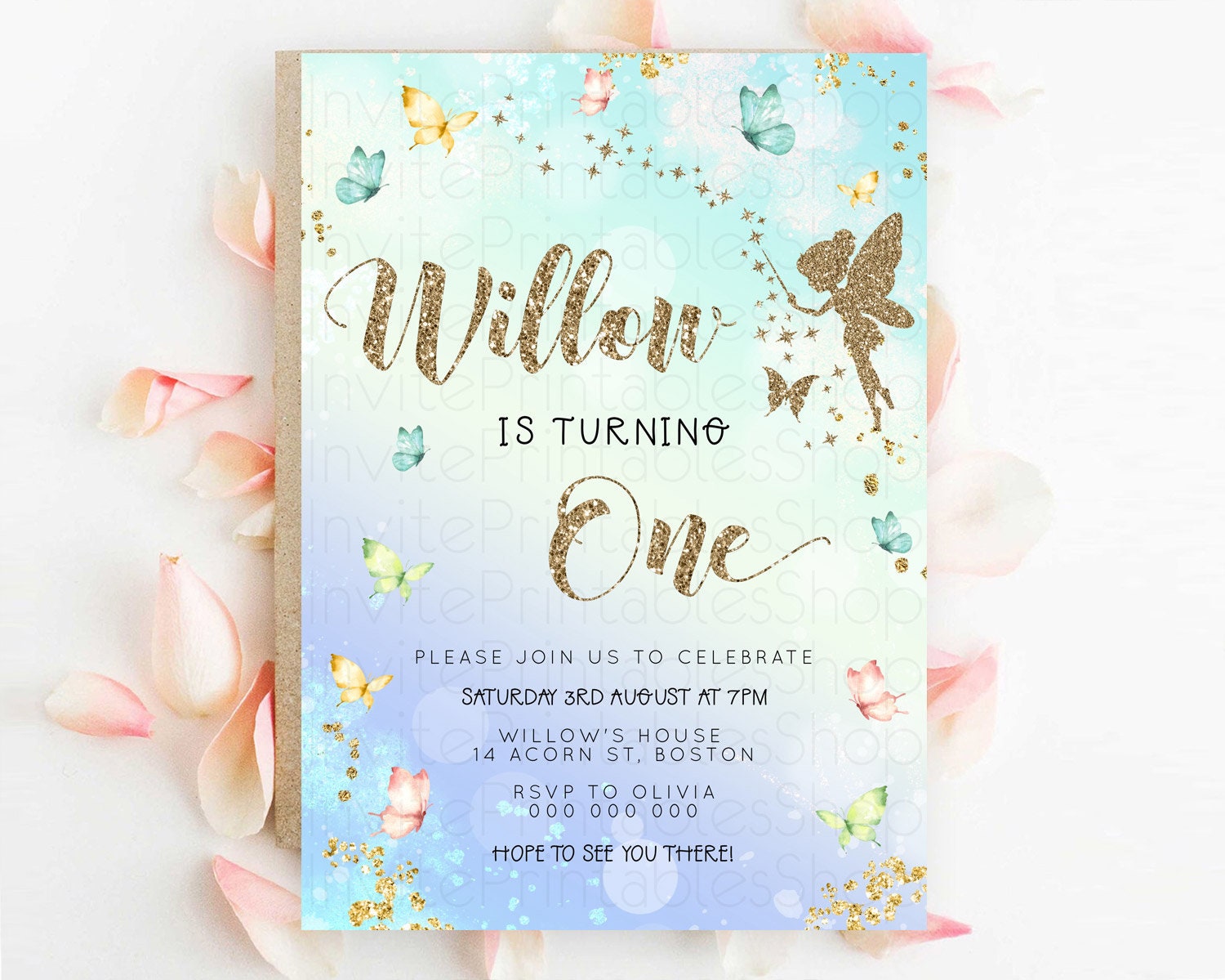 Pastel Fairy Birthday Invitation Pastel Butterflies Fairy Birthday Invitation Rainbow Ombre Watercolor 1st 2nd Birthday Invitation D23153