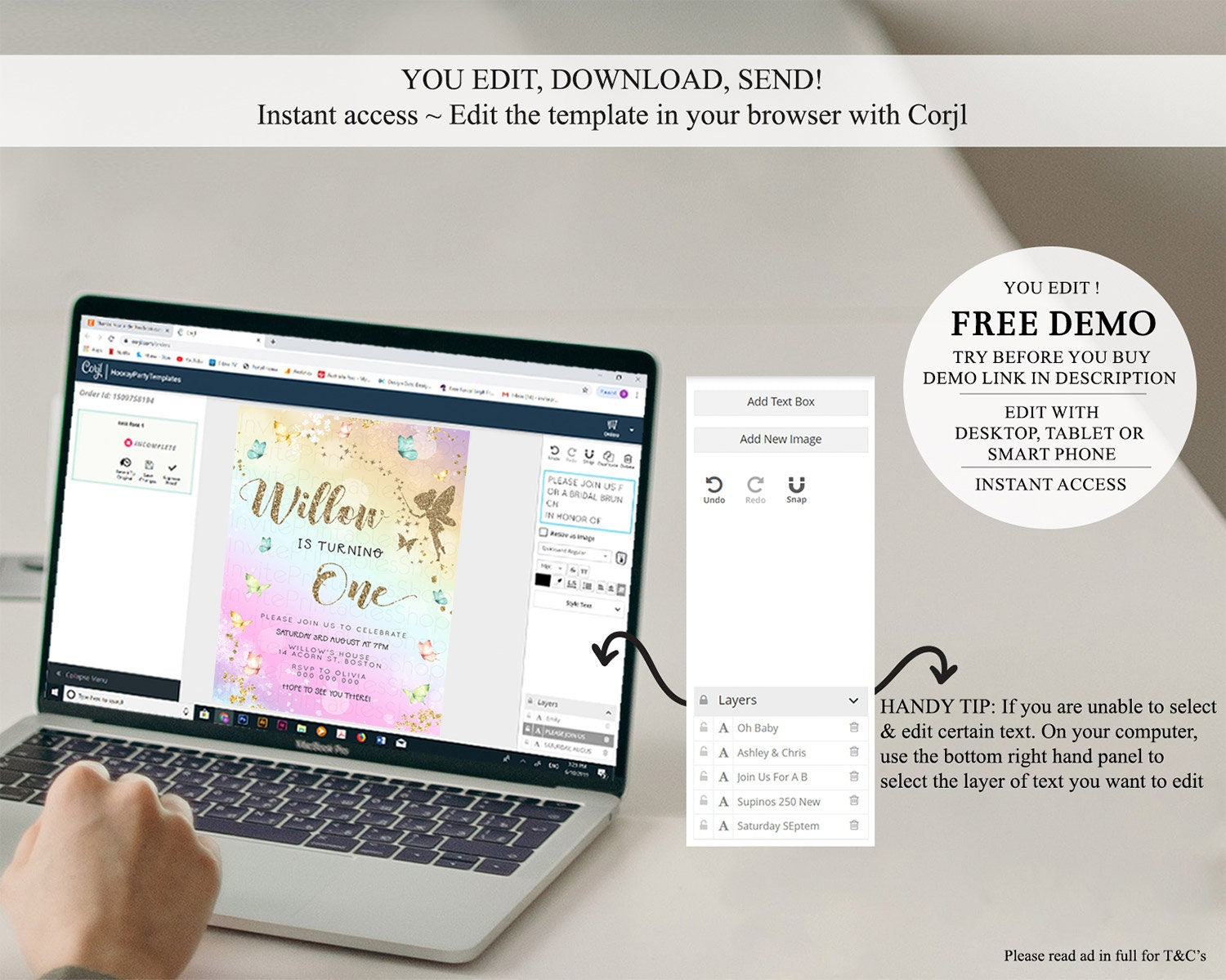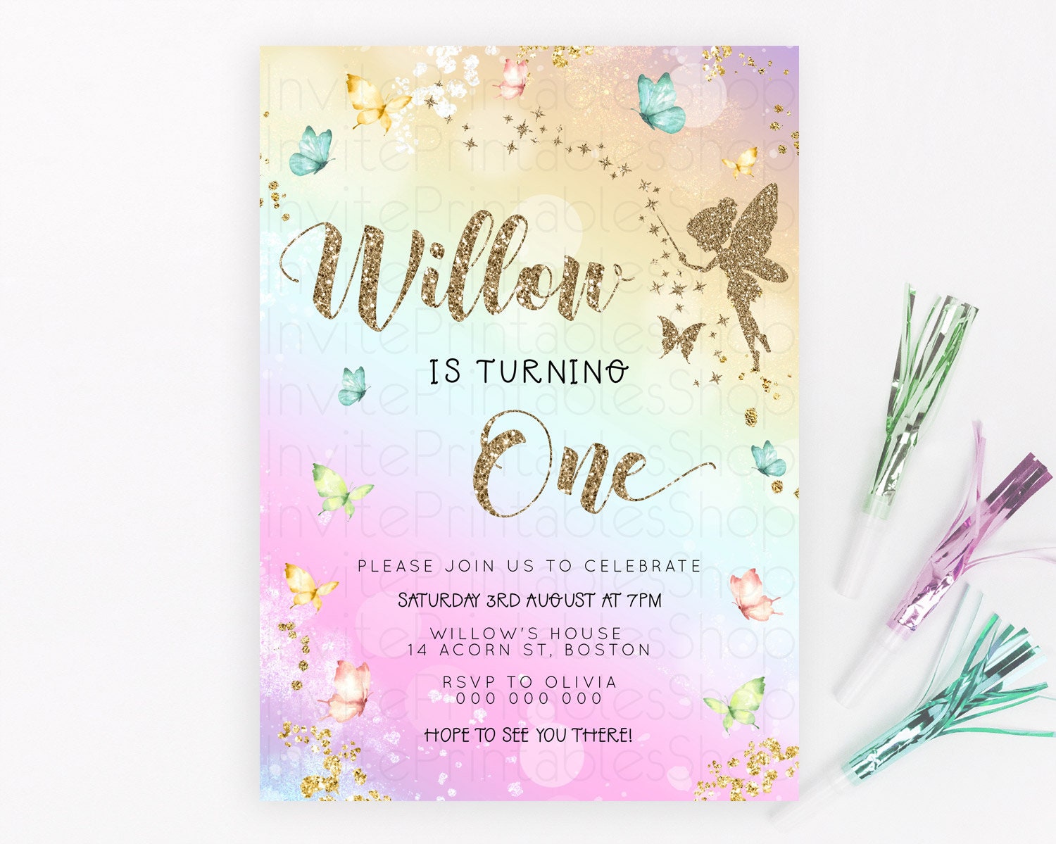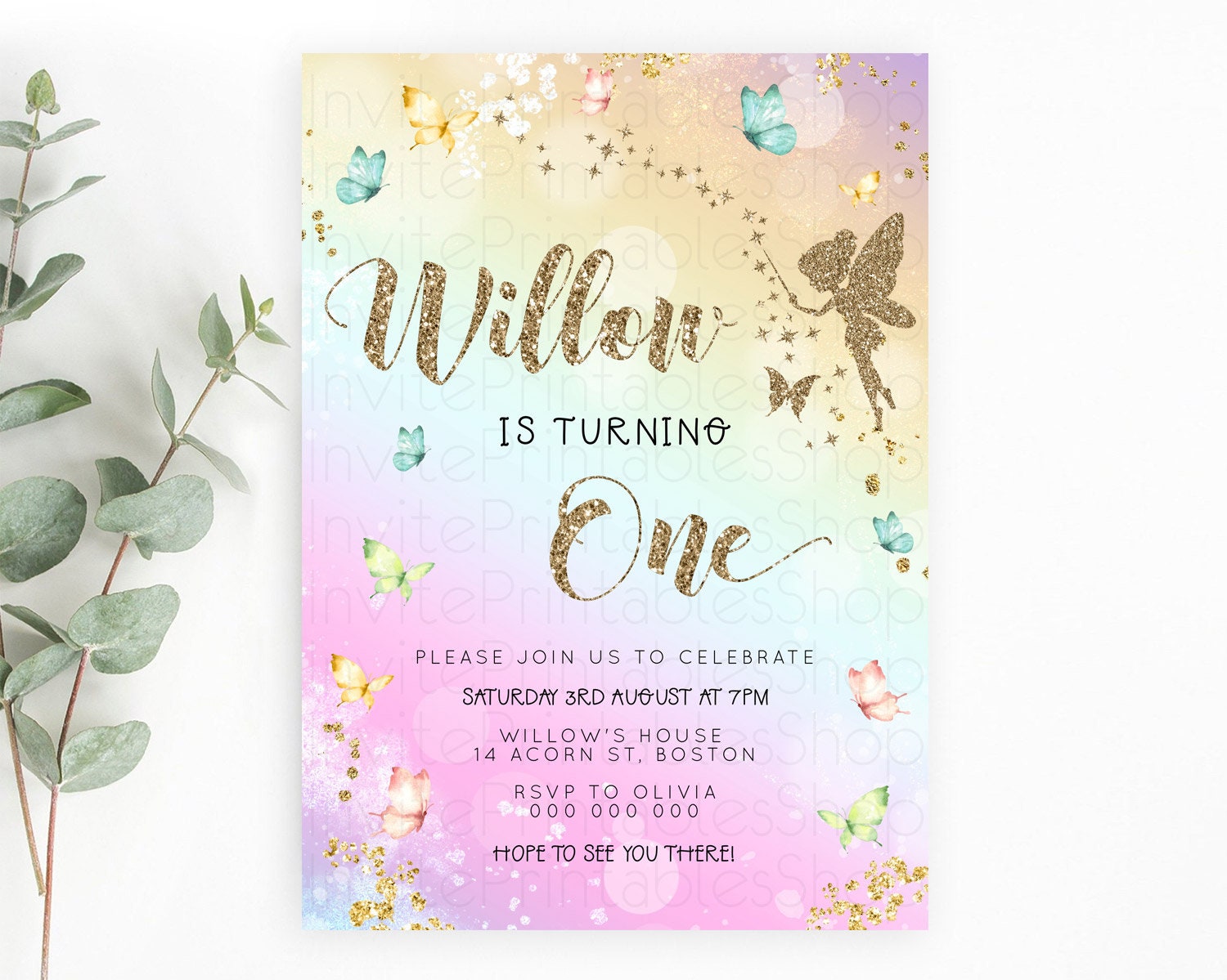 Pastel Fairy Birthday Invitation Pastel Butterflies Fairy Birthday Invitation Rainbow Ombre Watercolor 1st 2nd Birthday Invitation D23156