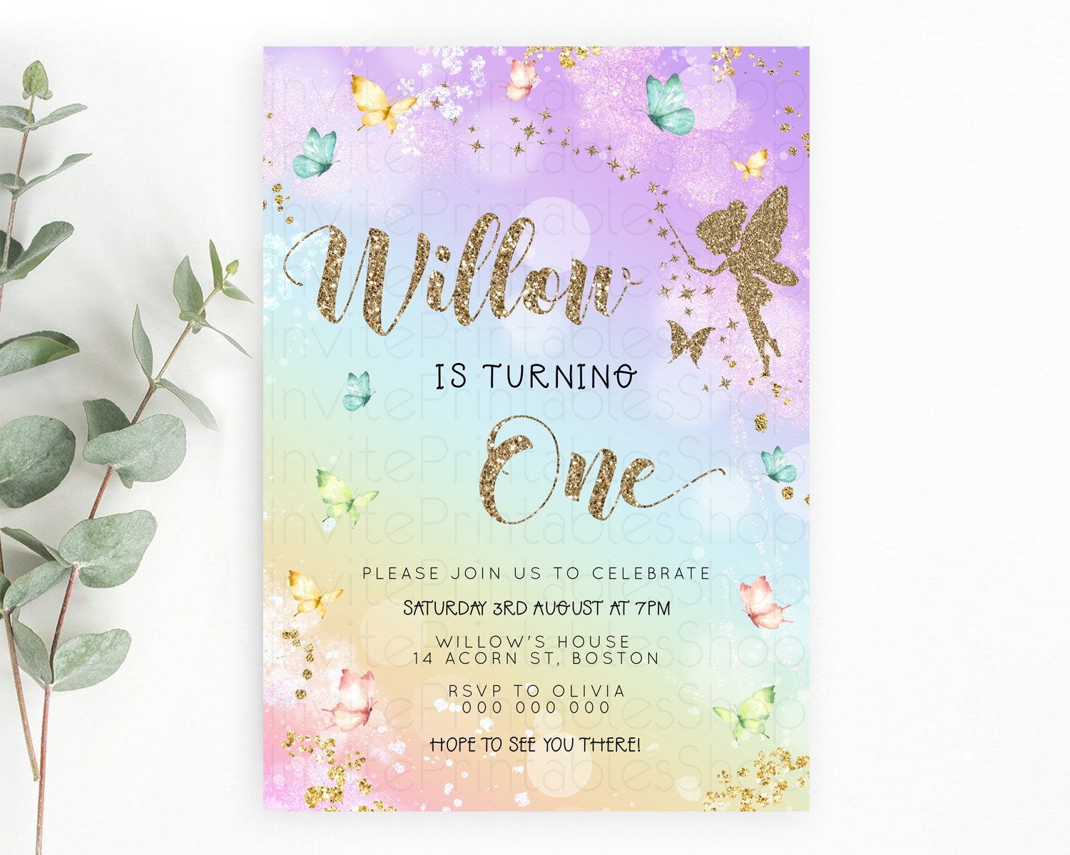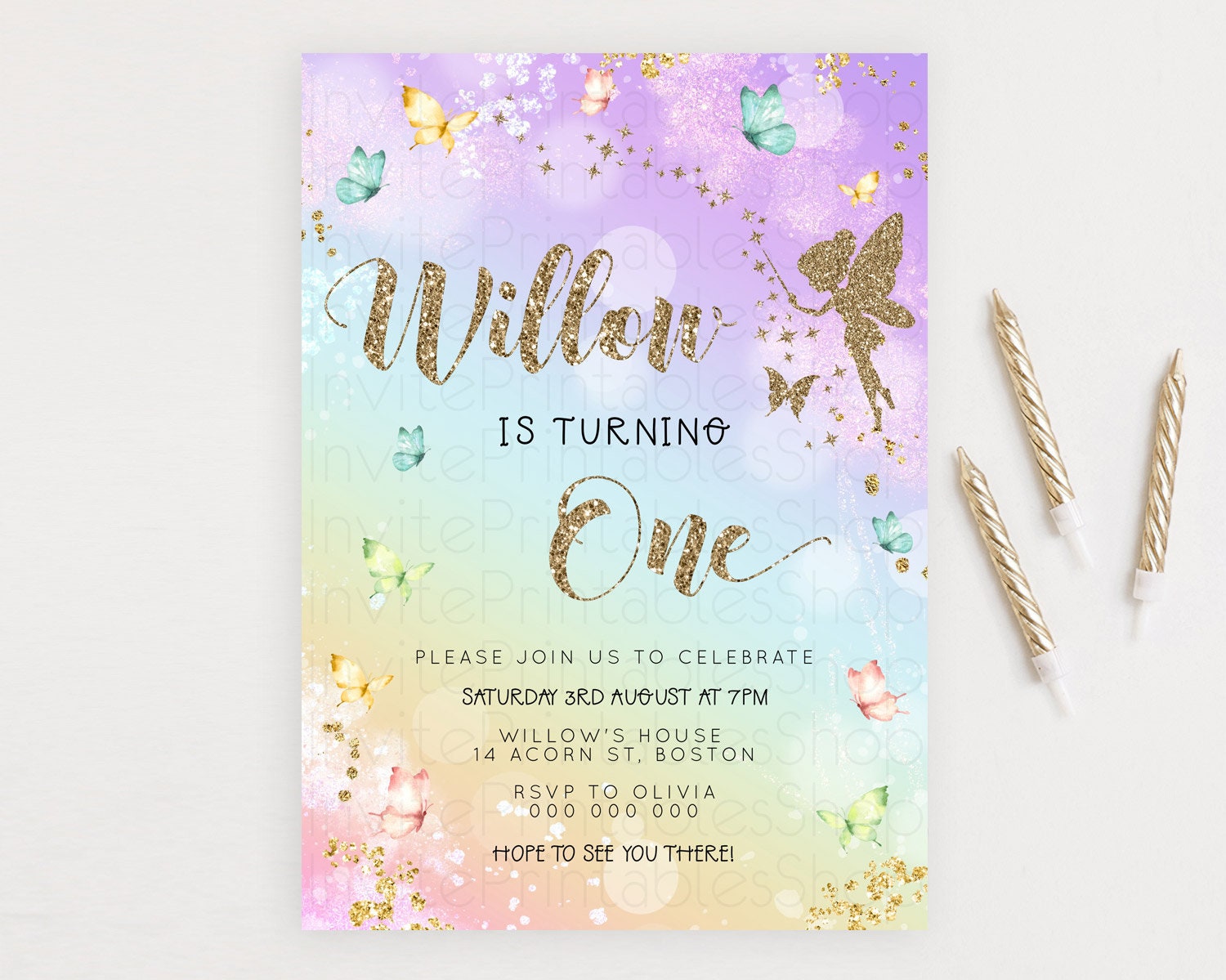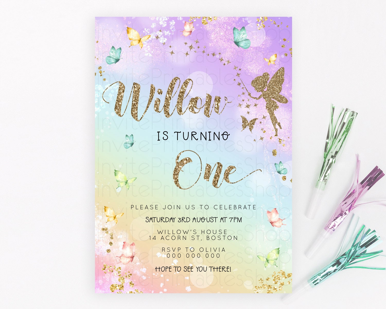 Pastel Fairy Birthday Invitation Pastel Butterflies Fairy Birthday Invitation Rainbow Ombre Watercolor 1st 2nd Birthday Invitation D23161