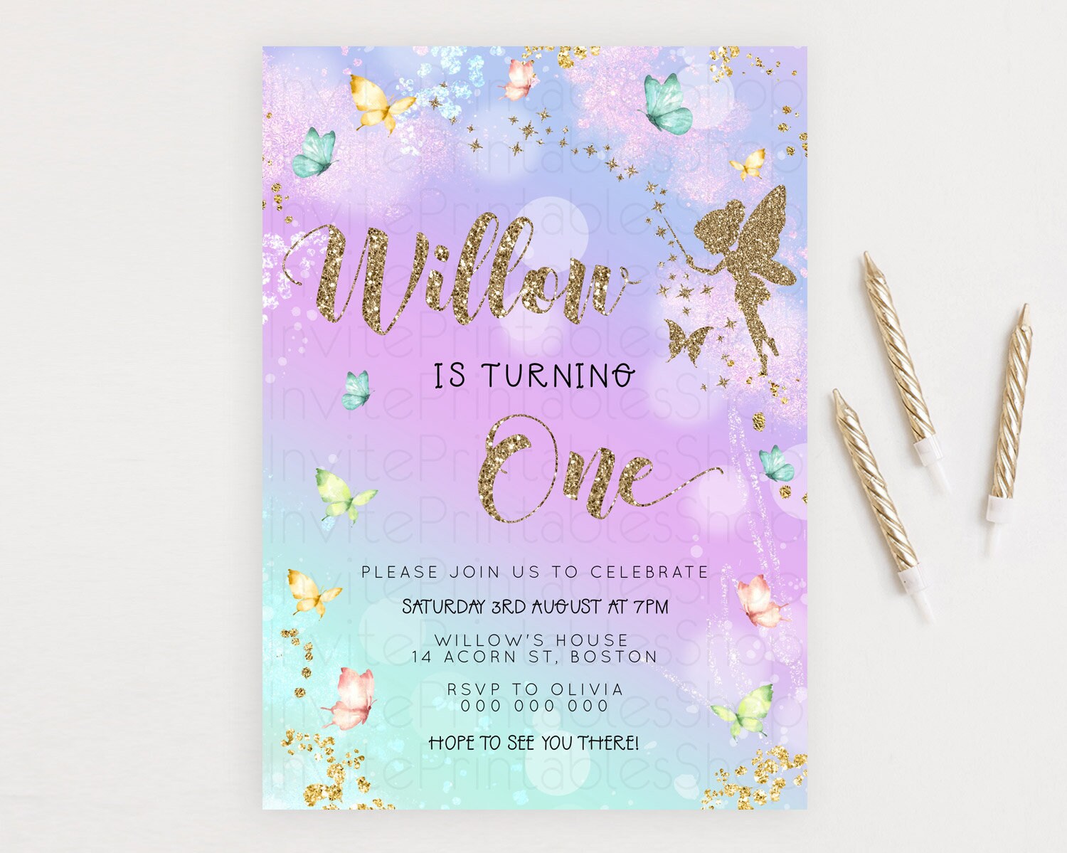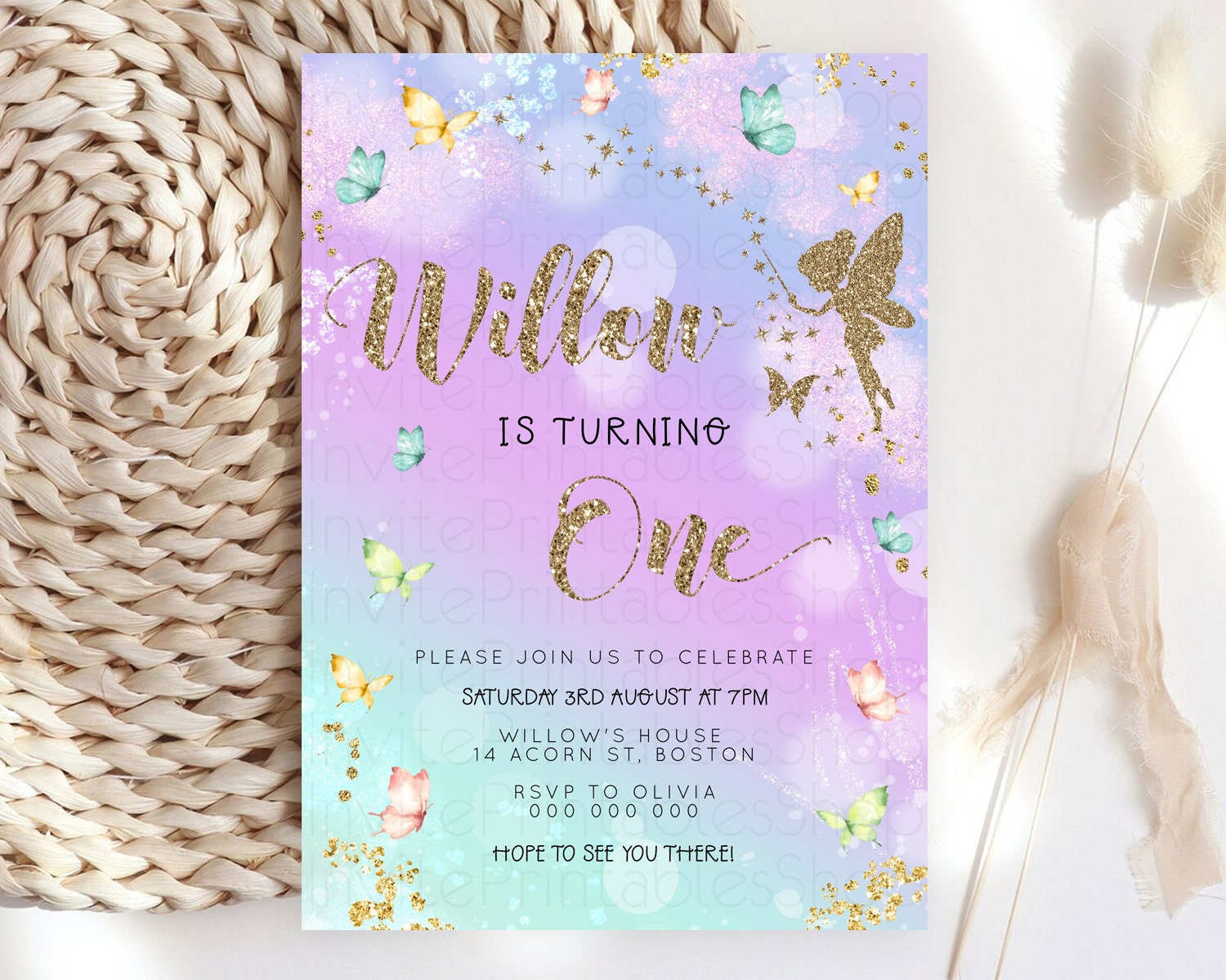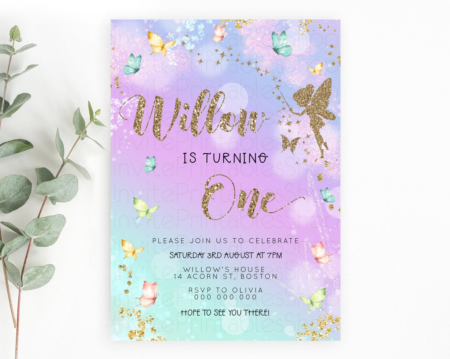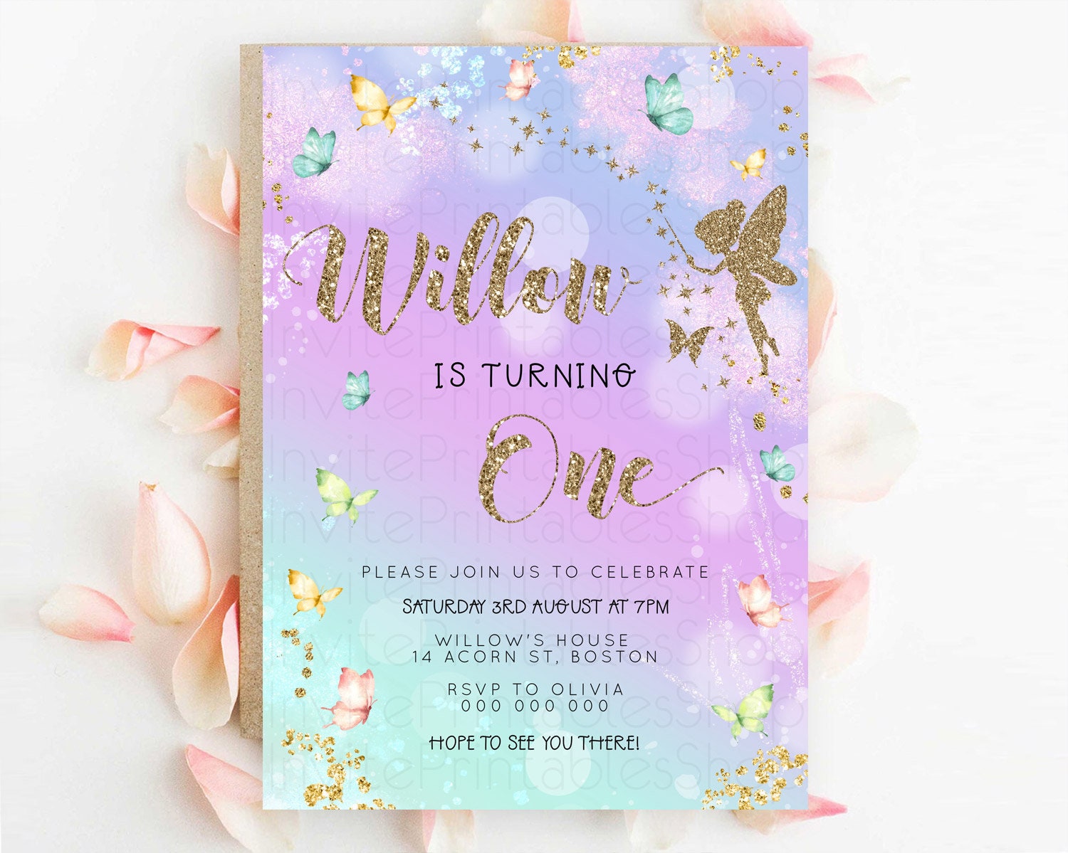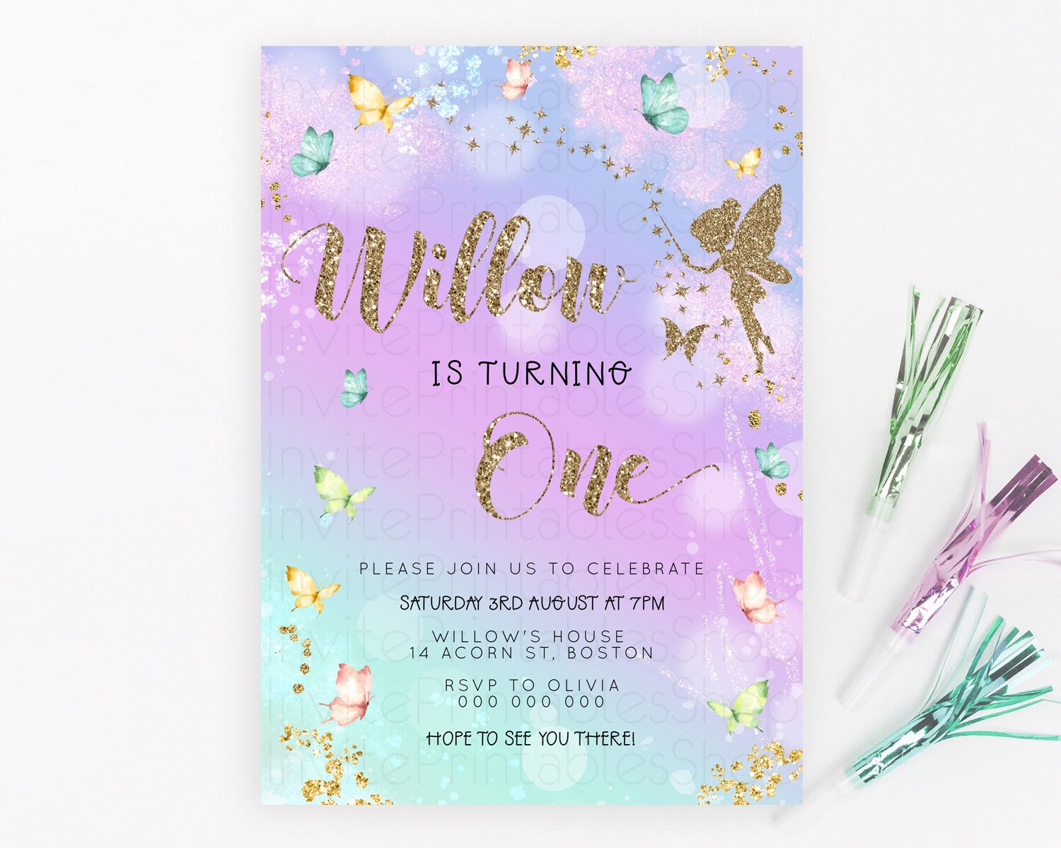 Pastel Fairy Birthday Invitation Pastel Butterflies Fairy Birthday Invitation Rainbow Ombre Watercolor 1st 2nd Birthday Invitation D23163