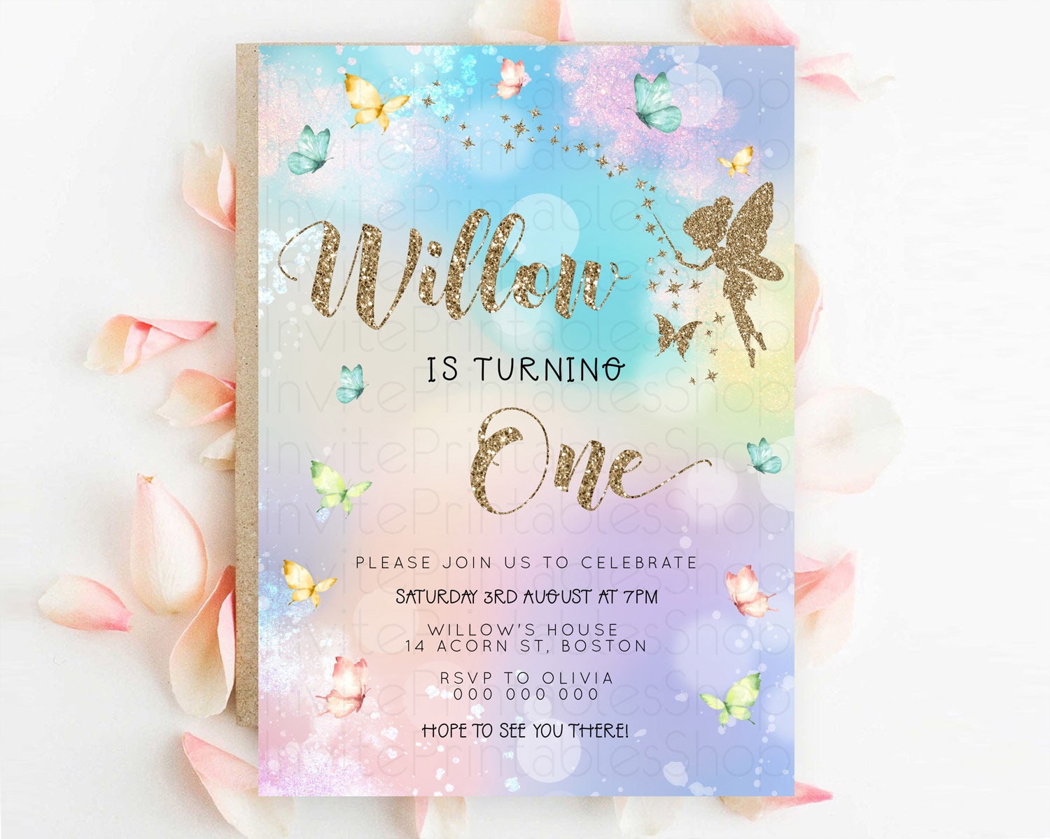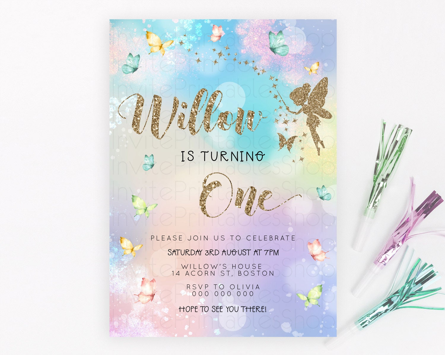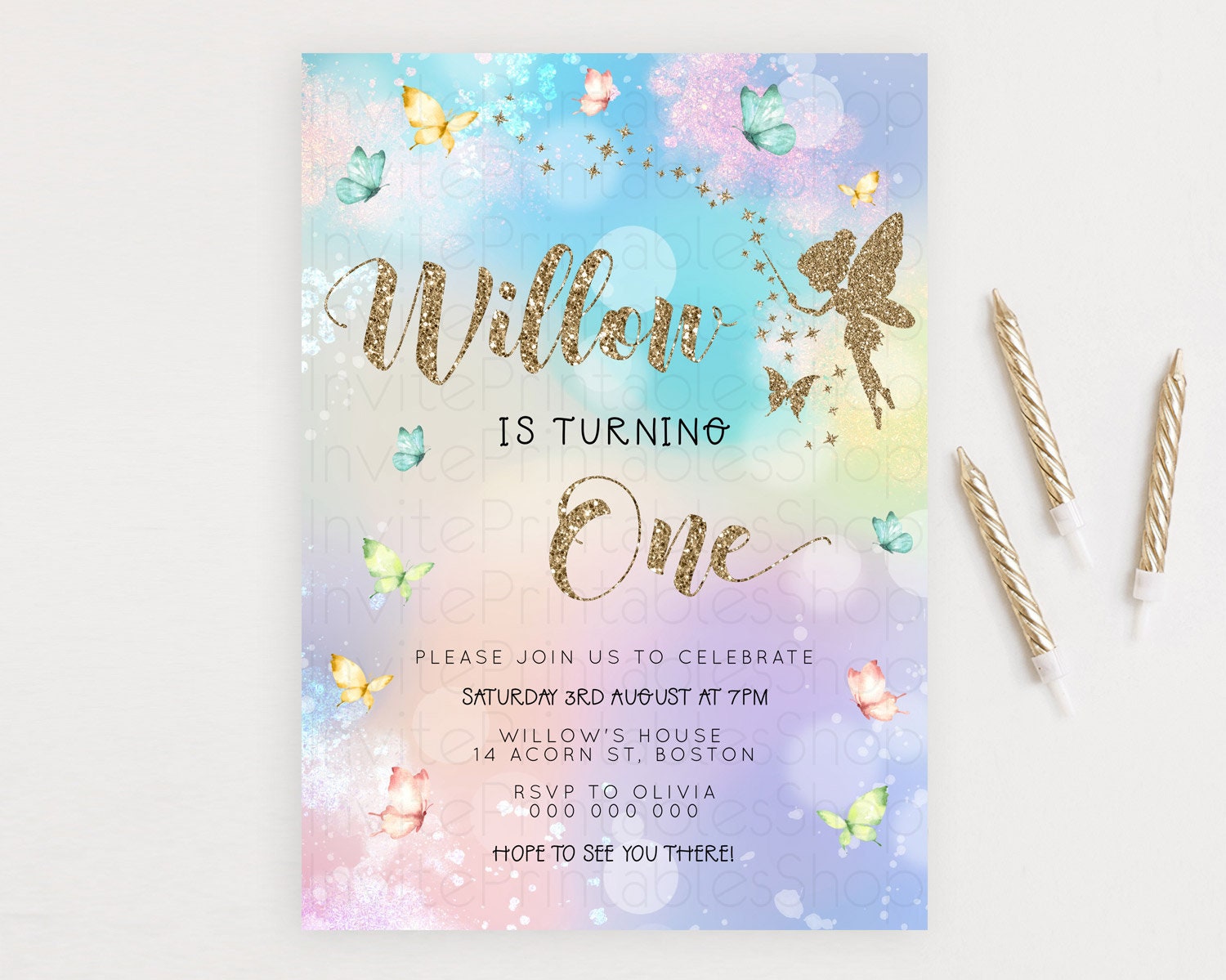 Pastel Fairy Birthday Invitation Pastel Butterflies Fairy Birthday Invitation Rainbow Ombre Watercolor 1st 2nd Birthday Invitation D23165