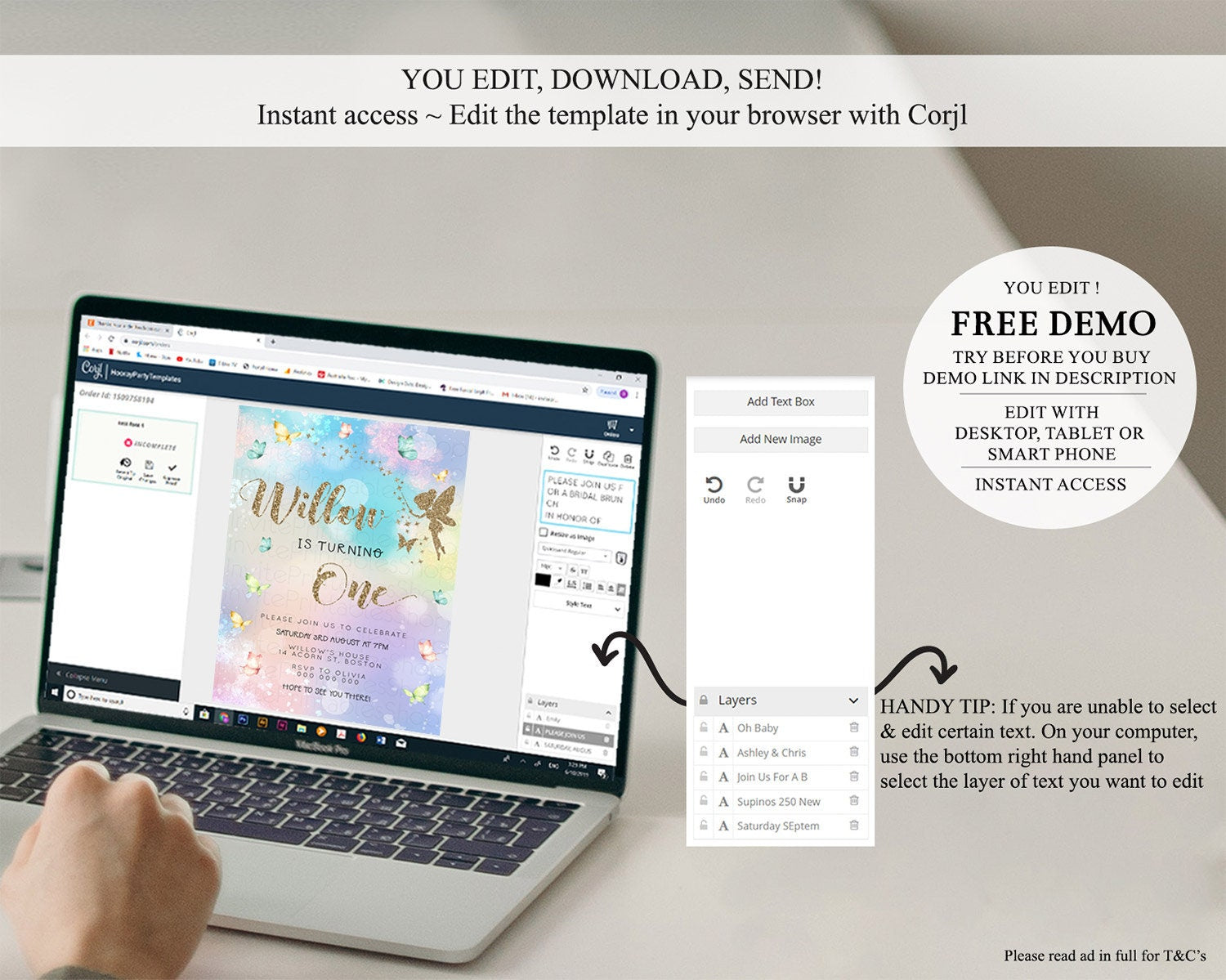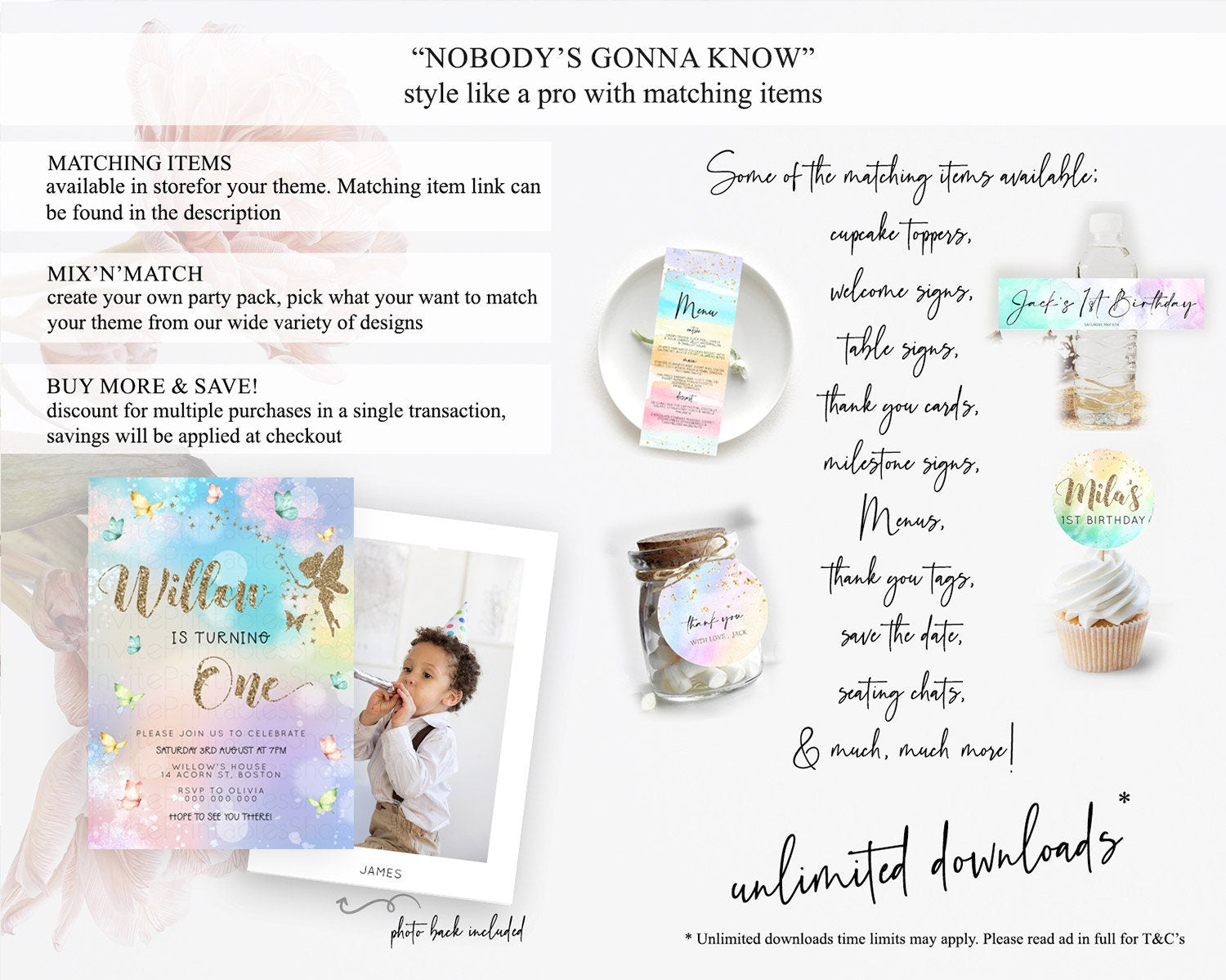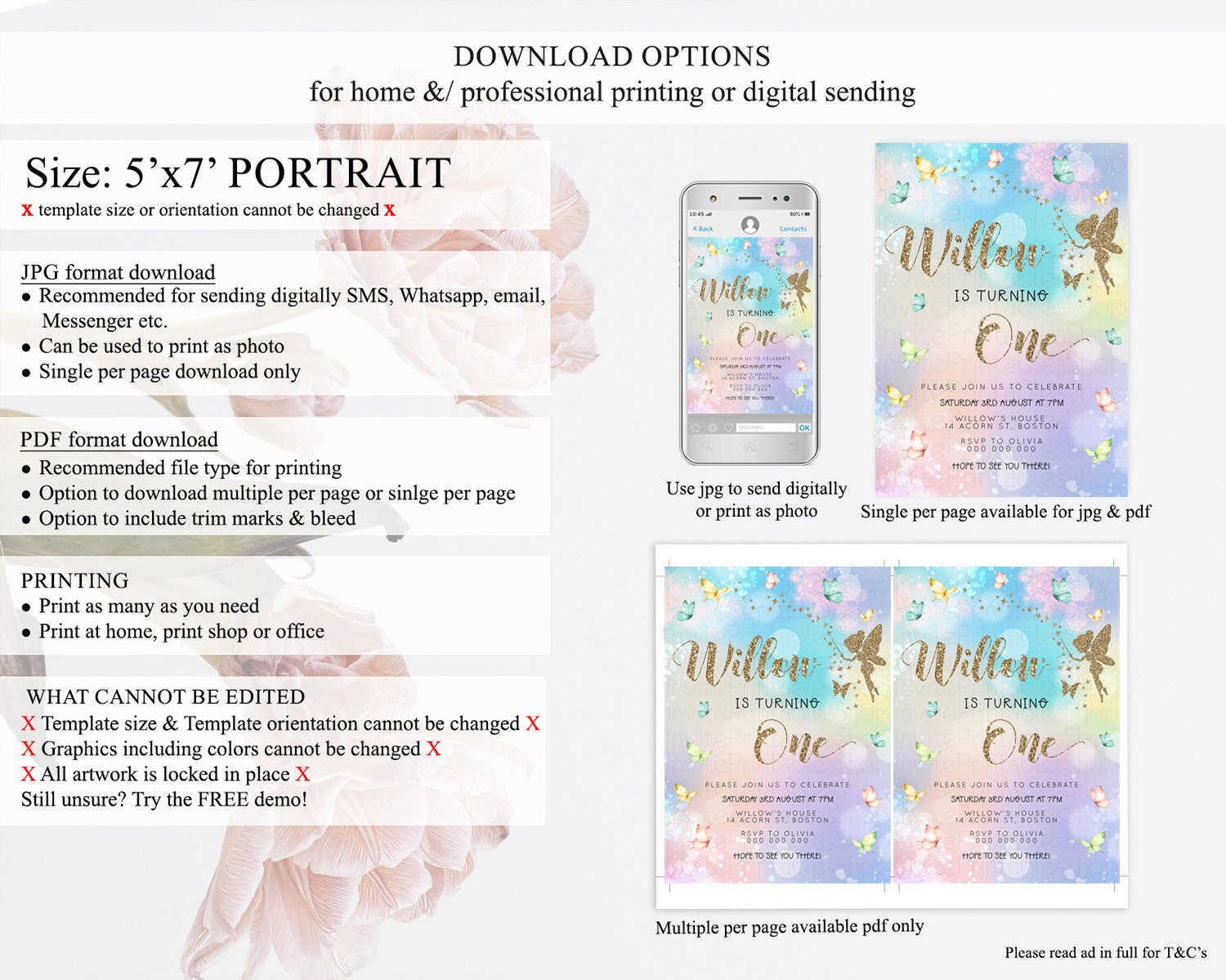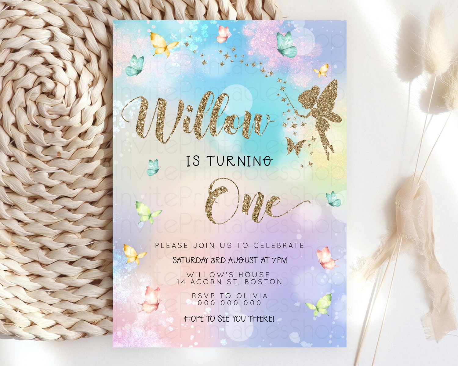 Pastel Fairy Birthday Invitation Pastel Butterflies Fairy Birthday Invitation Rainbow Ombre Watercolor 1st 2nd Birthday Invitation D23165