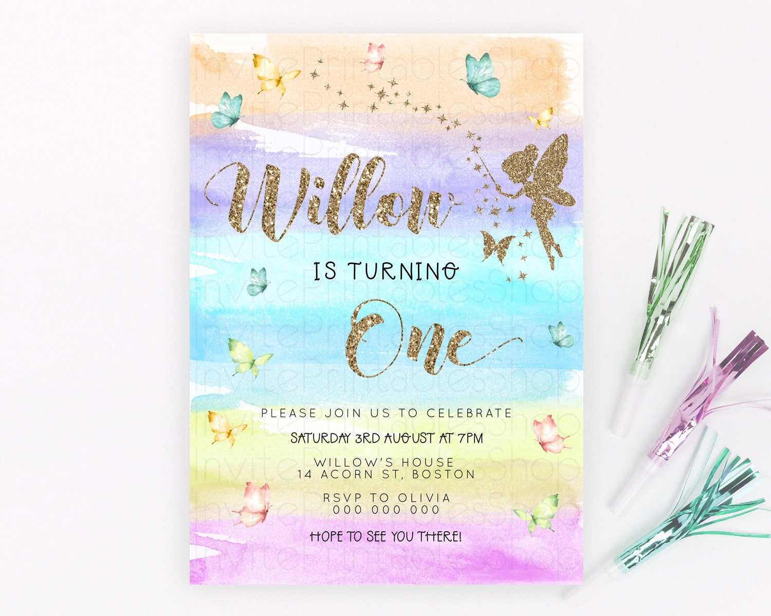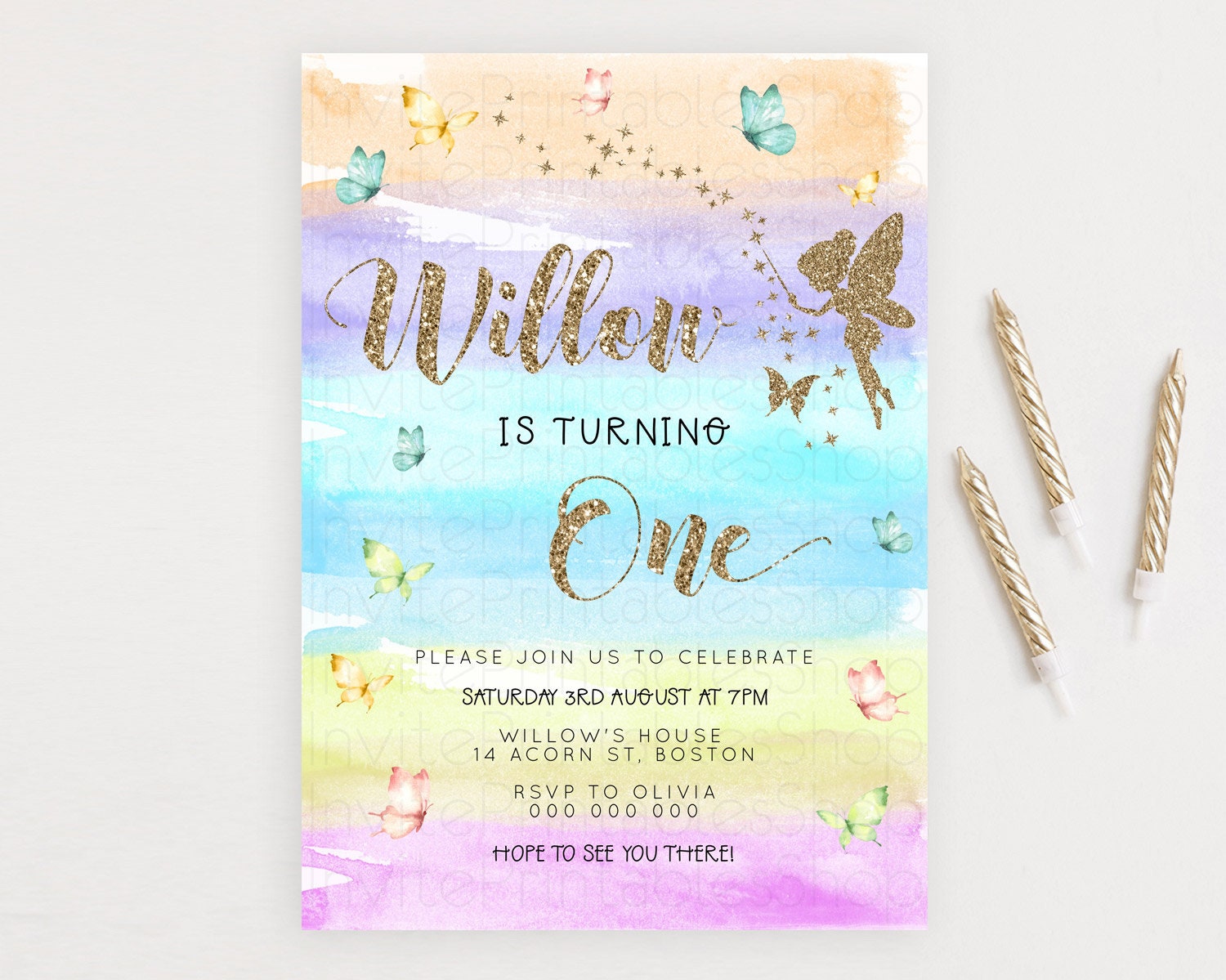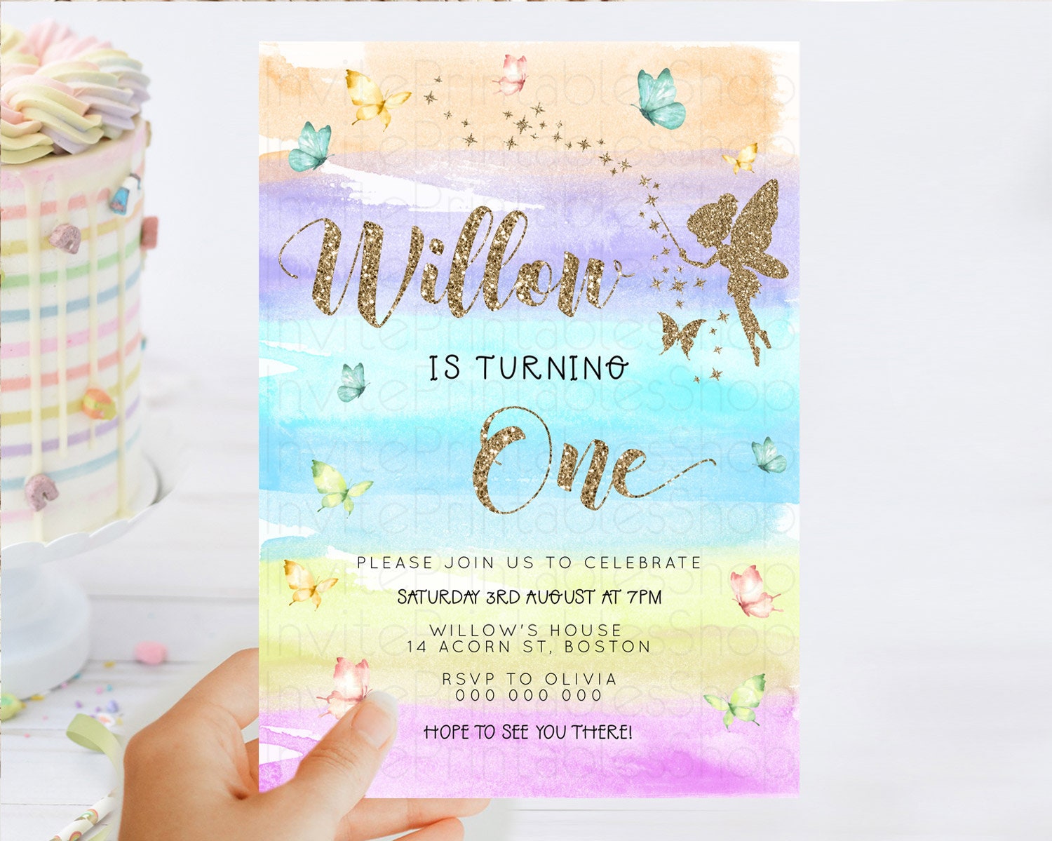 Pastel Fairy Birthday Invitation Pastel Butterflies Fairy Birthday Invitation Rainbow Ombre Watercolor 1st 2nd Birthday Invitation D23318