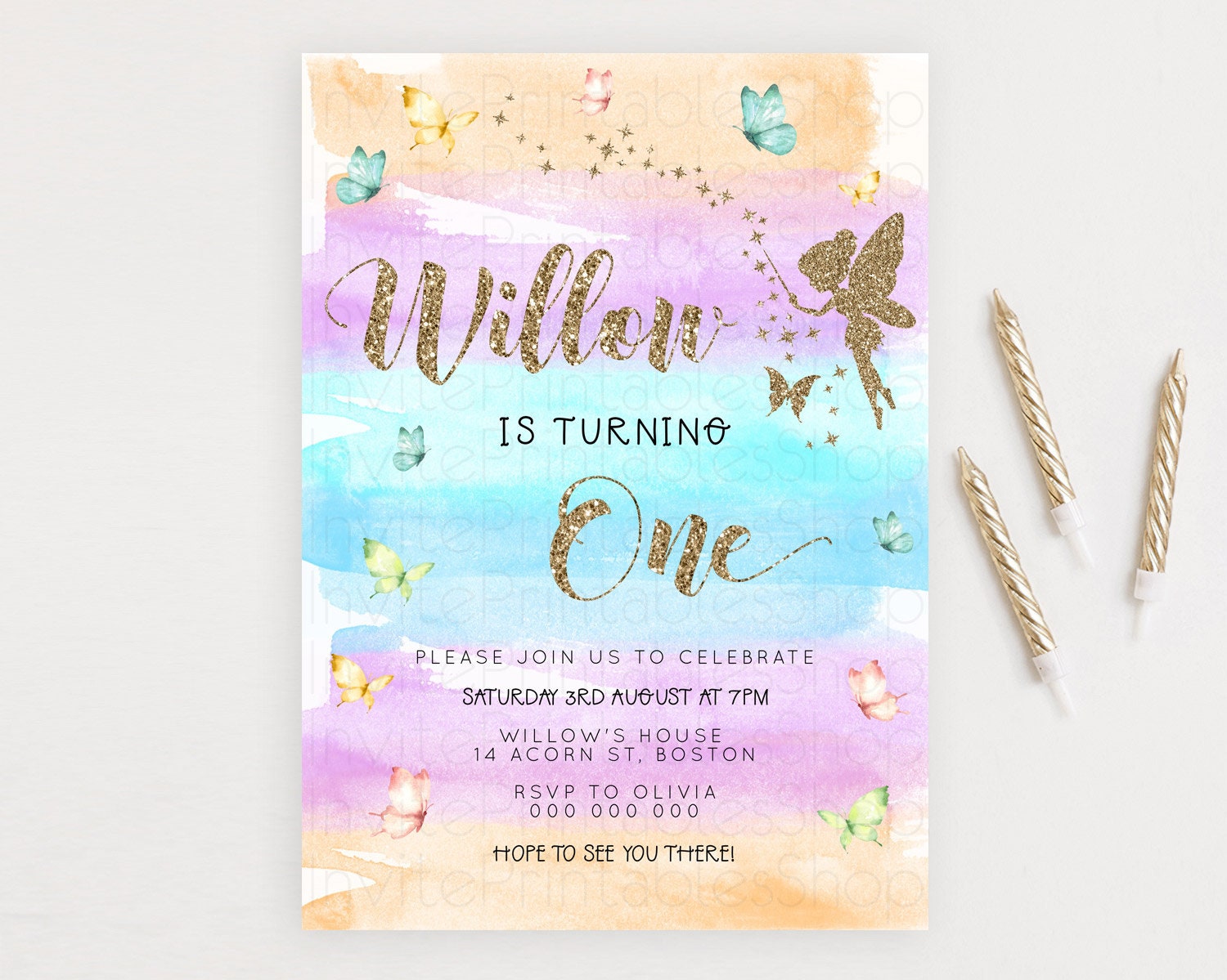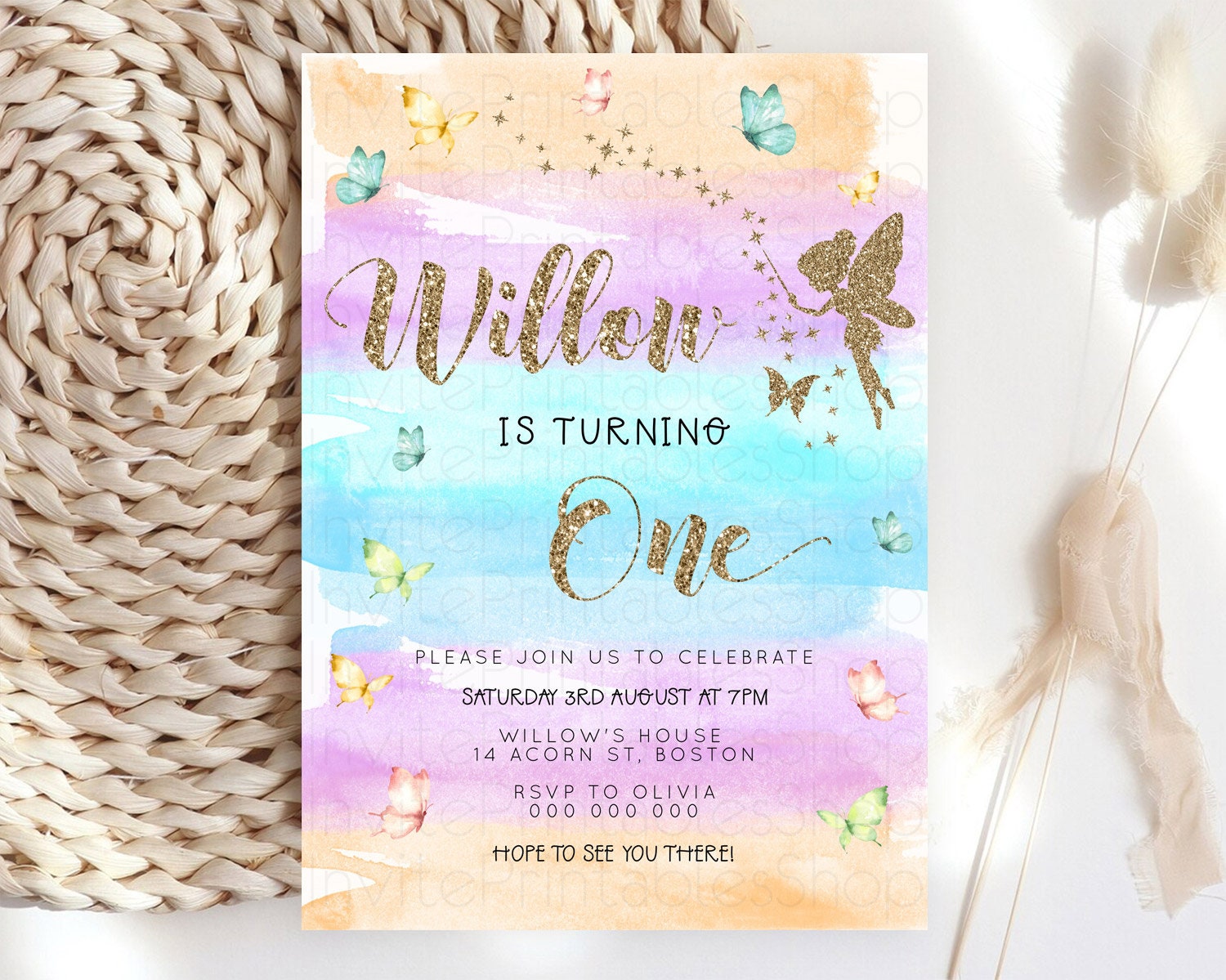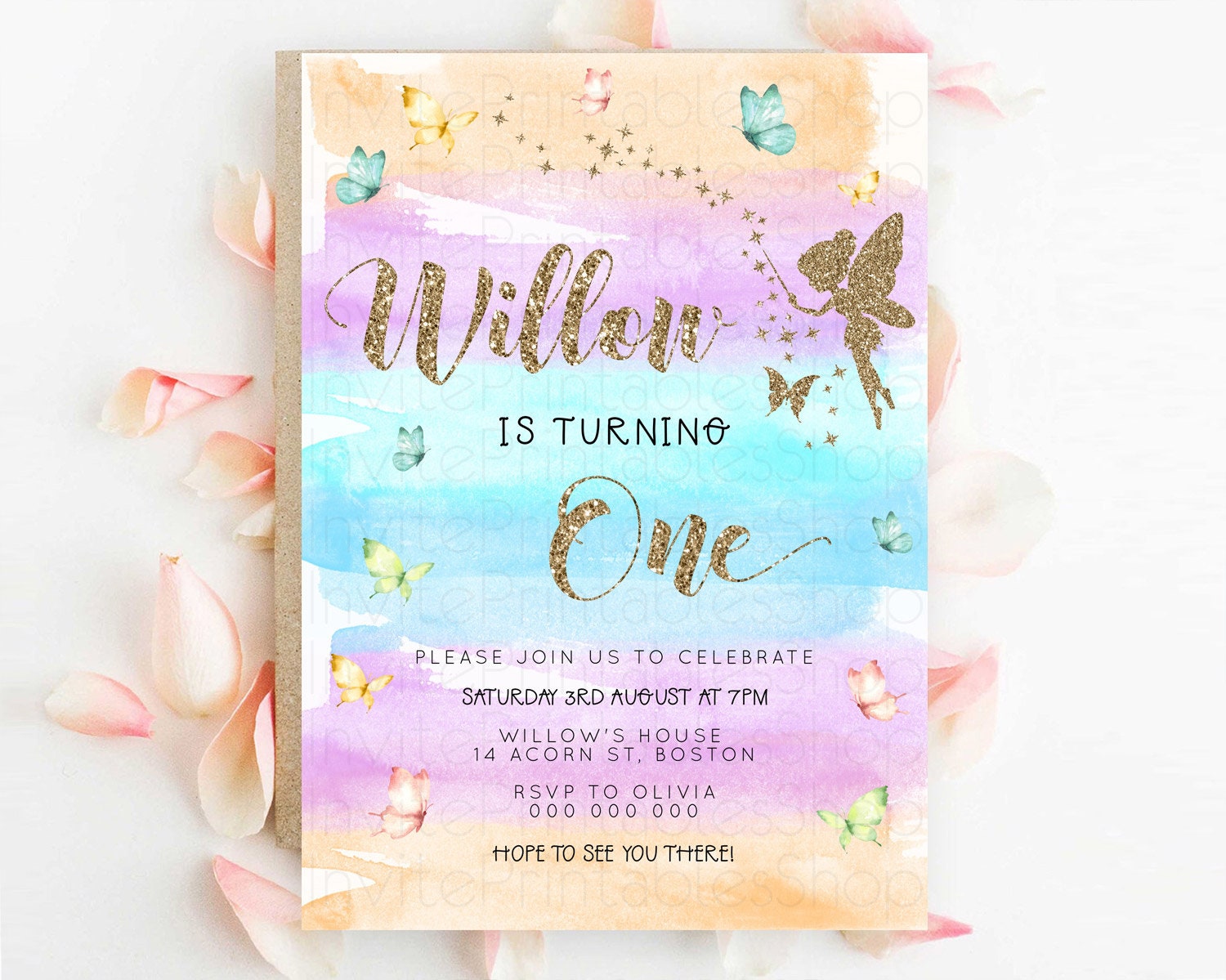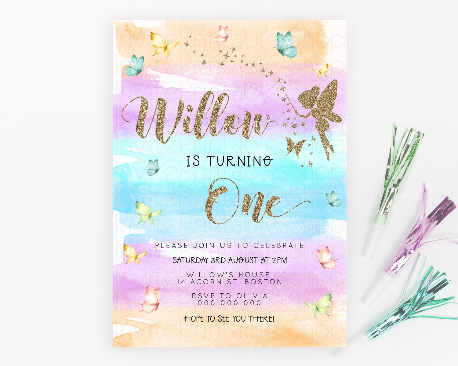 Pastel Fairy Birthday Invitation Pastel Butterflies Fairy Birthday Invitation Rainbow Ombre Watercolor 1st 2nd Birthday Invitation D23319