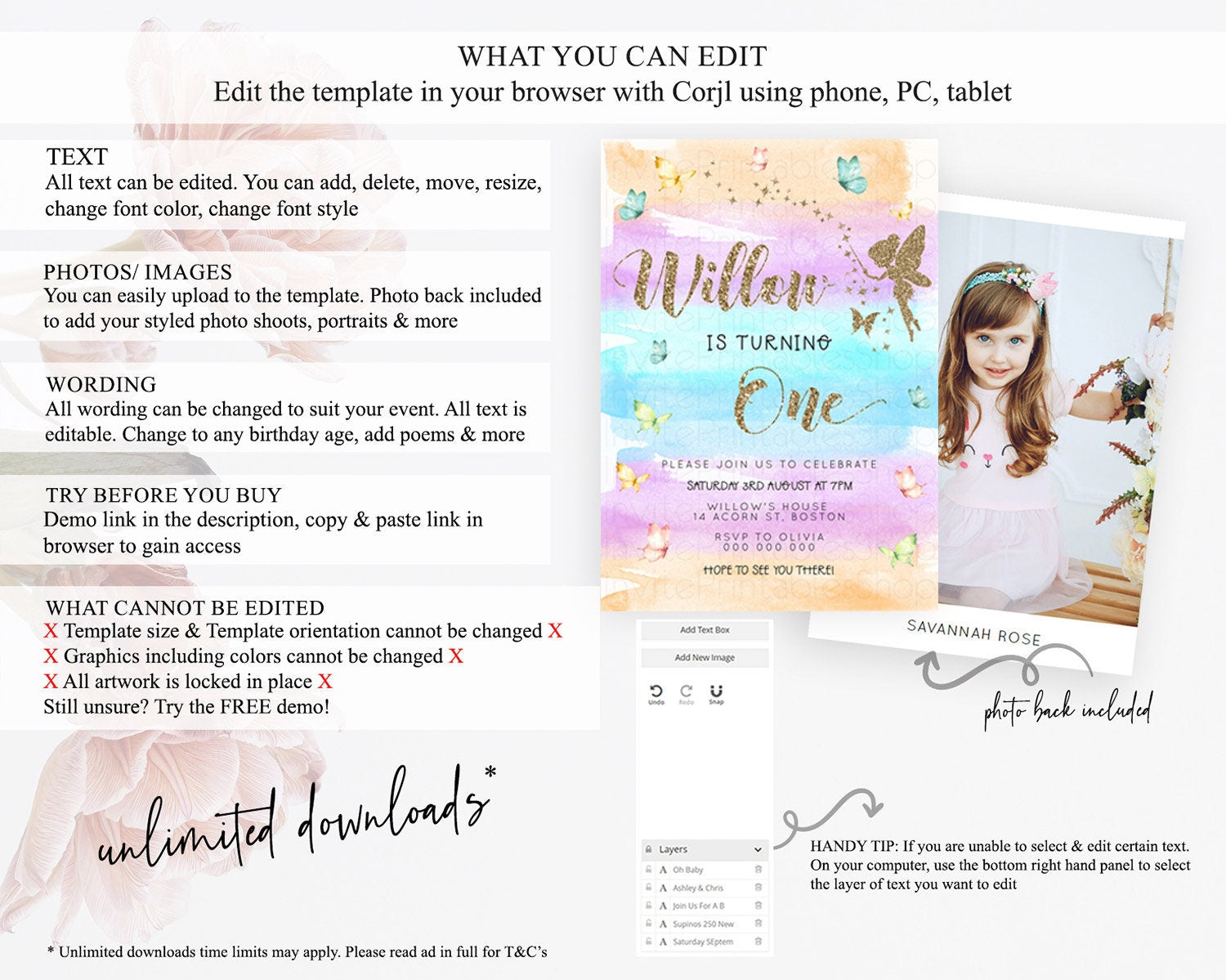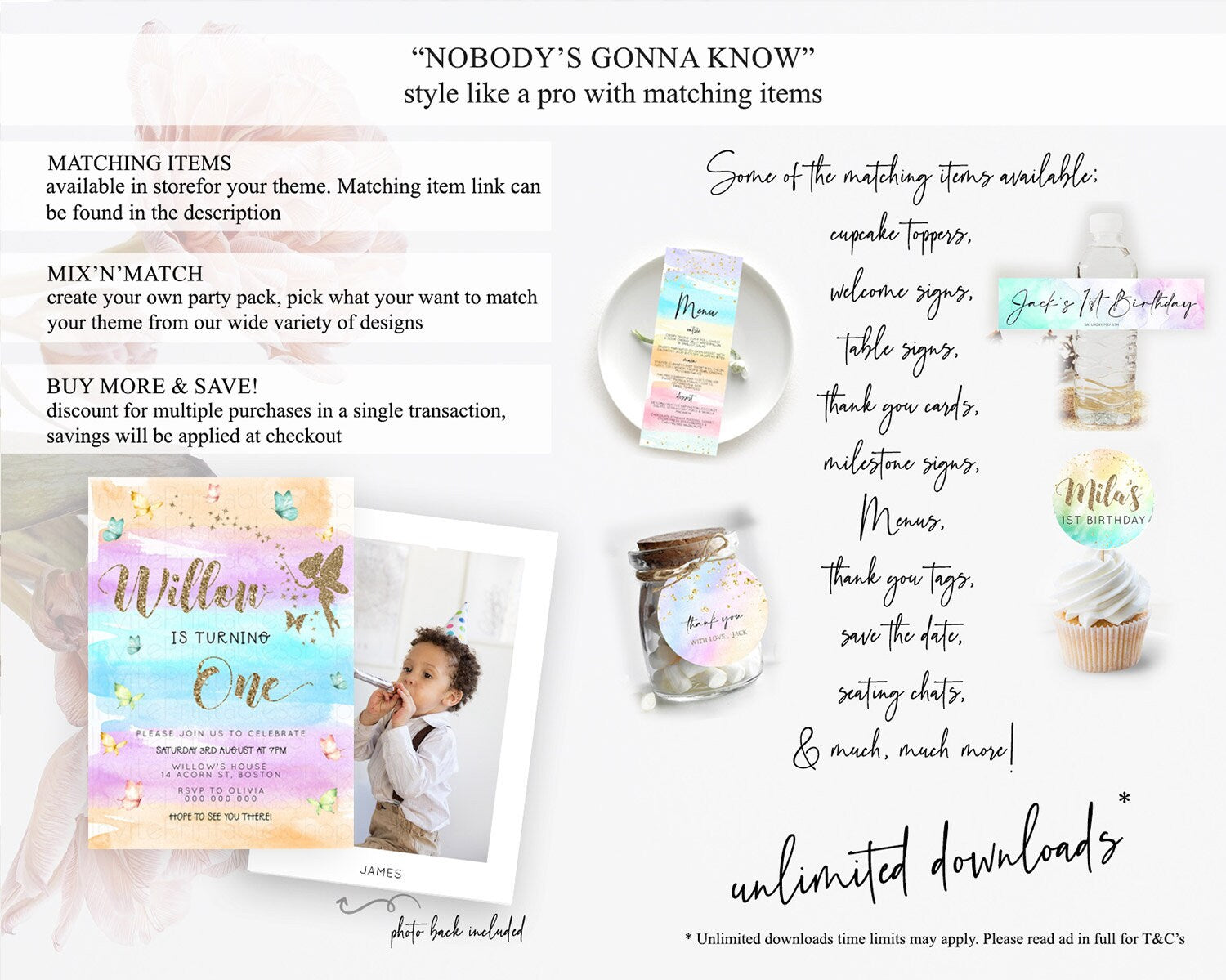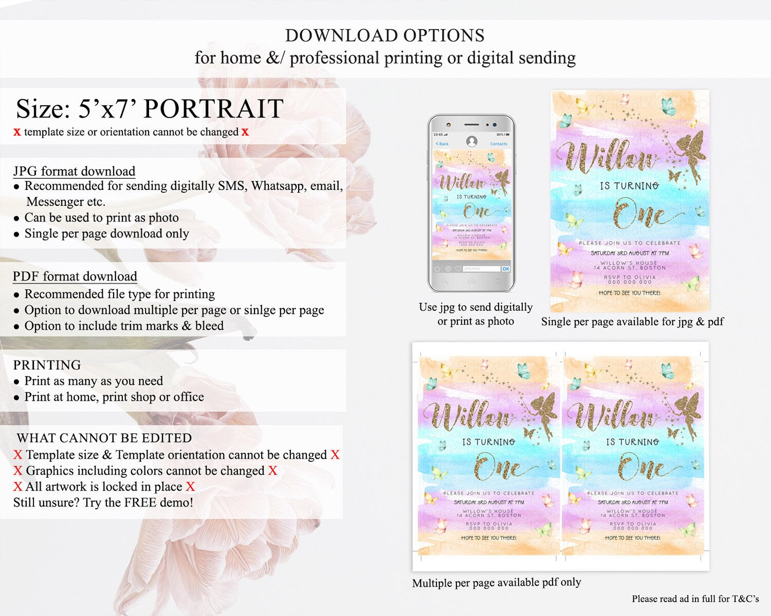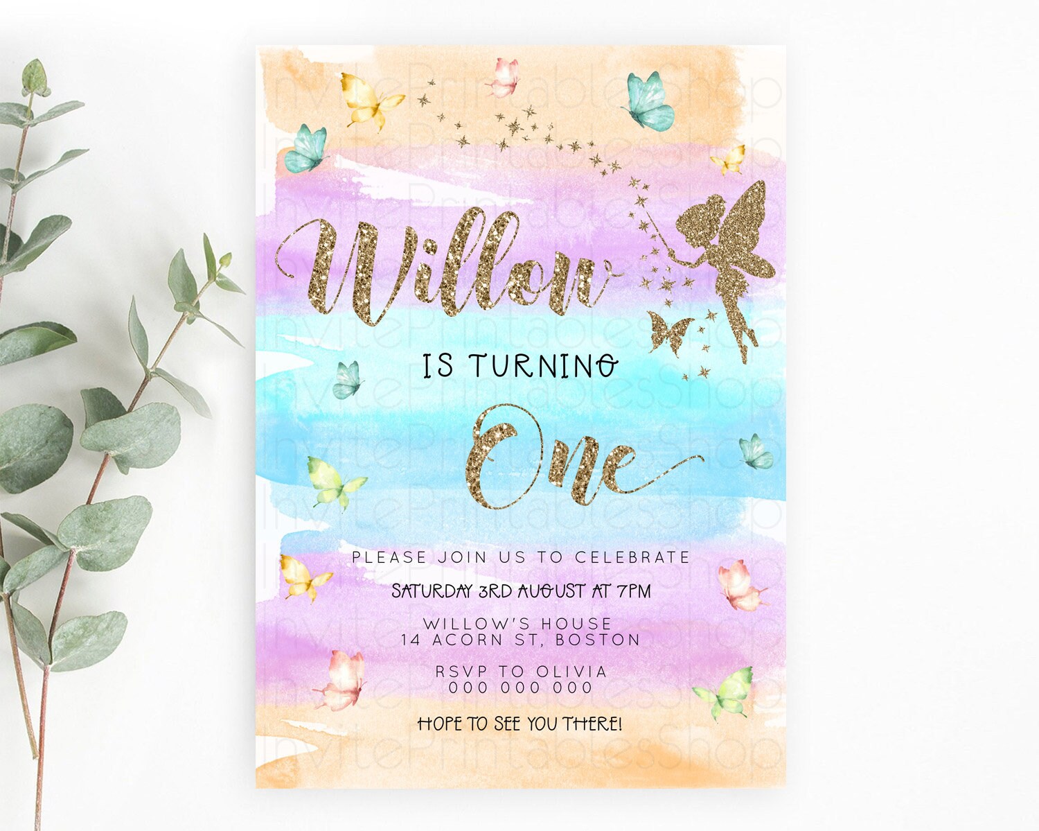 Pastel Fairy Birthday Invitation Pastel Butterflies Fairy Birthday Invitation Rainbow Ombre Watercolor 1st 2nd Birthday Invitation D23319