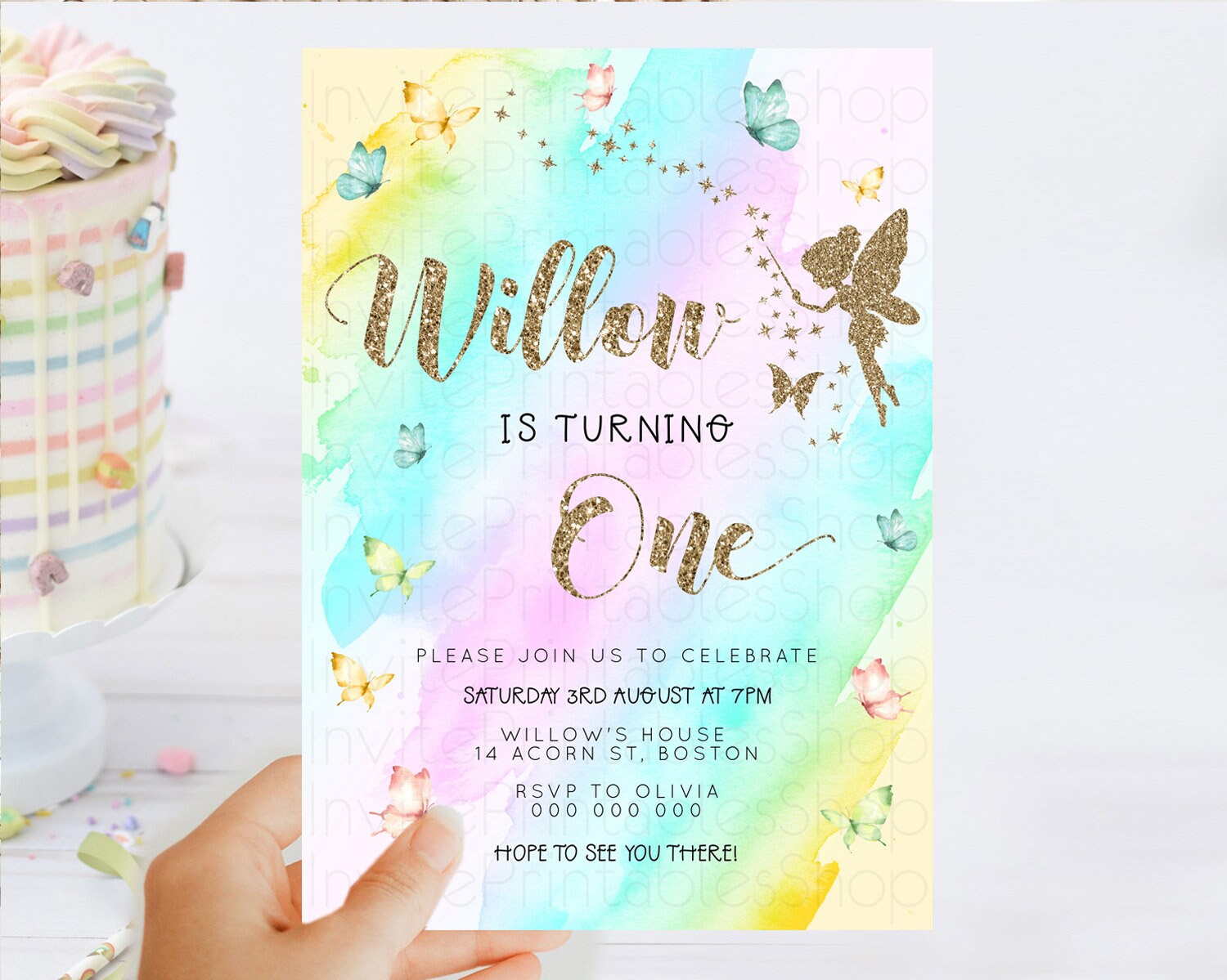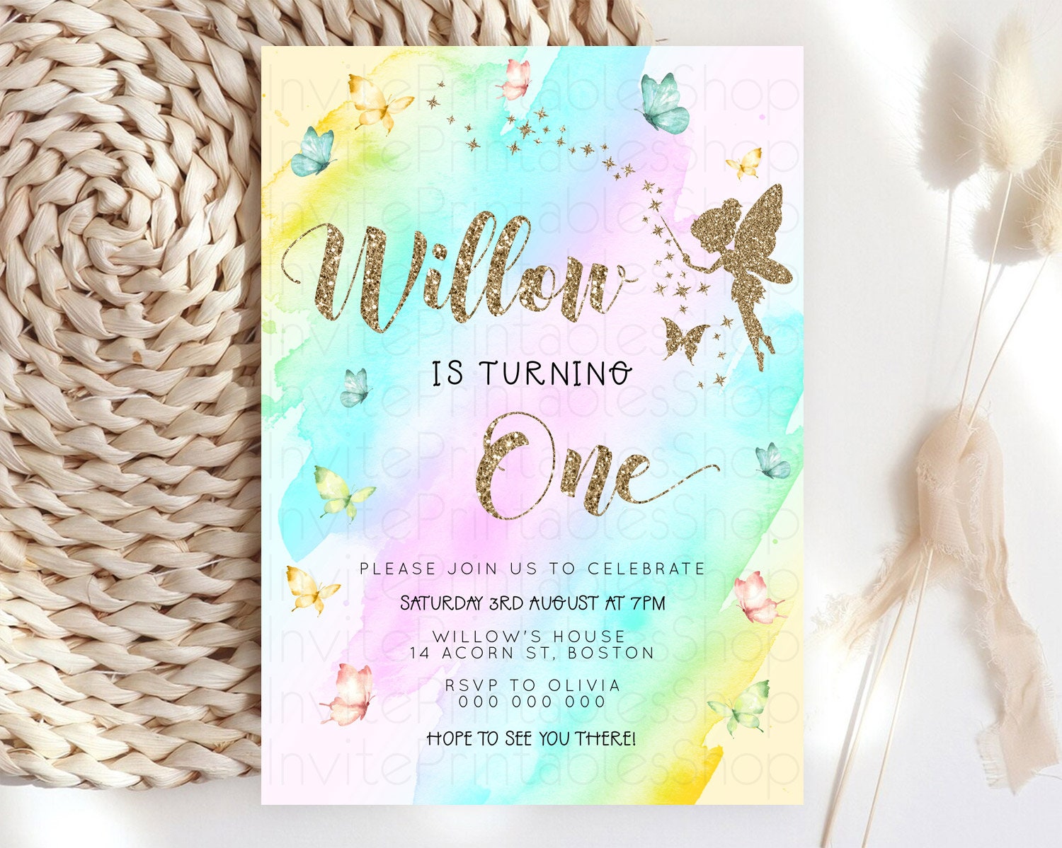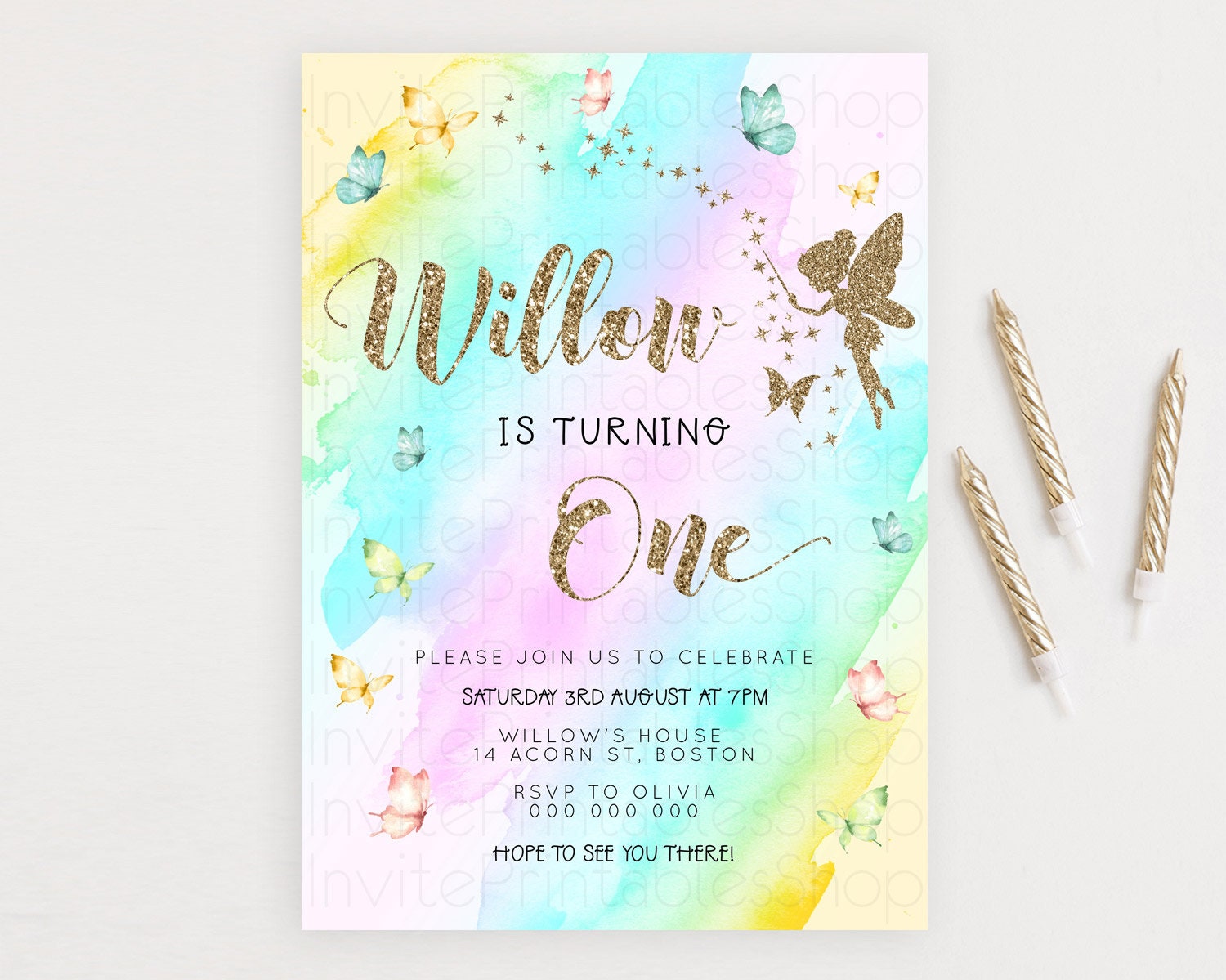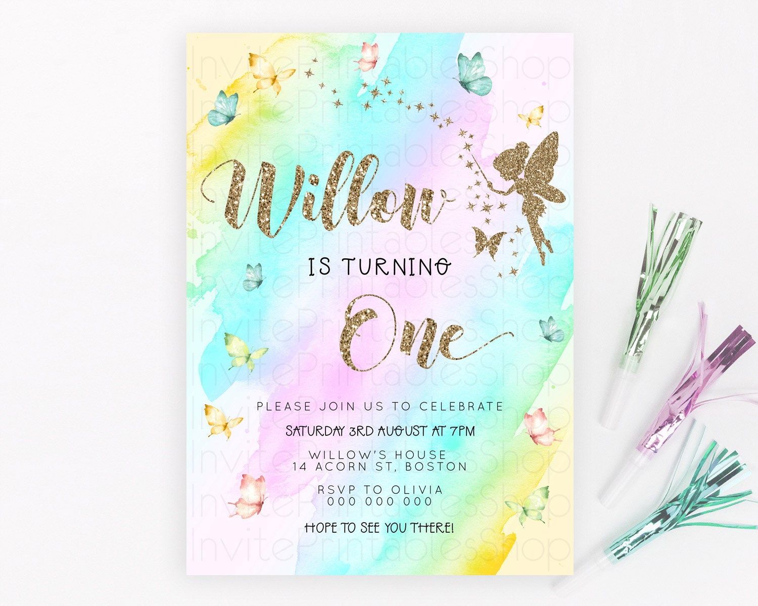 Pastel Fairy Birthday Invitation Pastel Butterflies Fairy Birthday Invitation Rainbow Ombre Watercolor 1st 2nd Birthday Invitation D23332