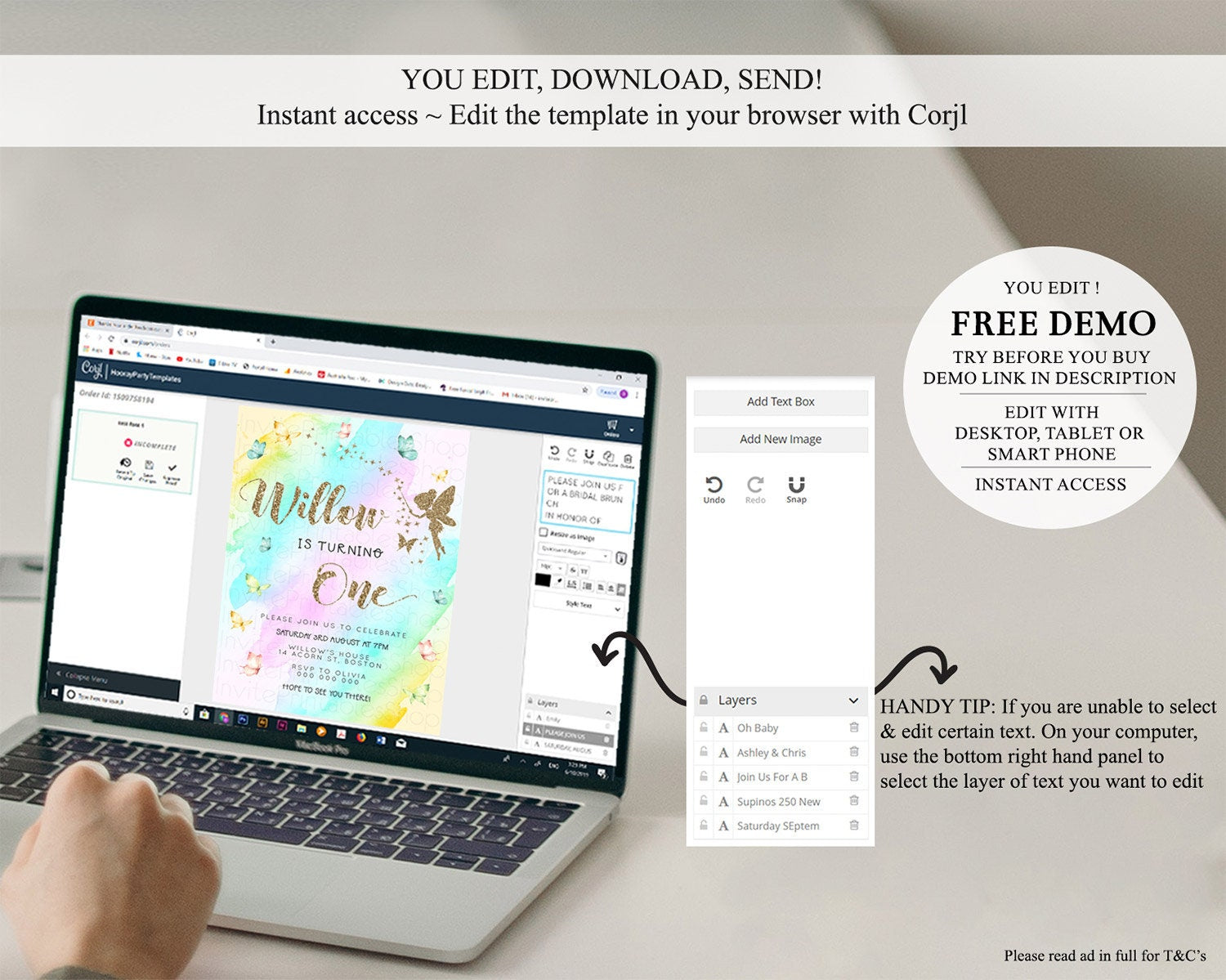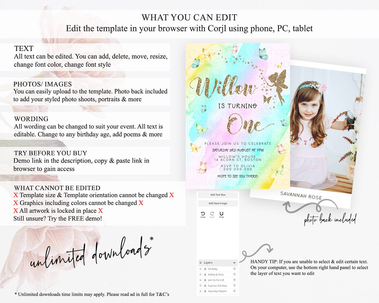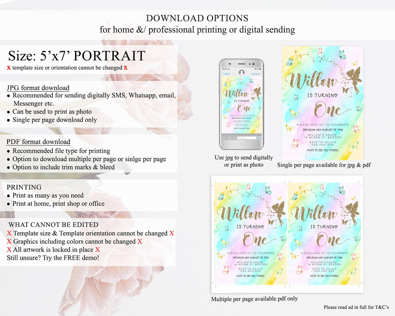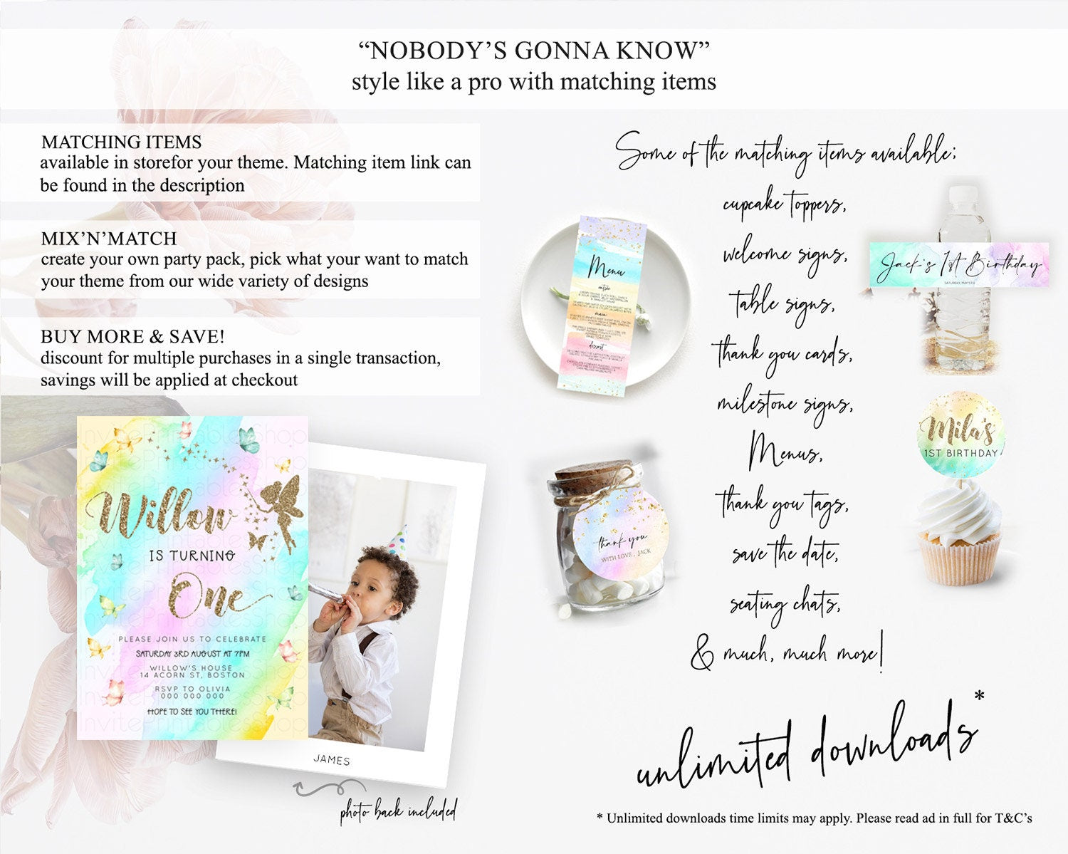 Pastel Fairy Birthday Invitation Pastel Butterflies Fairy Birthday Invitation Rainbow Ombre Watercolor 1st 2nd Birthday Invitation D23332