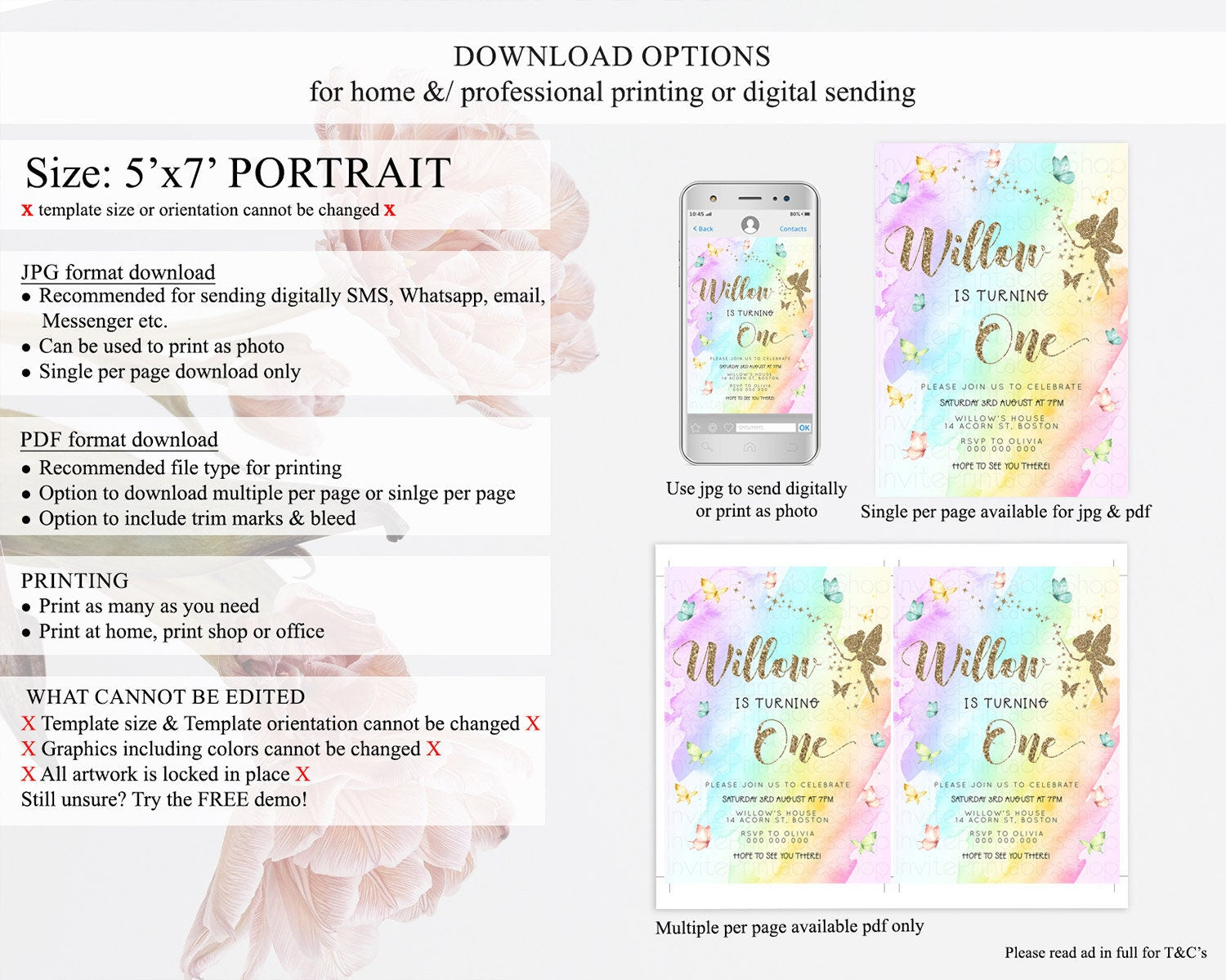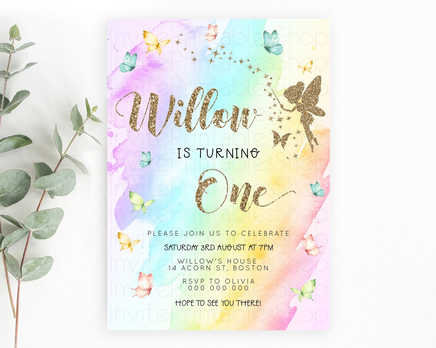 Pastel Fairy Birthday Invitation Pastel Butterflies Fairy Birthday Invitation Rainbow Ombre Watercolor 1st 2nd Birthday Invitation D23333
