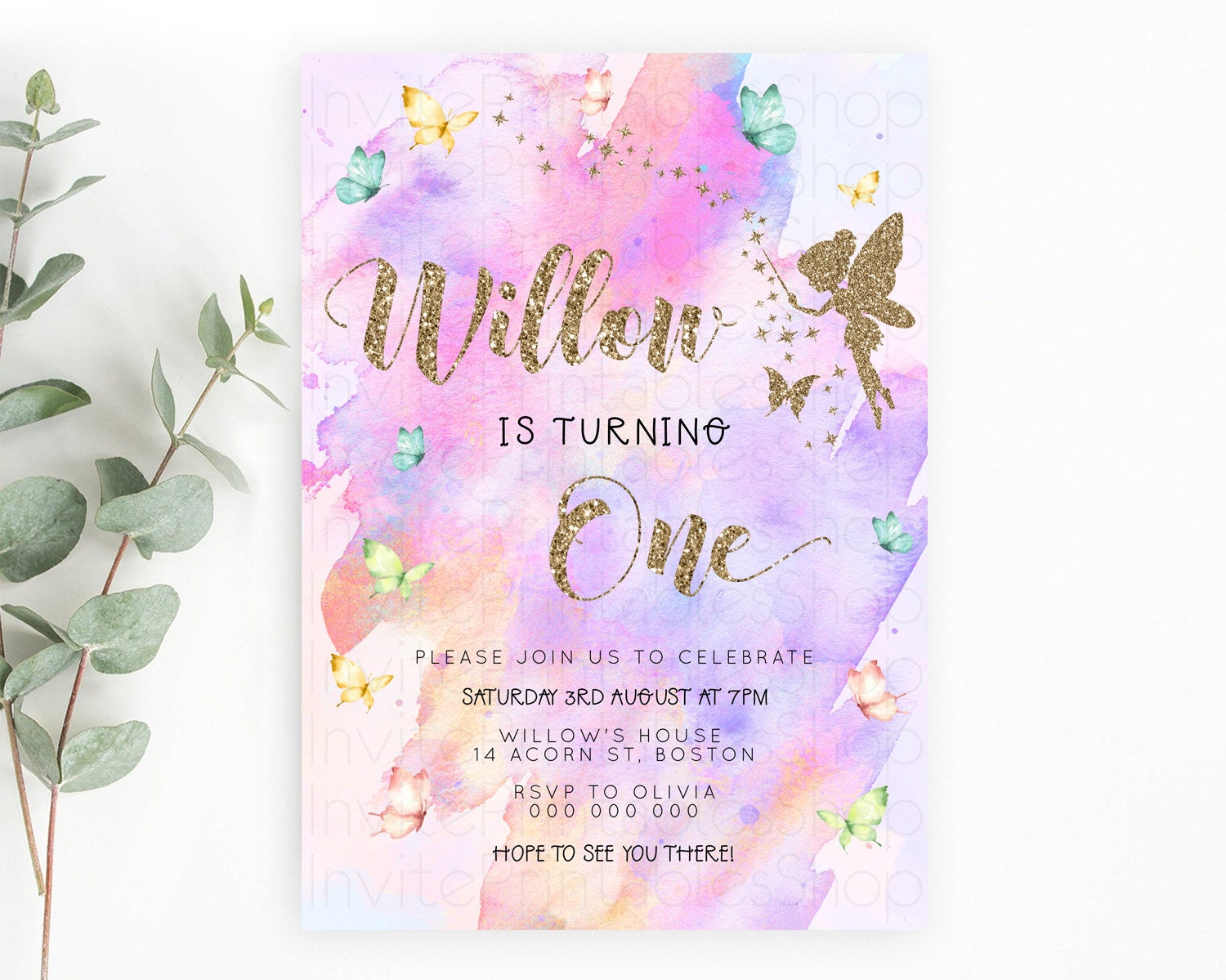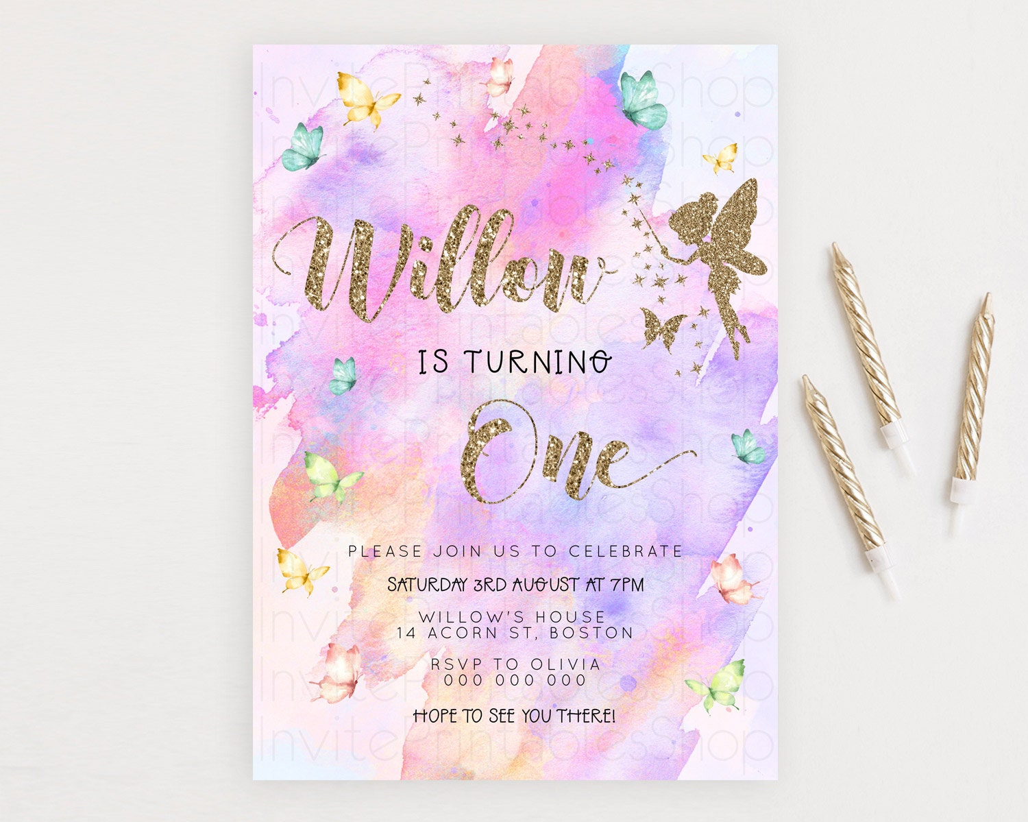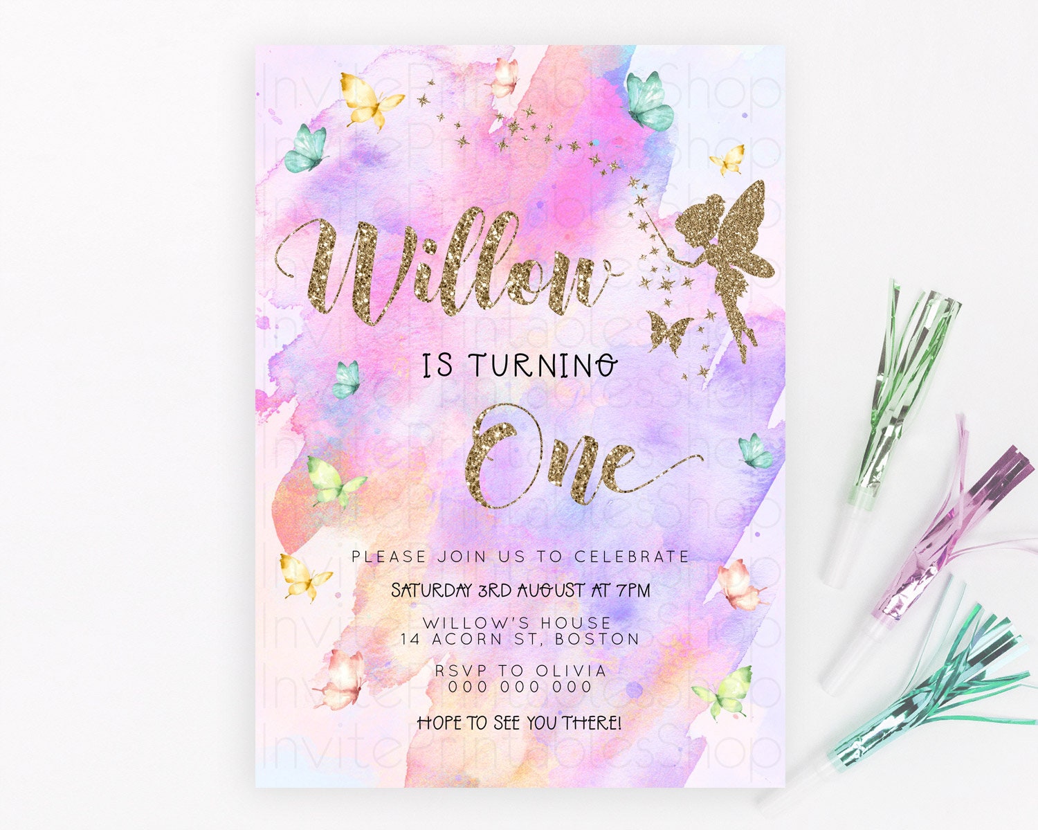 Pastel Fairy Birthday Invitation Pastel Butterflies Fairy Birthday Invitation Rainbow Ombre Watercolor 1st 2nd Birthday Invitation D23345