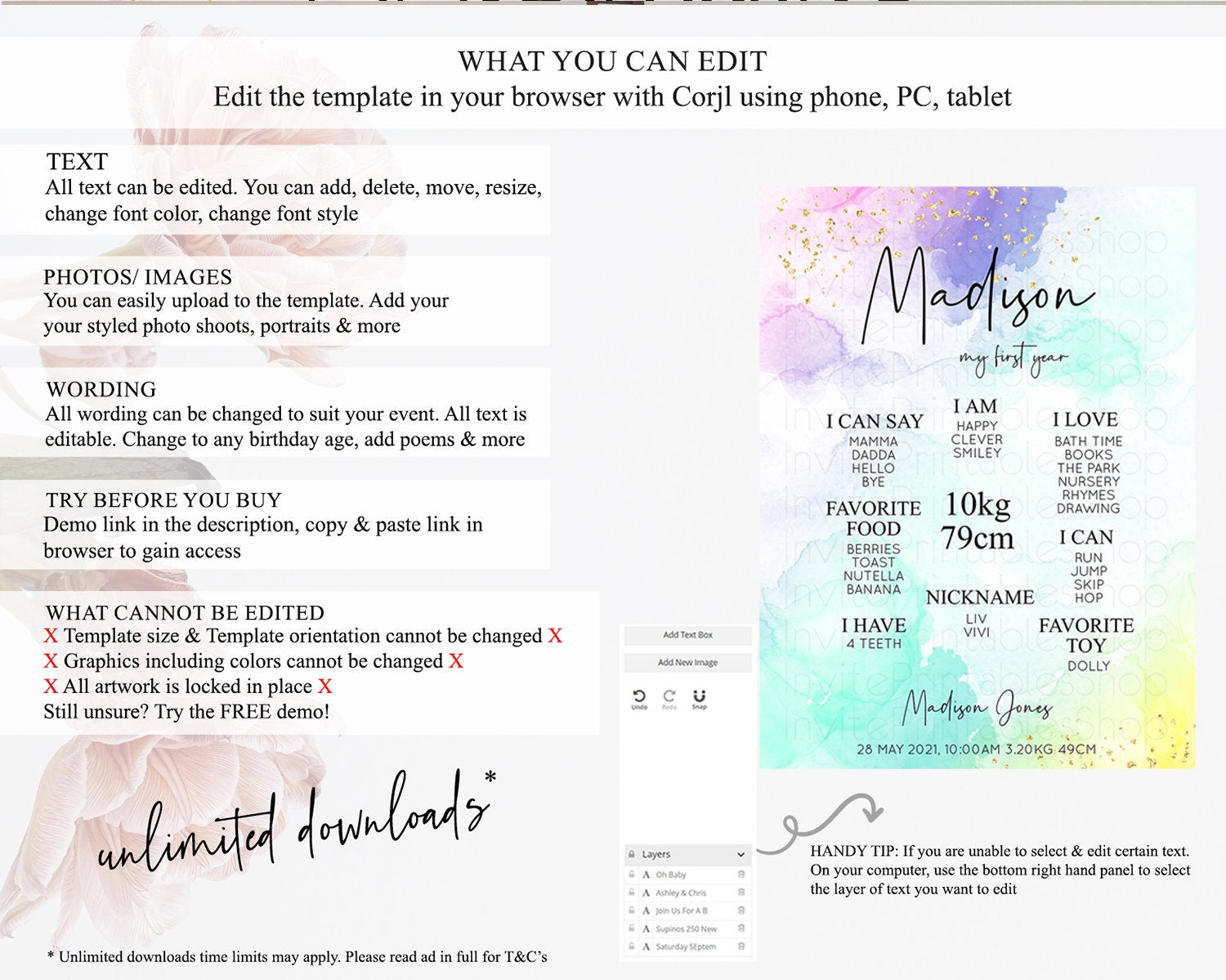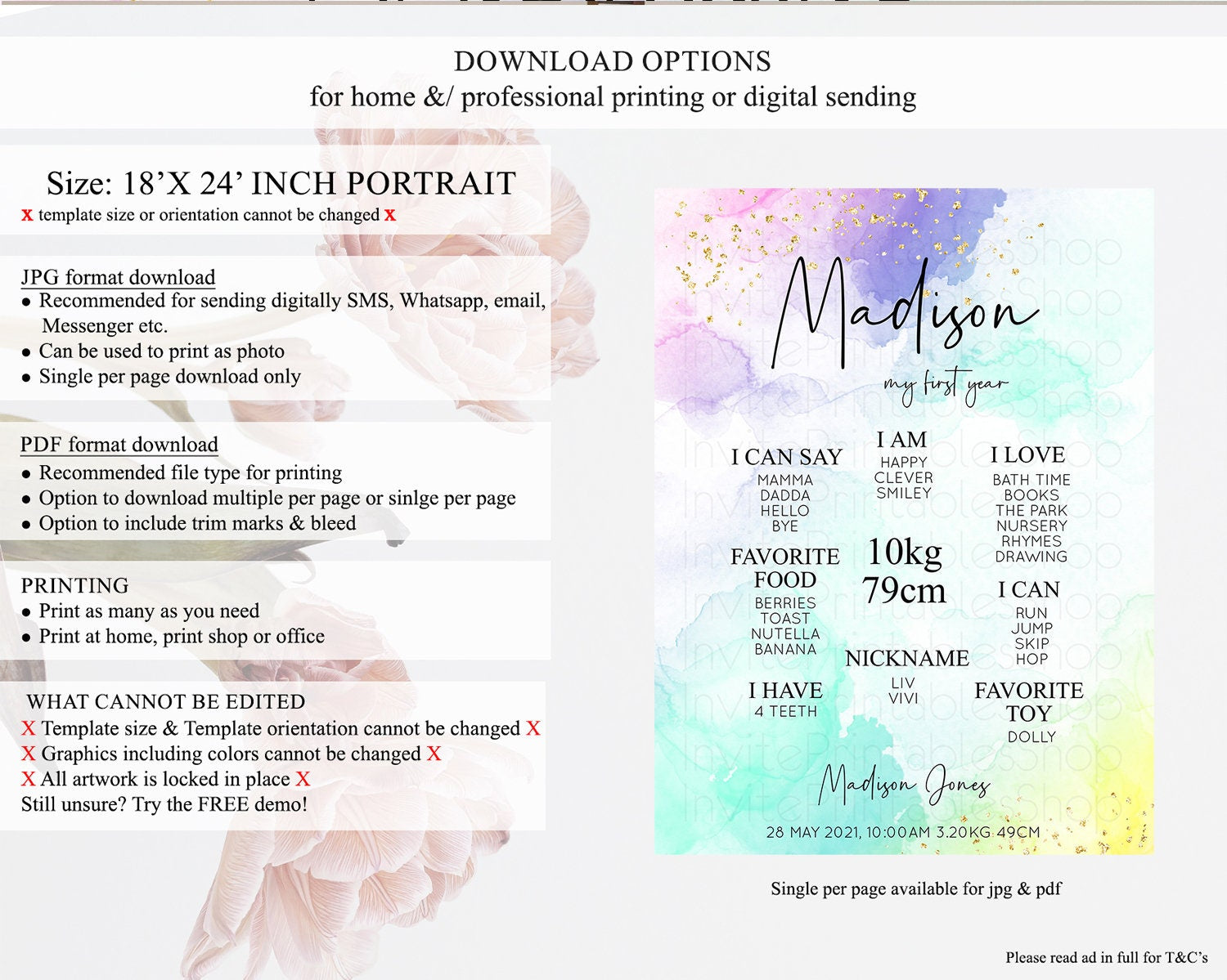 Pastel First Birthday Milestone Board Pastel Rainbow Milestone Poster Colorful Confetti Watercolor Glitter 1st Birthday Welcome Sign D10158