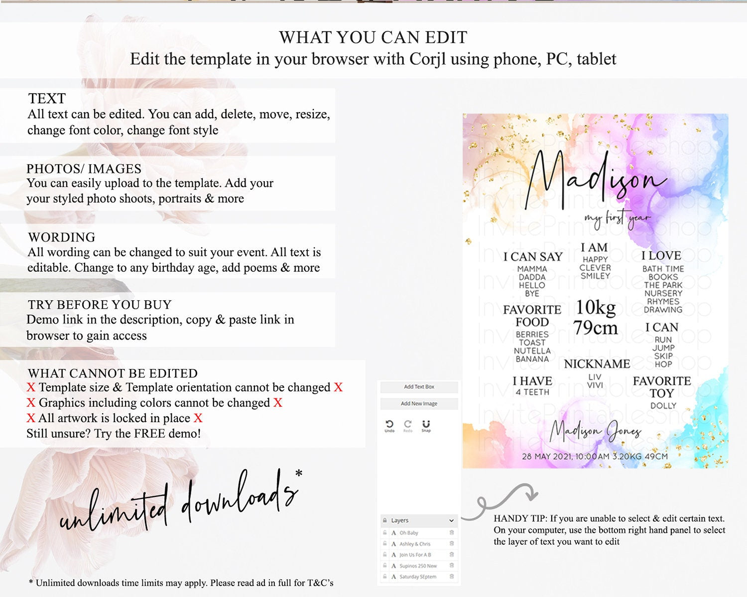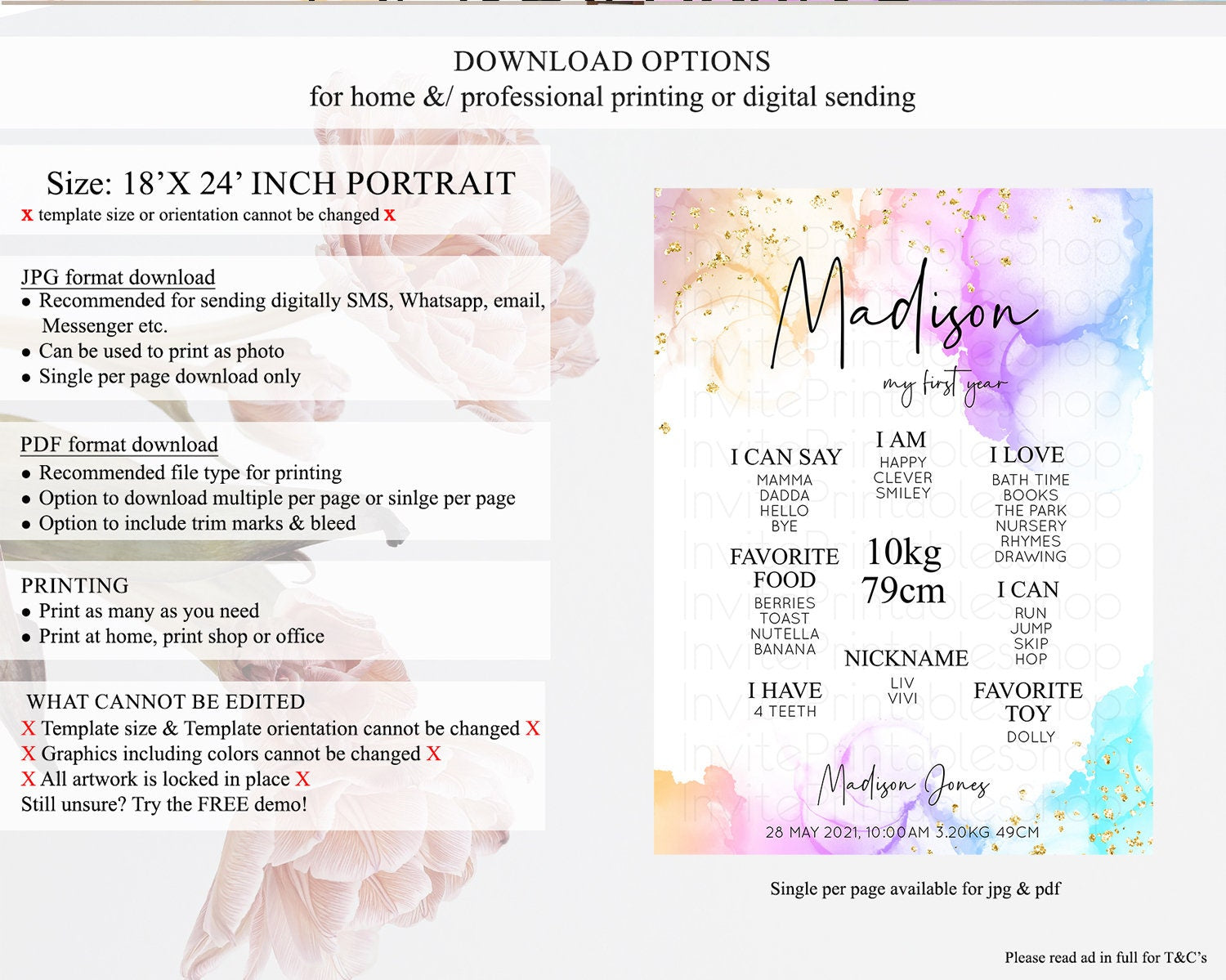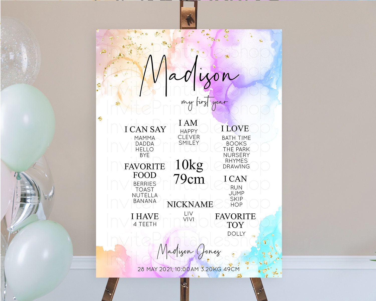 Pastel First Birthday Milestone Board Pastel Rainbow Milestone Poster Colorful Confetti Watercolor Glitter 1st Birthday Welcome Sign D10180
