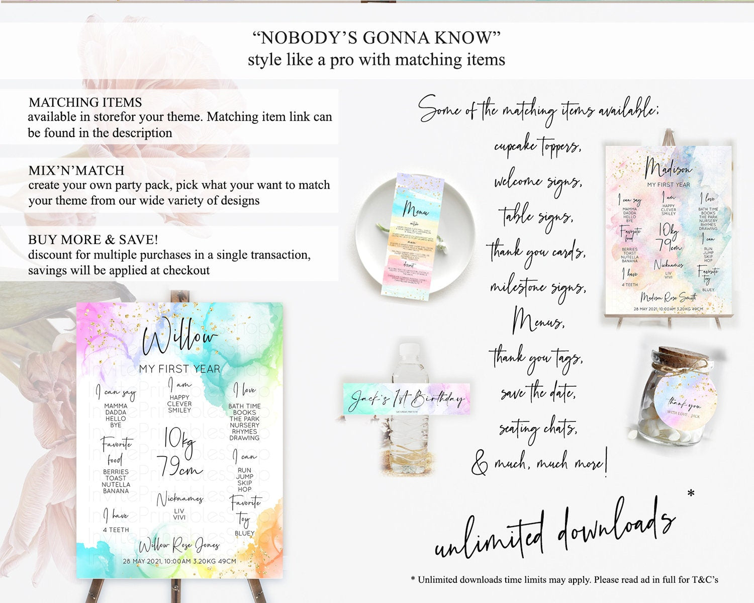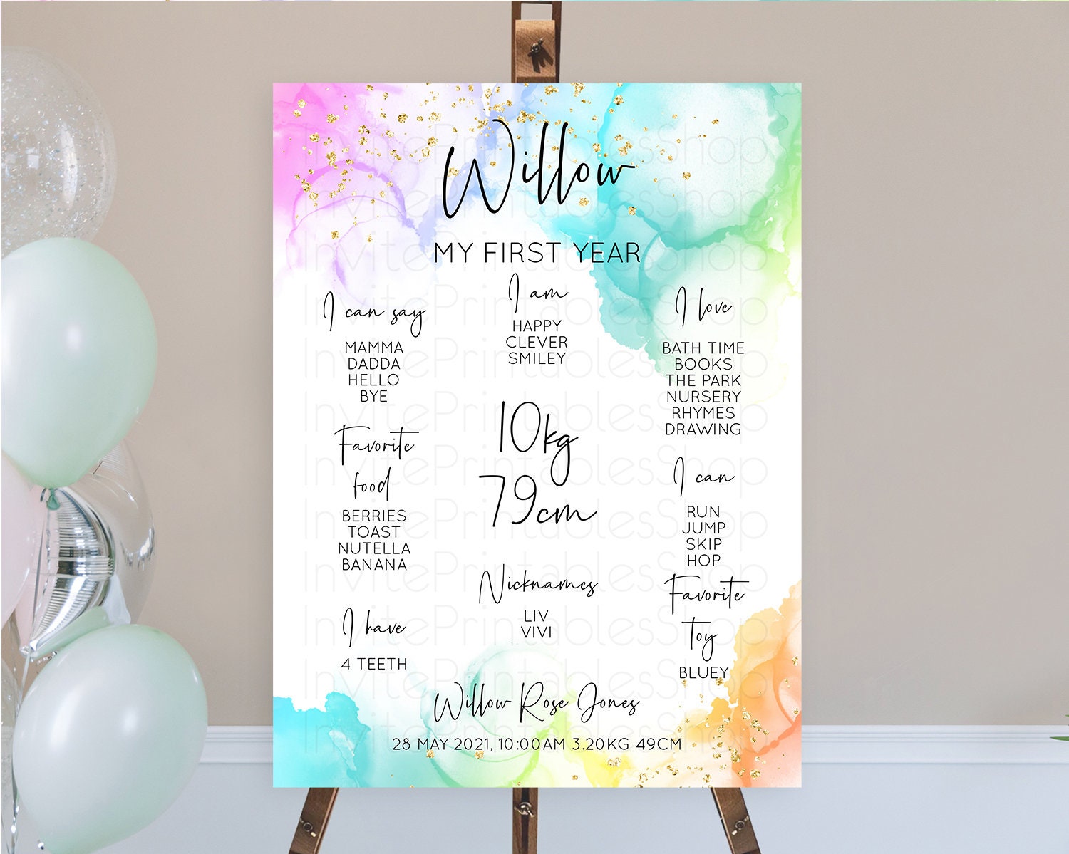 Pastel First Birthday Milestone Board Pastel Rainbow Milestone Poster Colorful Confetti Watercolor Glitter 1st Birthday Welcome Sign D10181