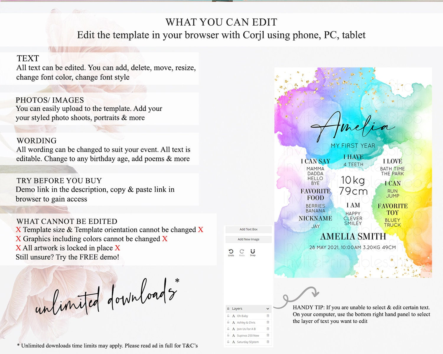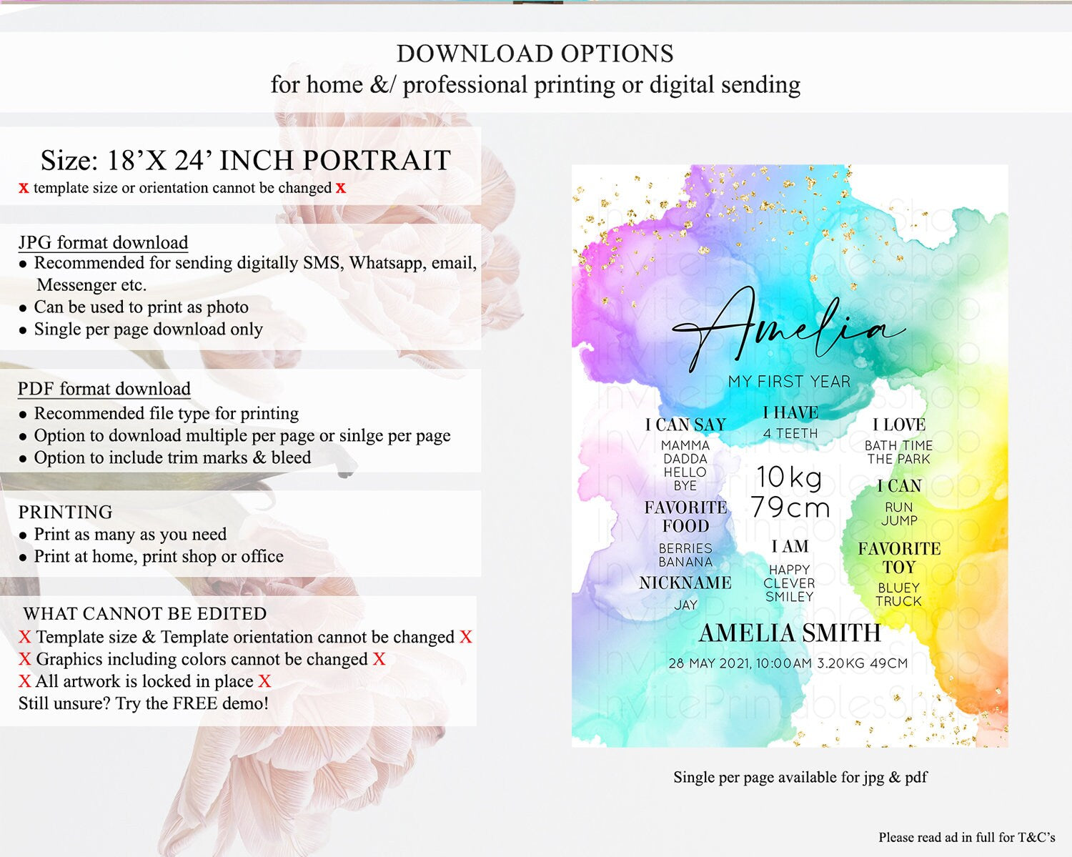 Pastel First Birthday Milestone Board Pastel Rainbow Milestone Poster Colorful Confetti Watercolor Glitter 1st Birthday Welcome Sign D10213