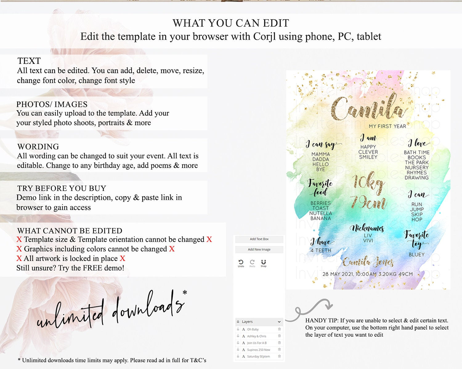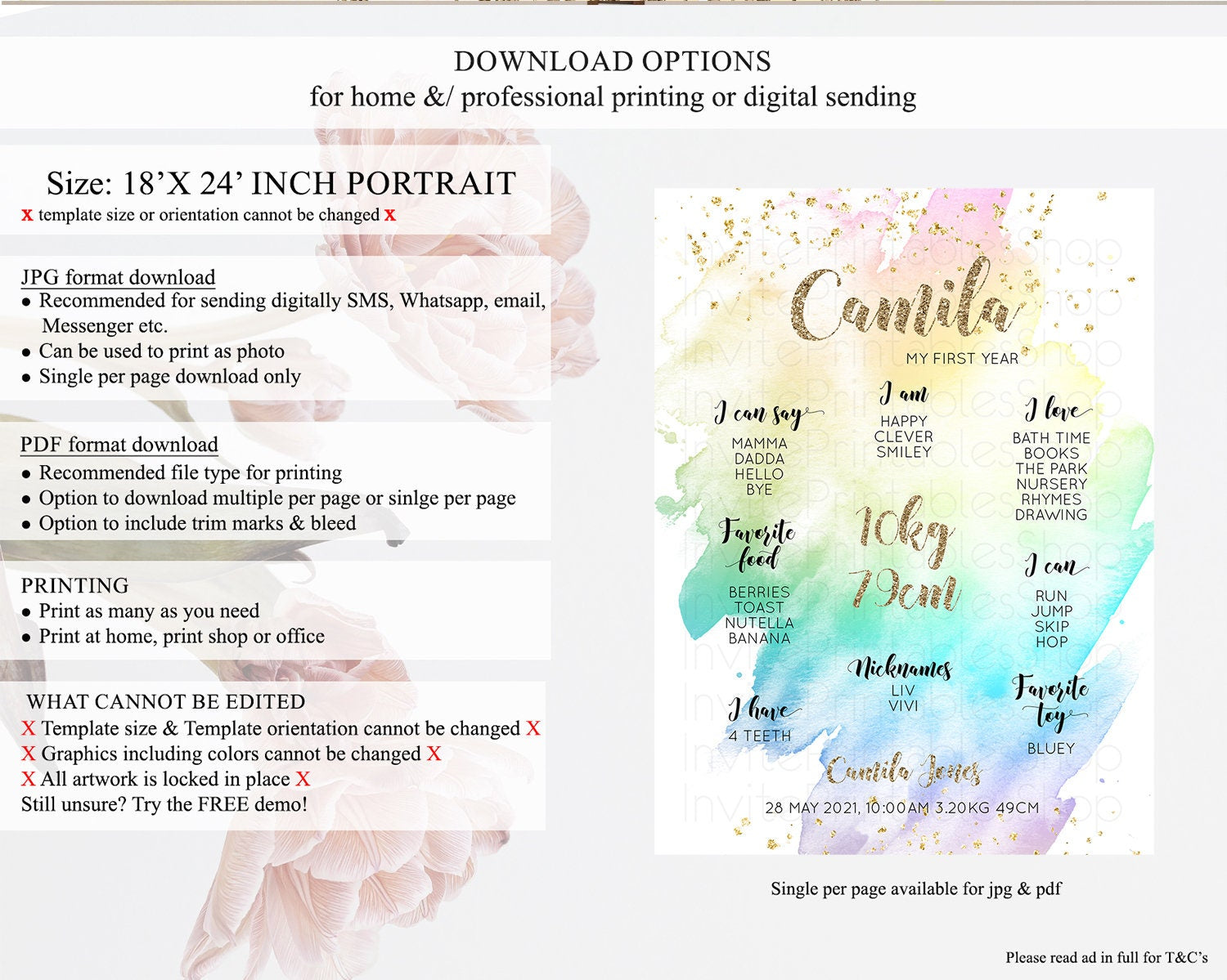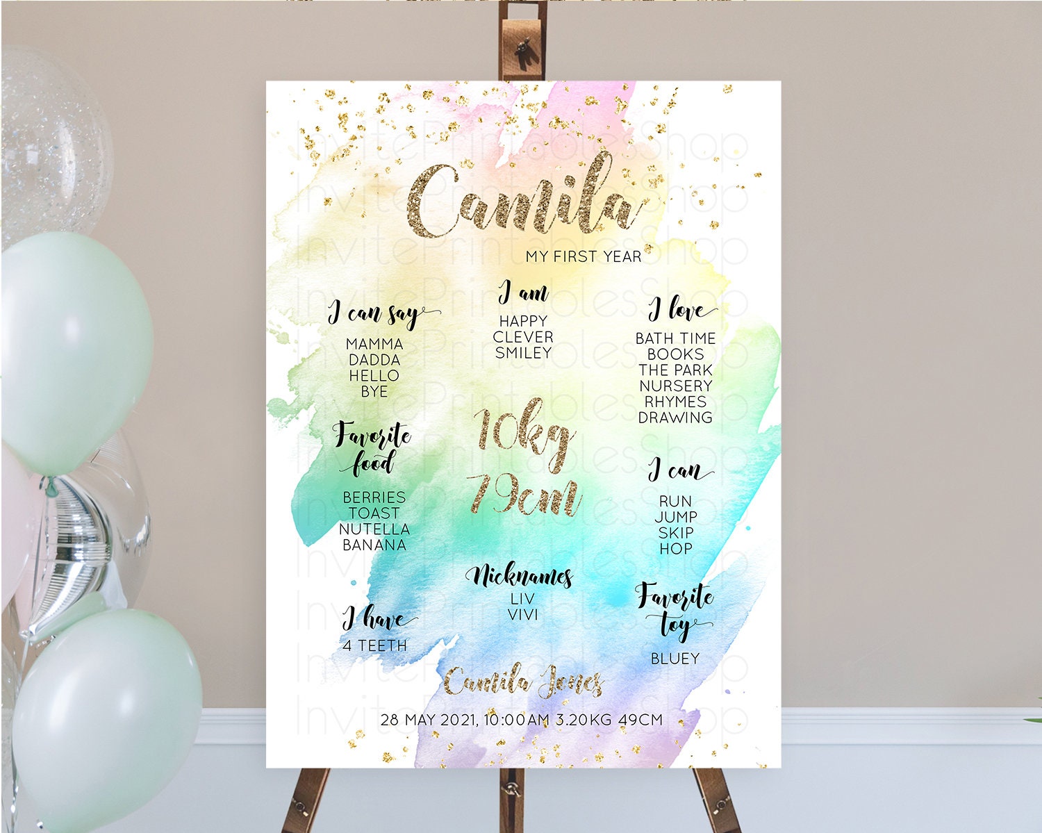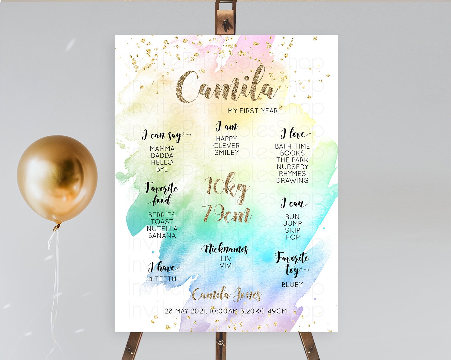 Pastel First Birthday Milestone Board Pastel Rainbow Milestone Poster Colorful Confetti Watercolor Glitter 1st Birthday Welcome Sign D10259