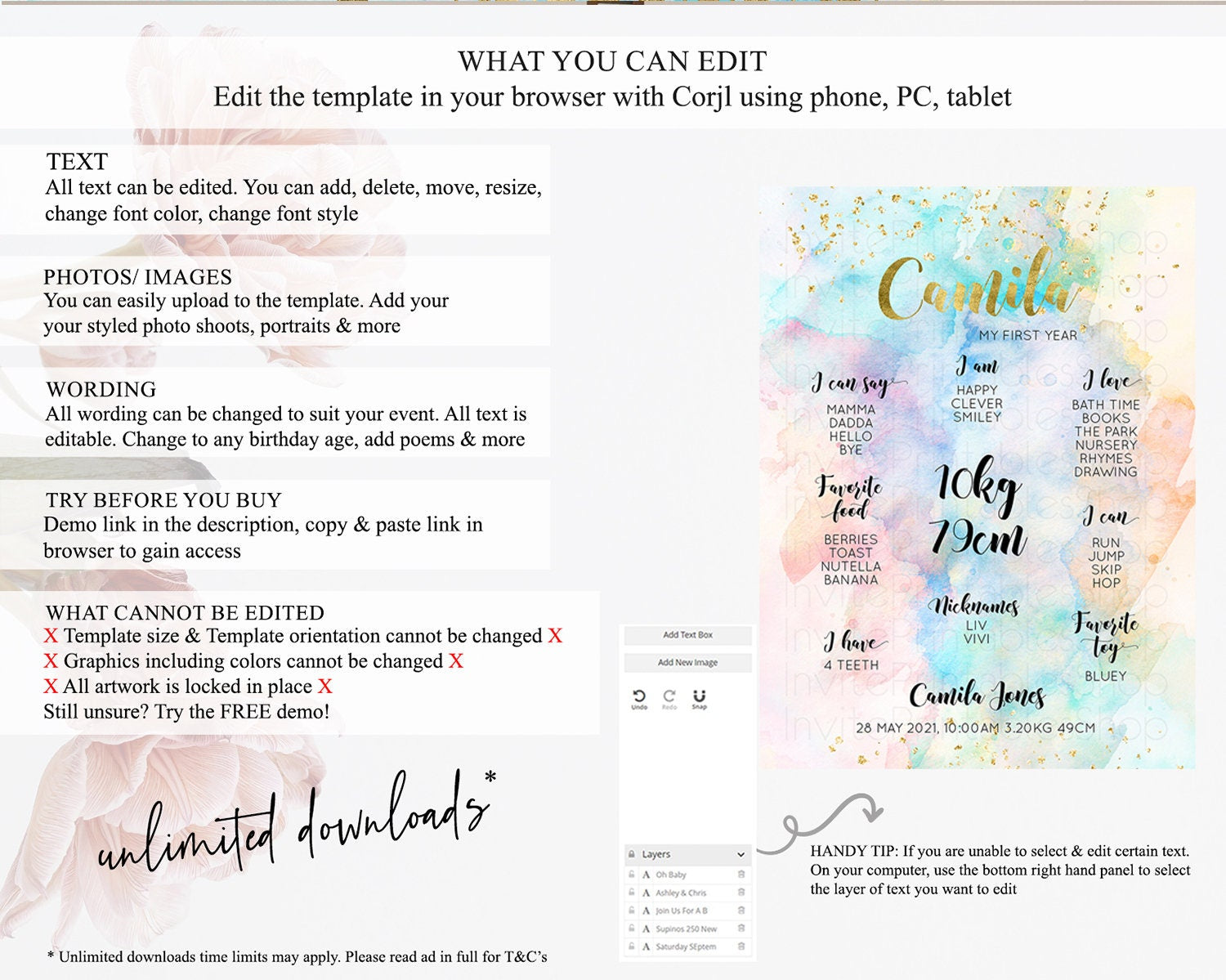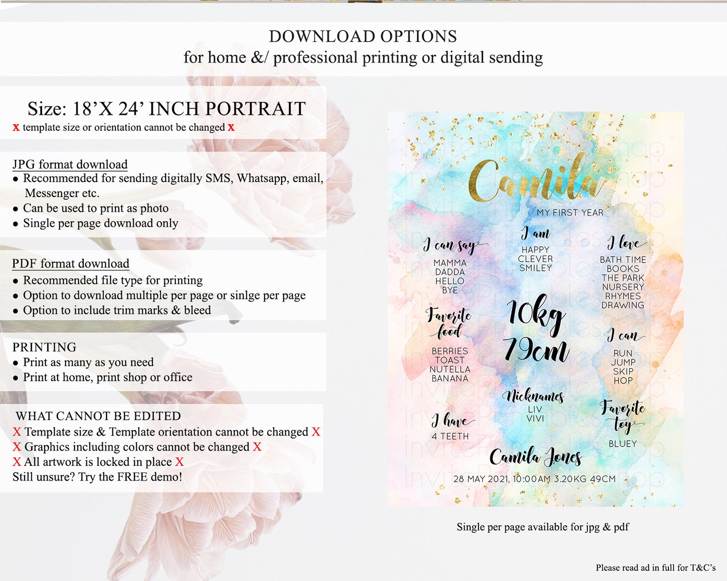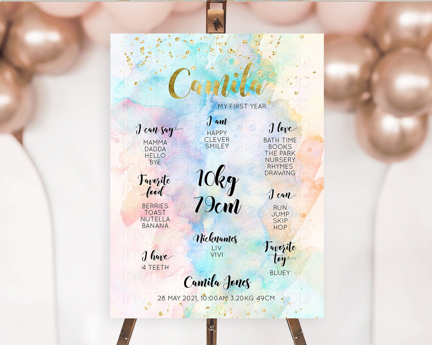 Pastel First Birthday Milestone Board Pastel Rainbow Milestone Poster Colorful Confetti Watercolor Glitter 1st Birthday Welcome Sign D10272
