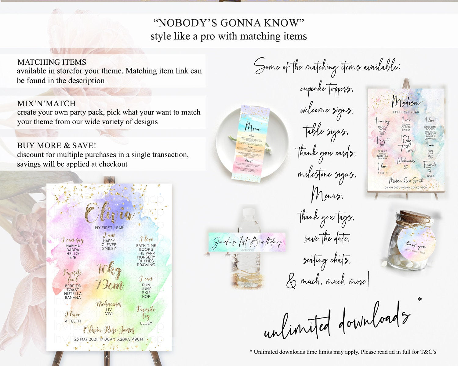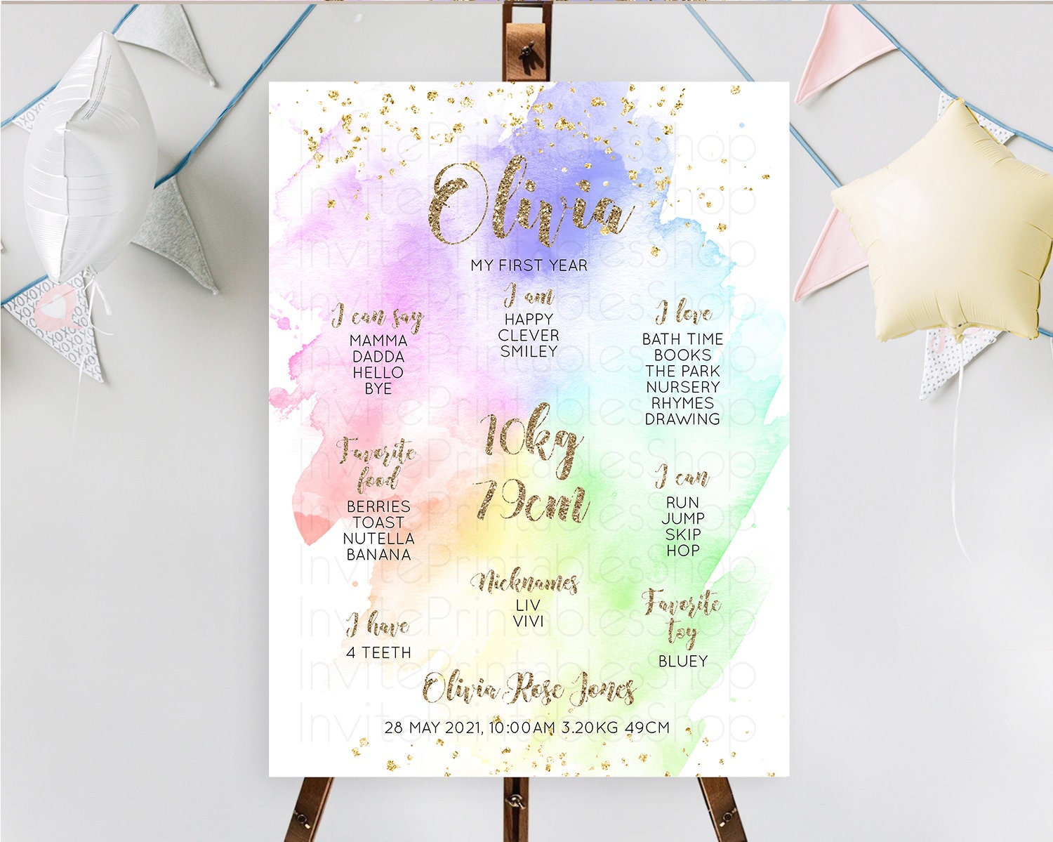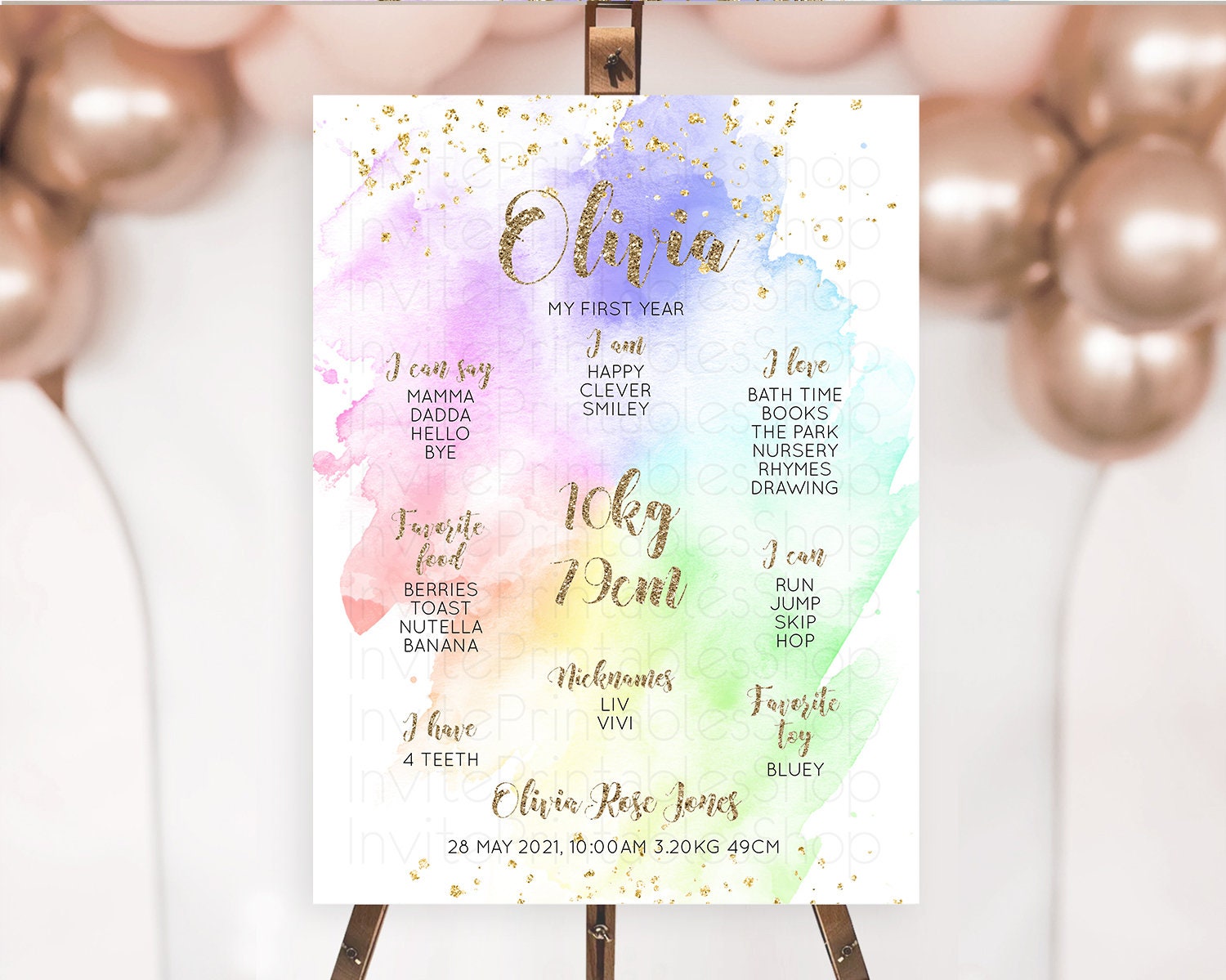Pastel First Birthday Milestone Board Pastel Rainbow Milestone Poster Colorful Confetti Watercolor Glitter 1st Birthday Welcome Sign D10319