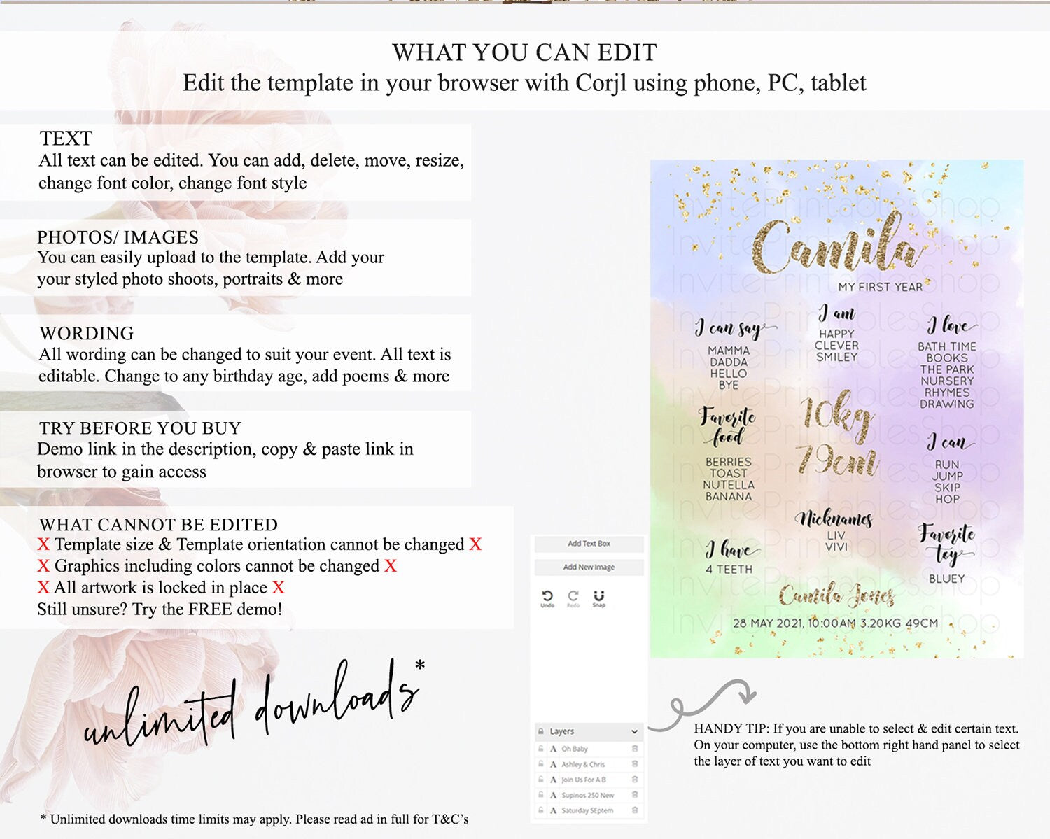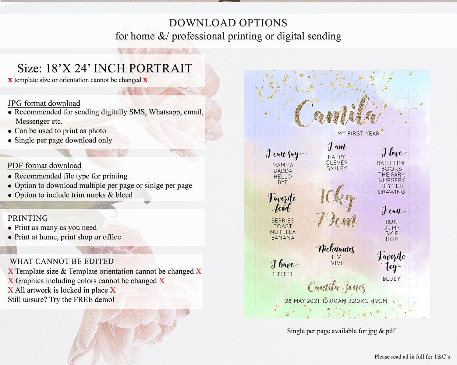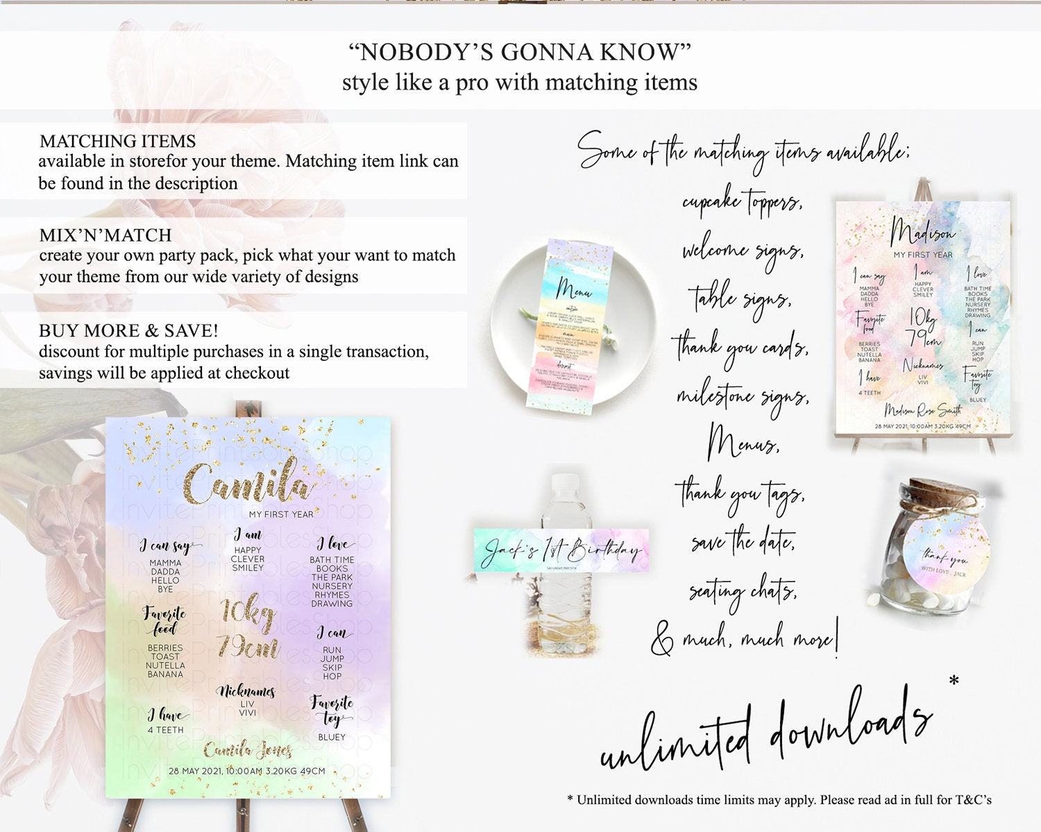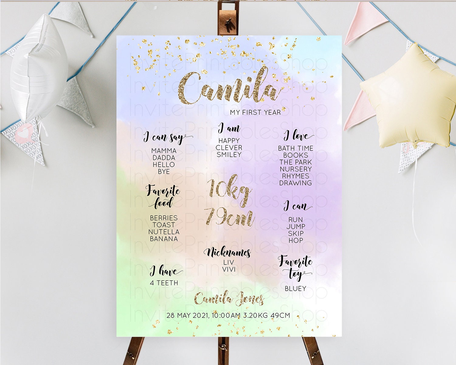 Pastel First Birthday Milestone Board Pastel Rainbow Milestone Poster Colorful Confetti Watercolor Glitter 1st Birthday Welcome Sign D10372