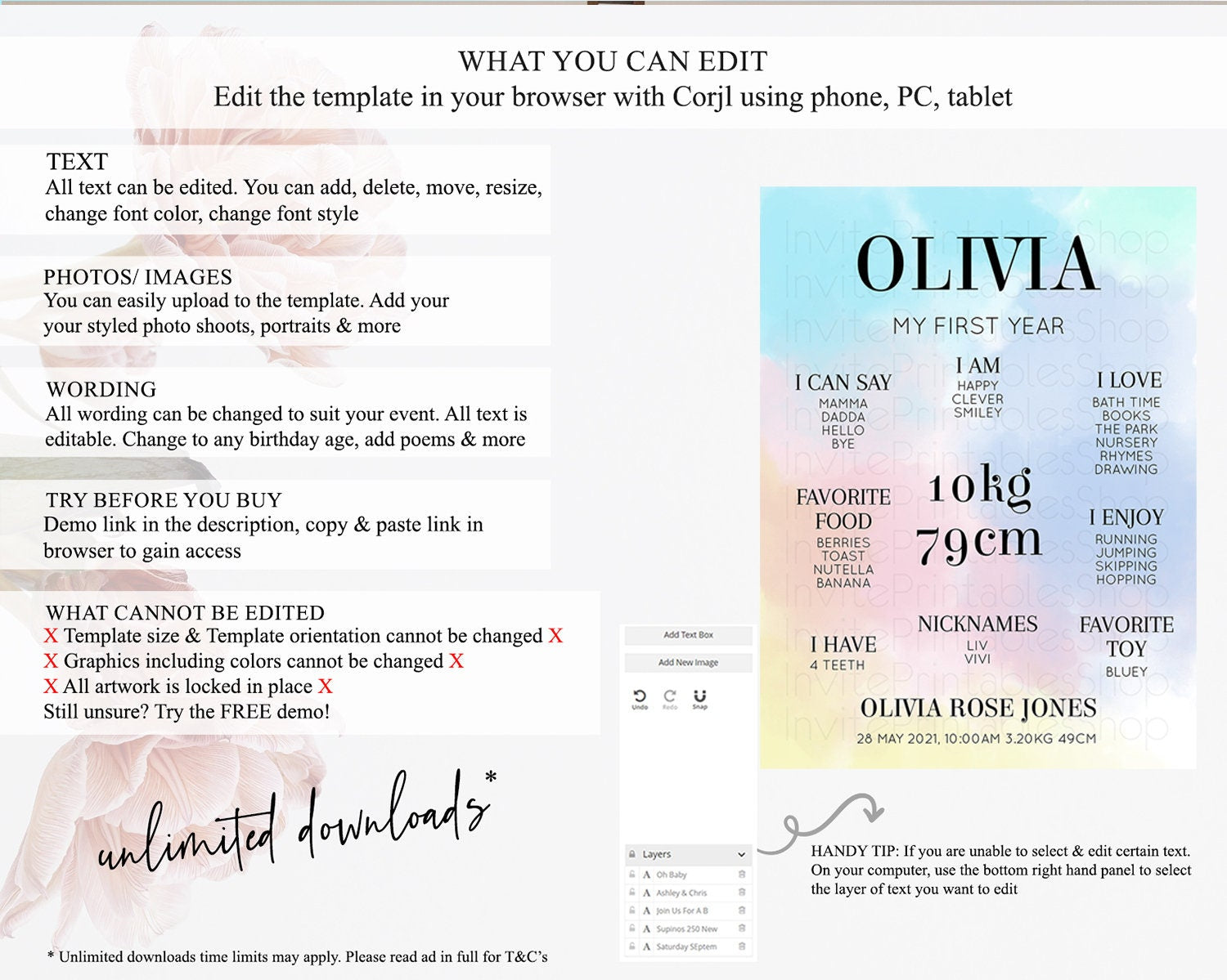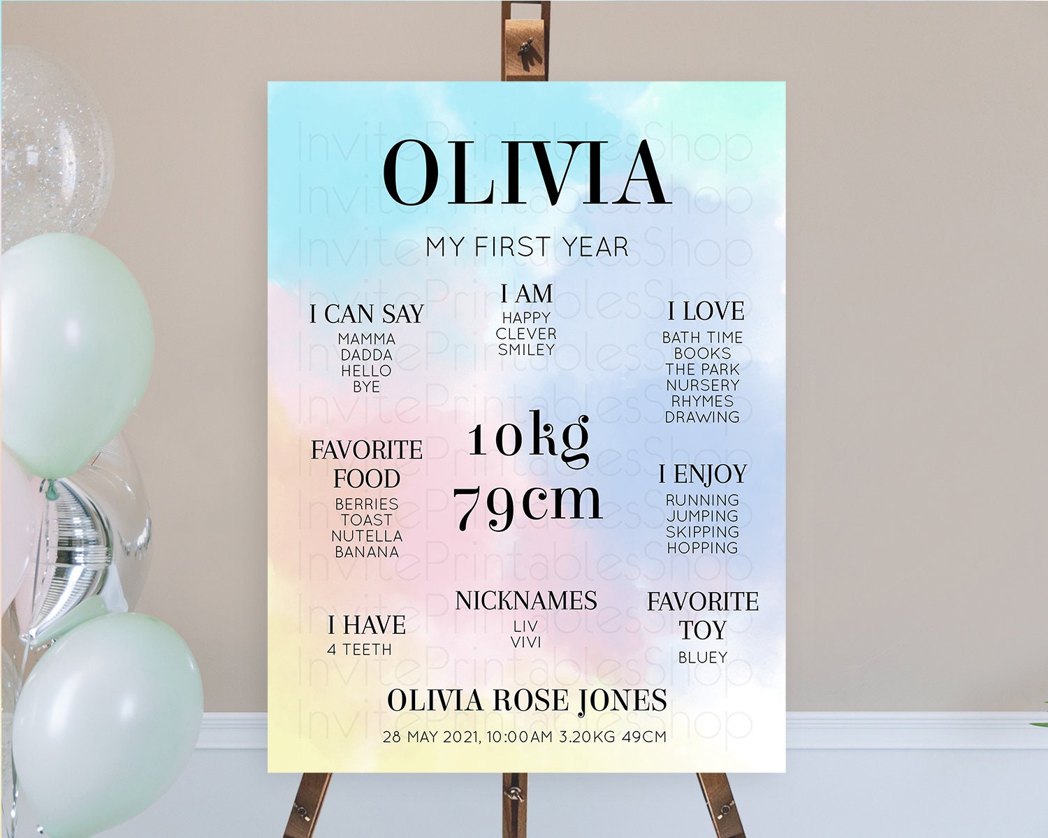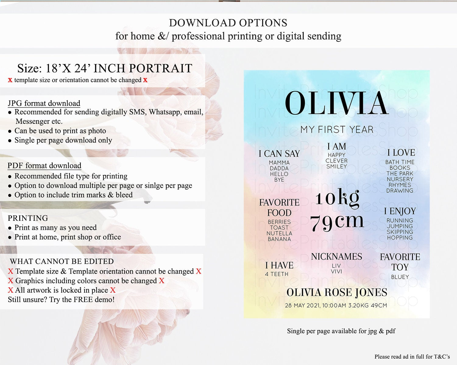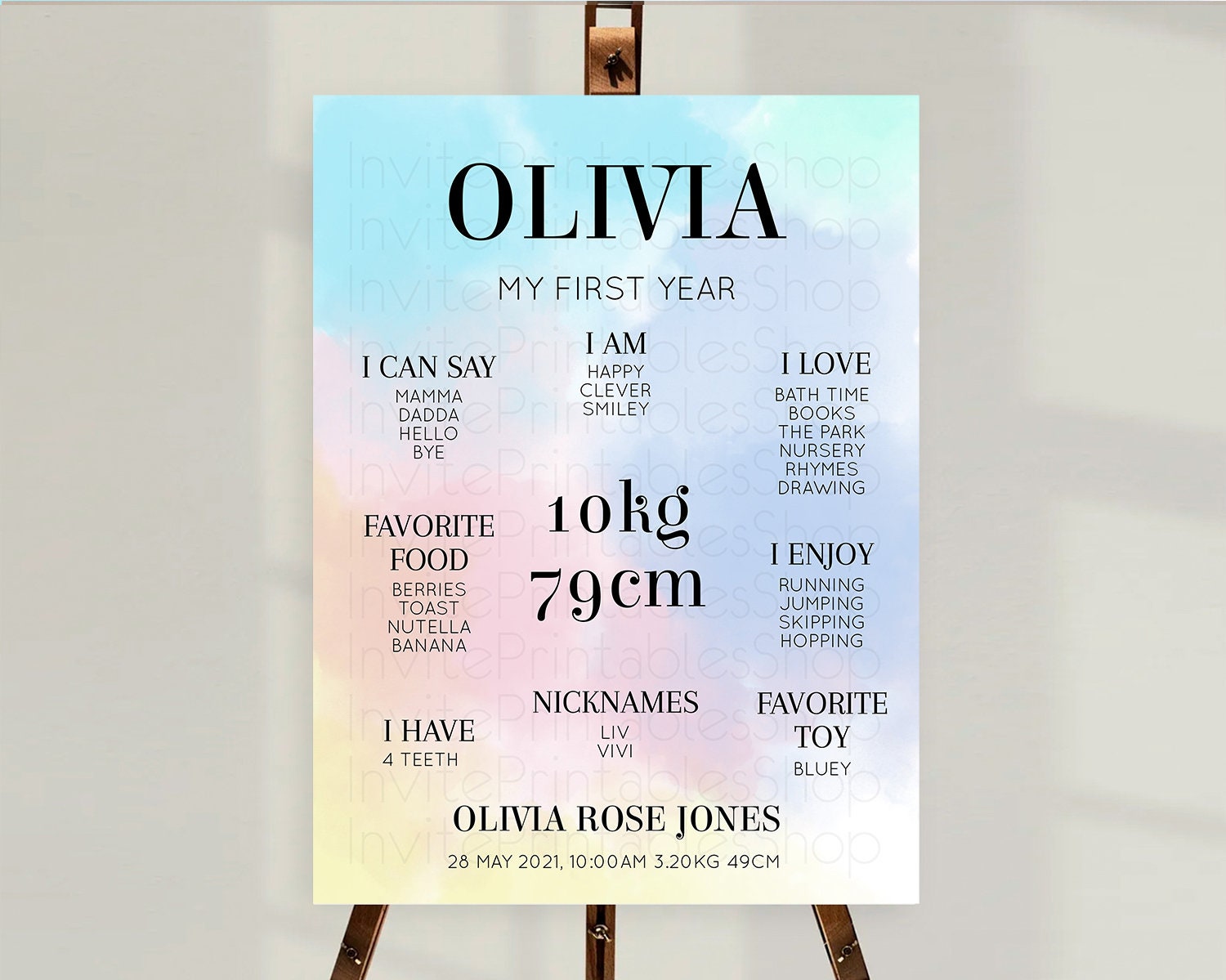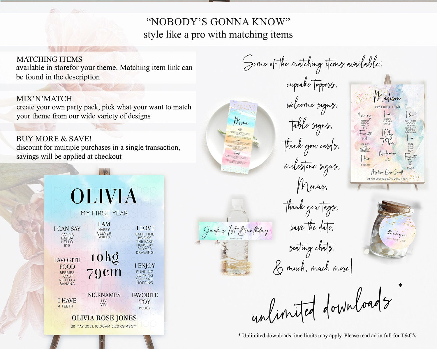 Pastel First Birthday Milestone Board Pastel Rainbow Milestone Poster Colorful Confetti Watercolor Glitter 1st Birthday Welcome Sign D10373