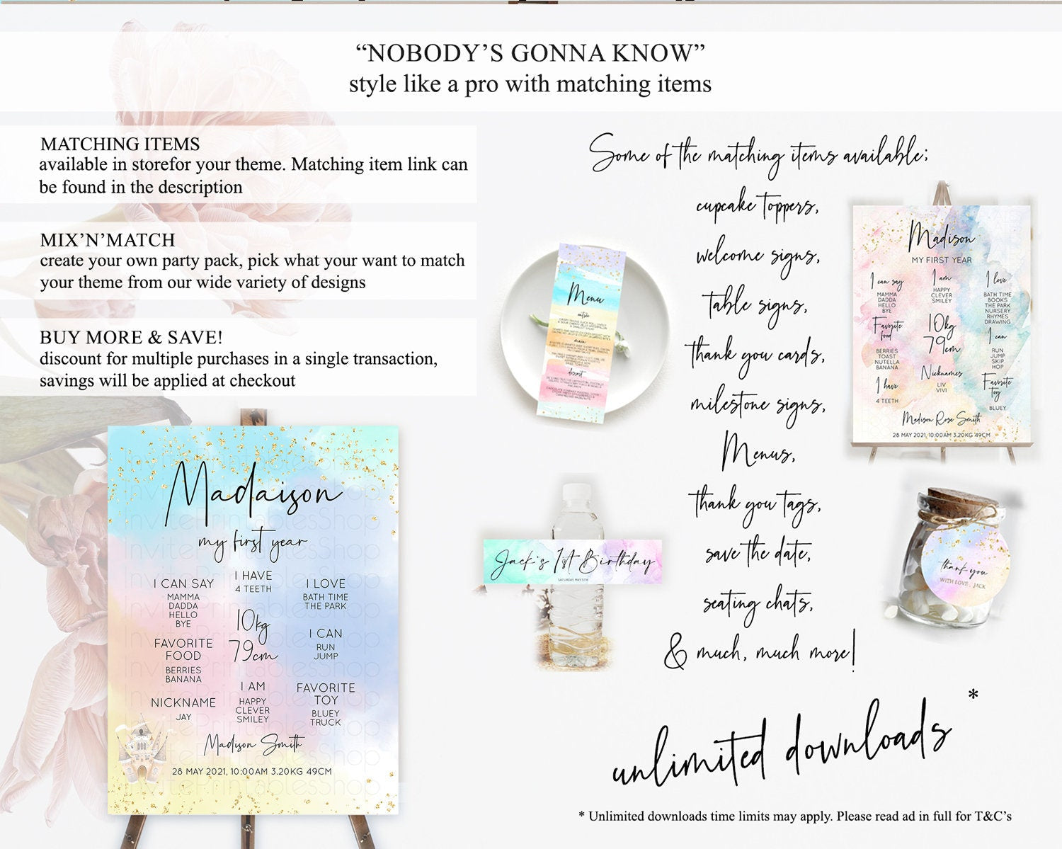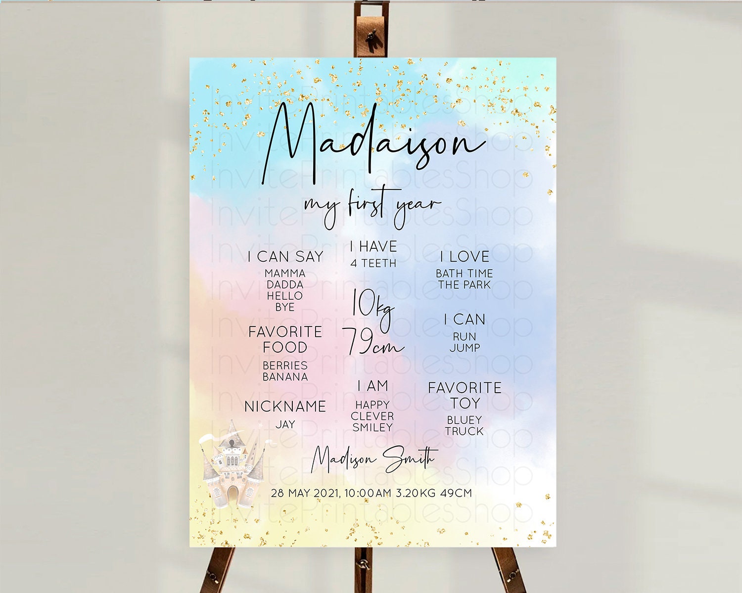 Pastel First Birthday Milestone Board Pastel Rainbow Milestone Poster Colorful Confetti Watercolor Glitter 1st Birthday Welcome Sign D10376