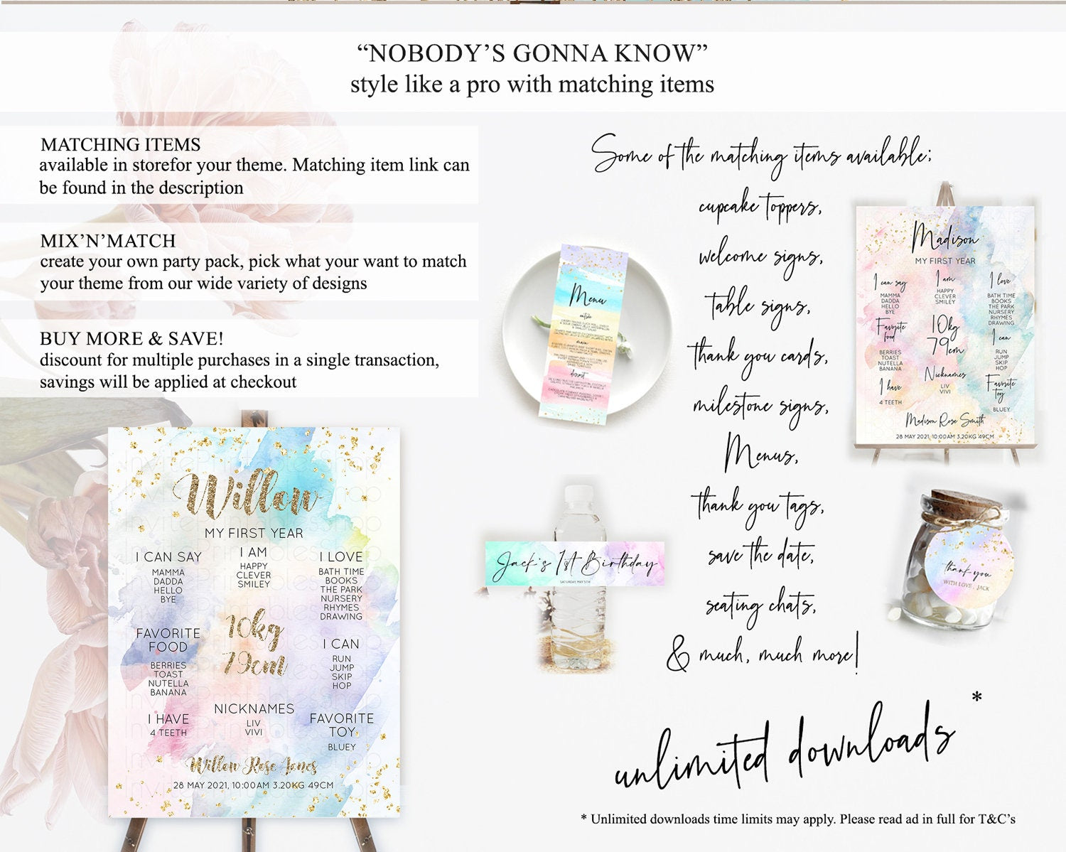 Pastel First Birthday Milestone Board Pastel Rainbow Milestone Poster Colorful Confetti Watercolor Glitter 1st Birthday Welcome Sign D10421