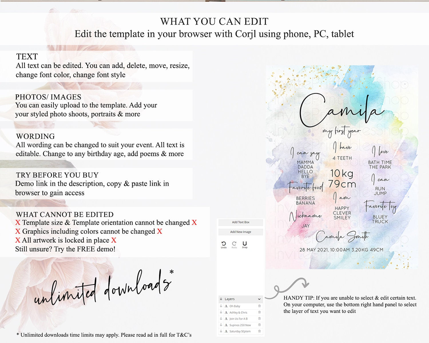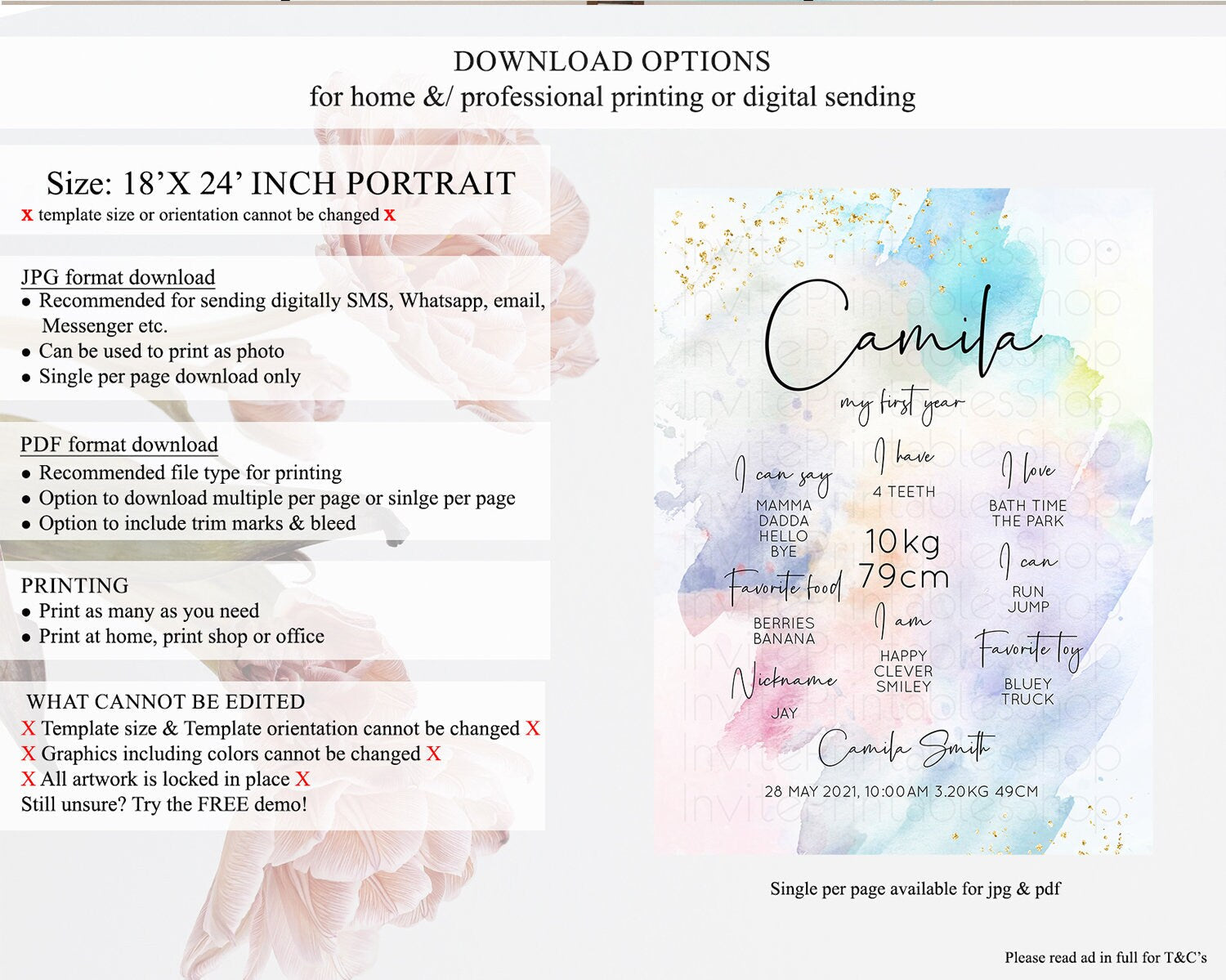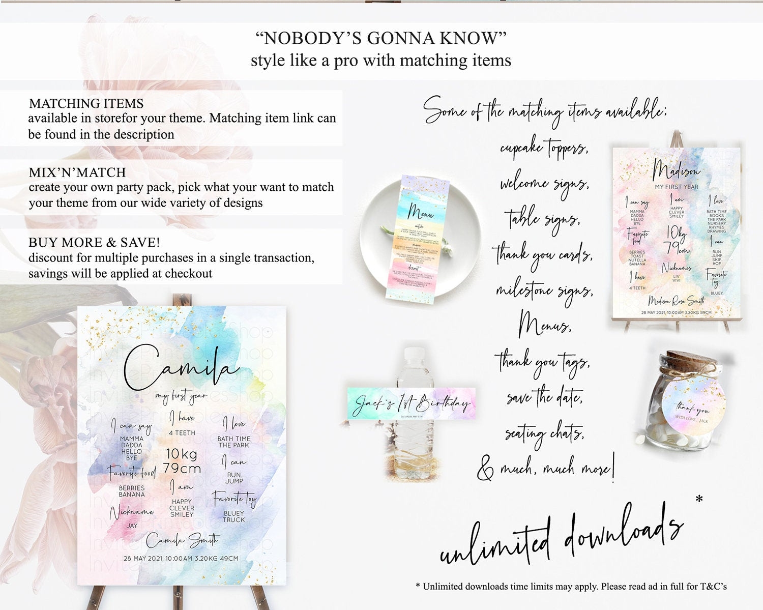 Pastel First Birthday Milestone Board Pastel Rainbow Milestone Poster Colorful Confetti Watercolor Glitter 1st Birthday Welcome Sign D10422