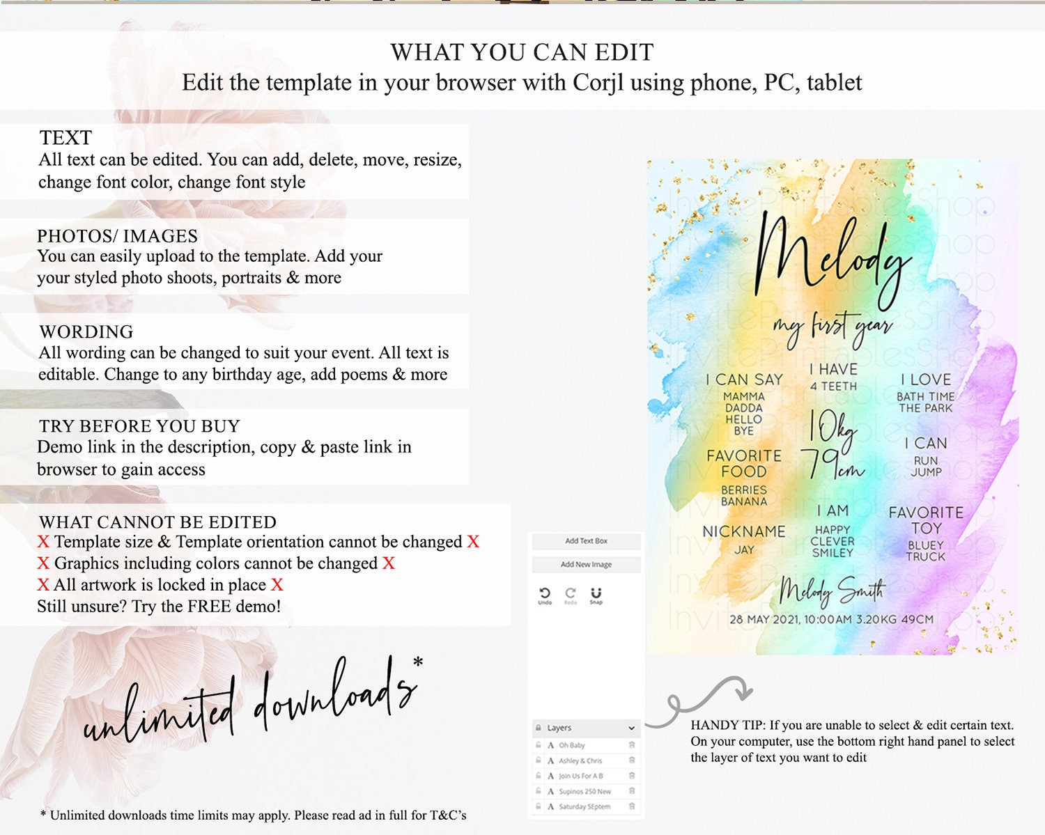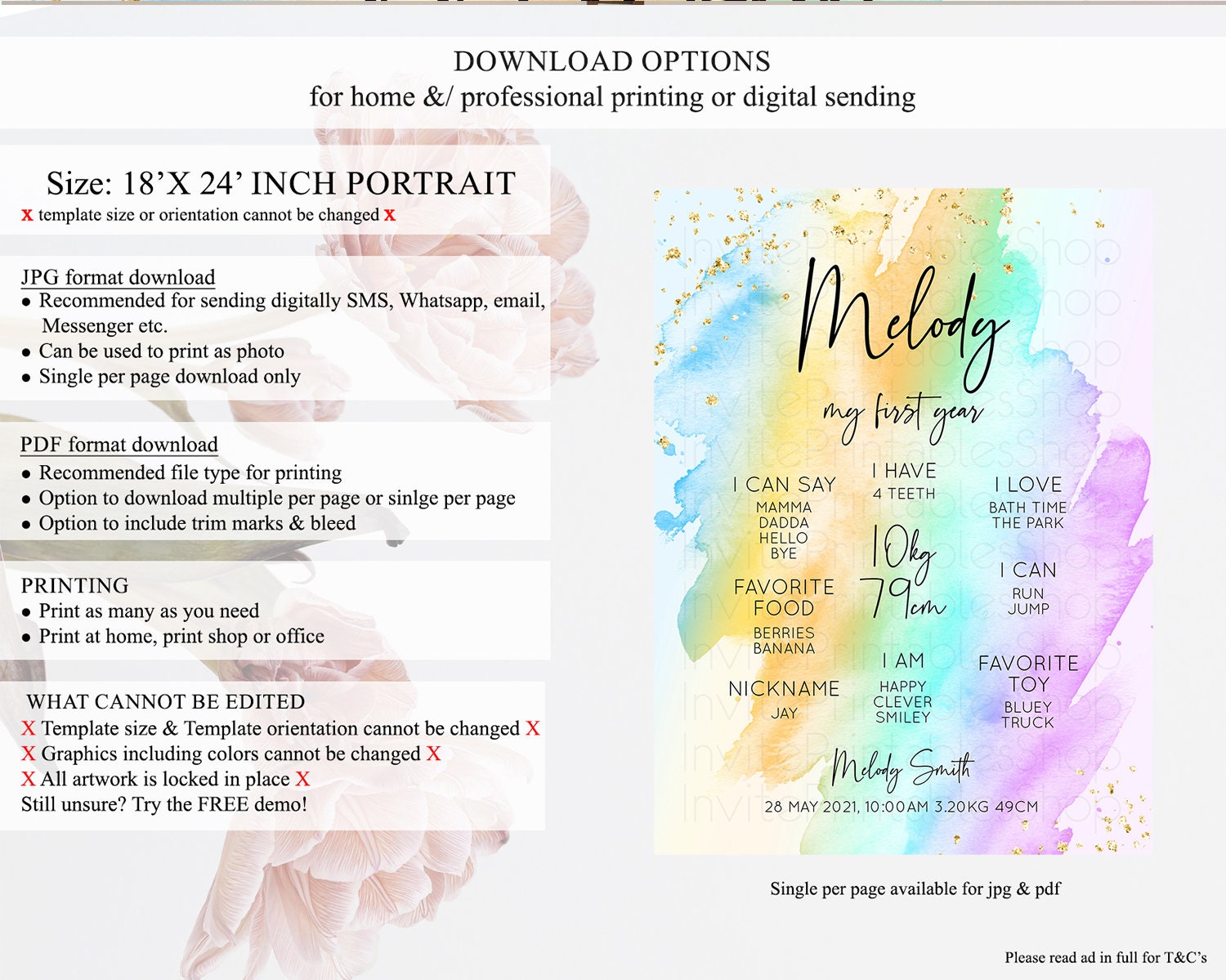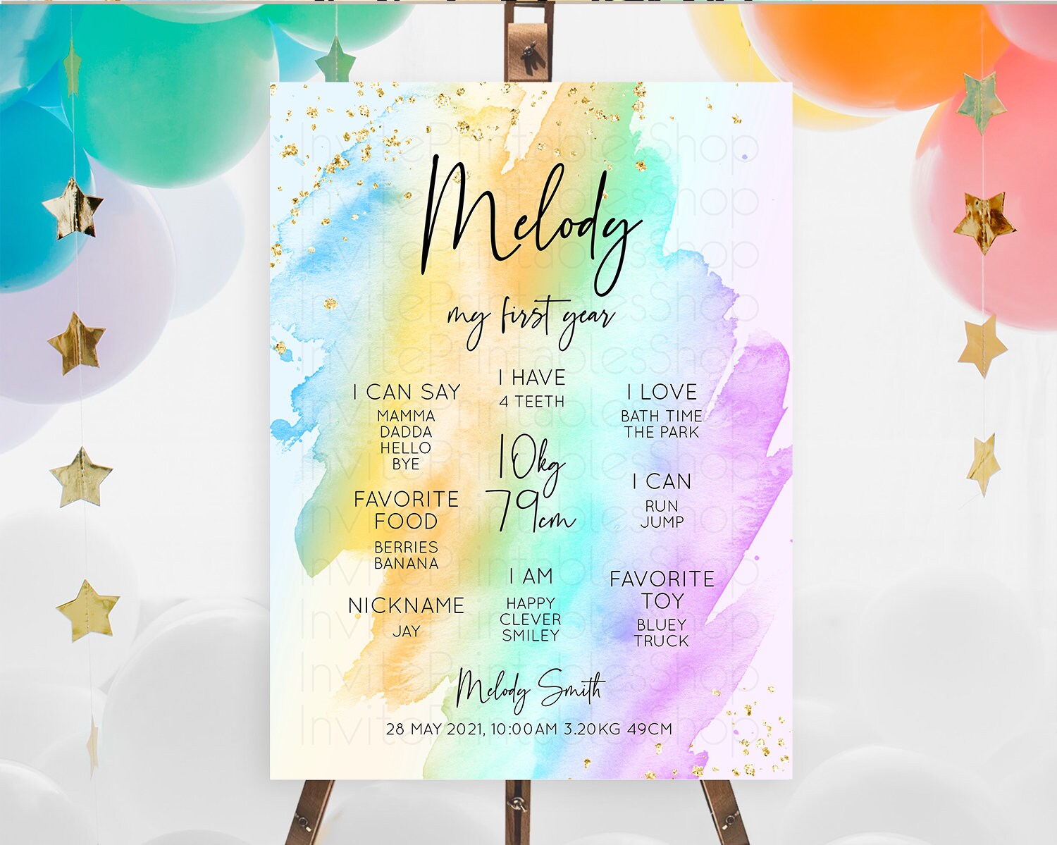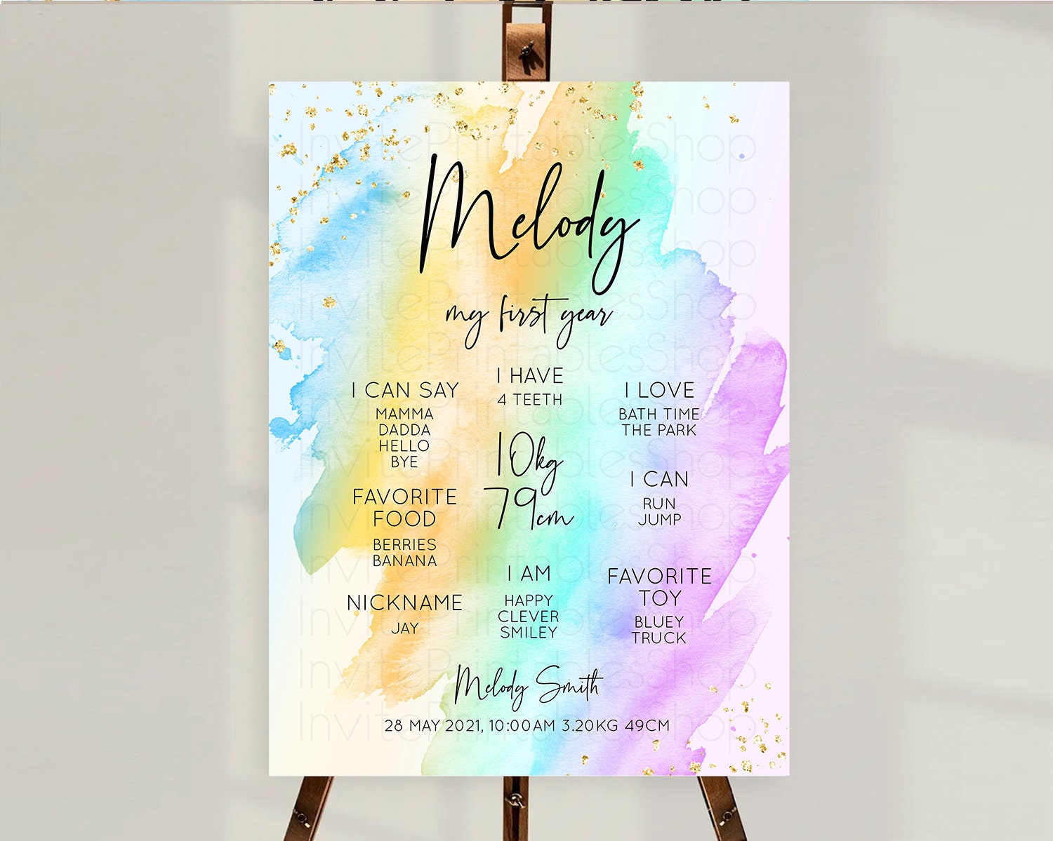 Pastel First Birthday Milestone Board Pastel Rainbow Milestone Poster Colorful Confetti Watercolor Glitter 1st Birthday Welcome Sign D10425