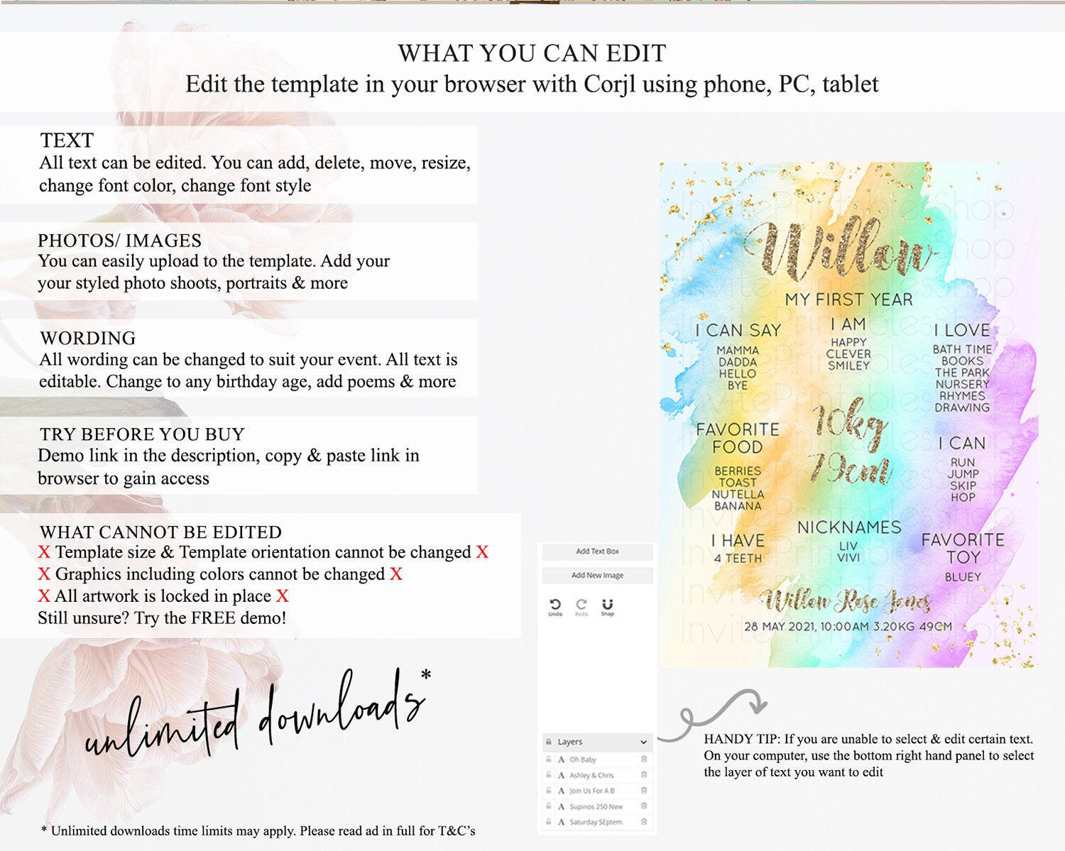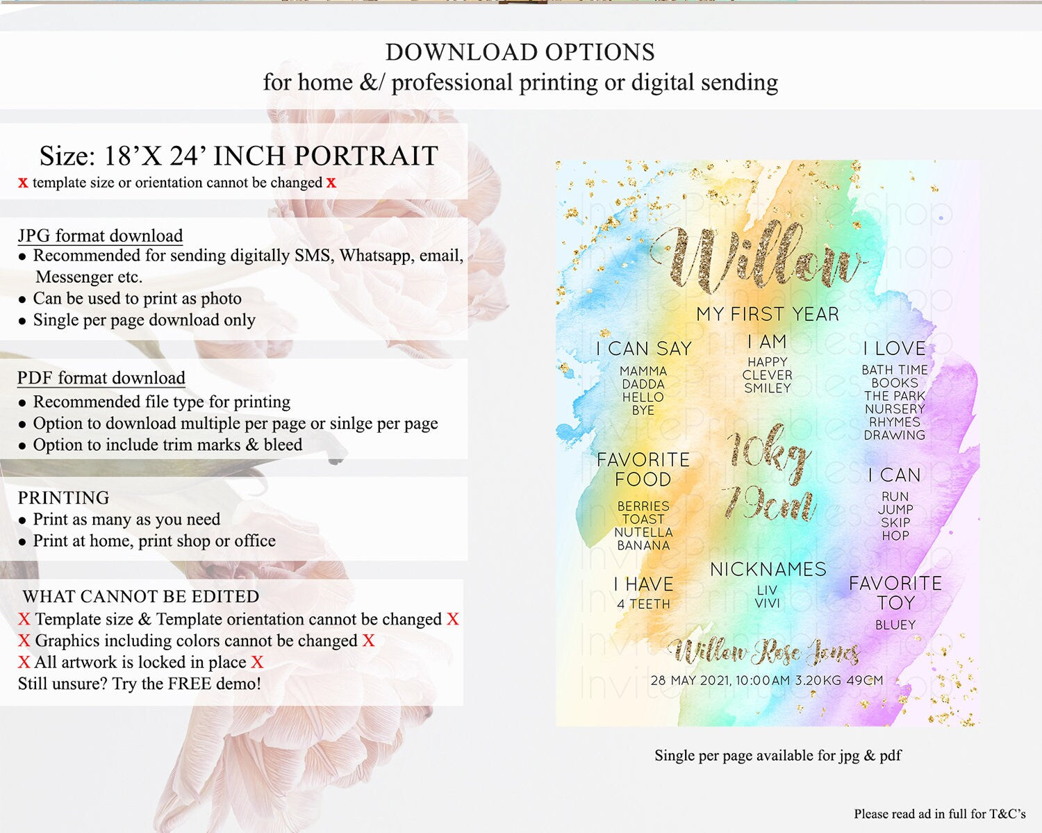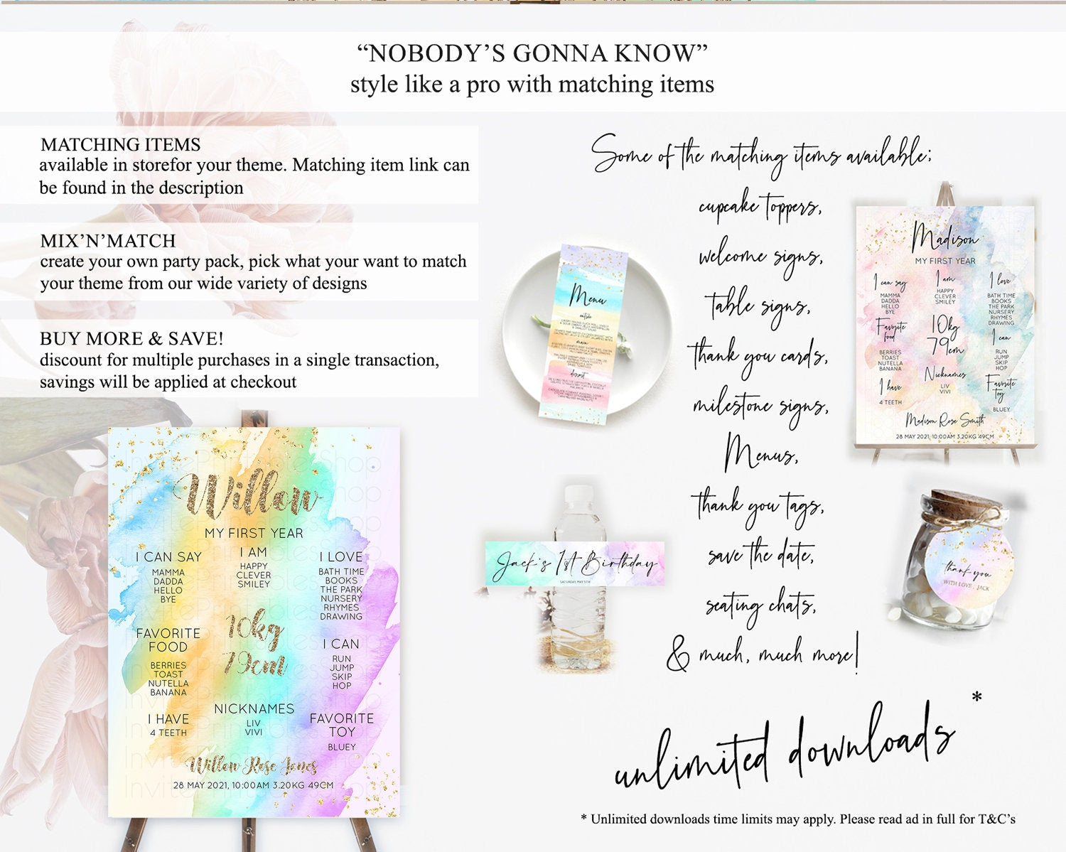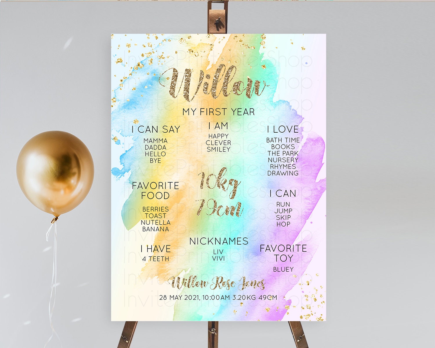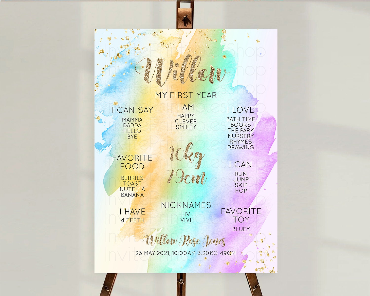 Pastel First Birthday Milestone Board Pastel Rainbow Milestone Poster Colorful Confetti Watercolor Glitter 1st Birthday Welcome Sign D10426