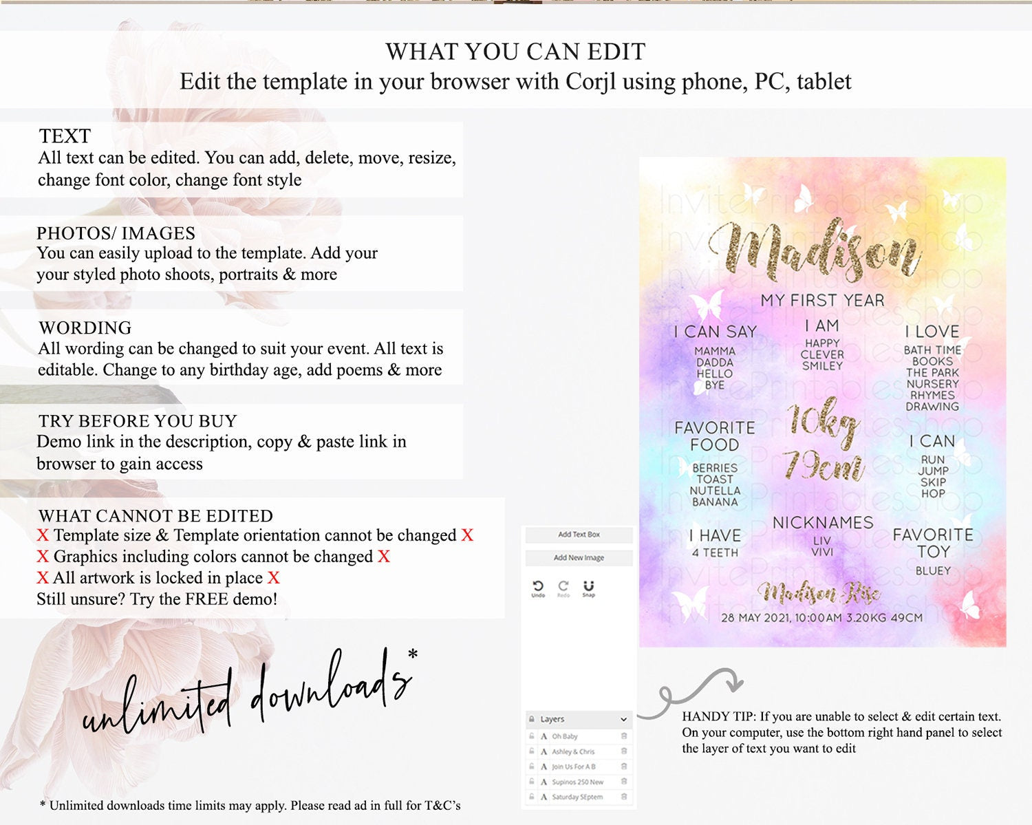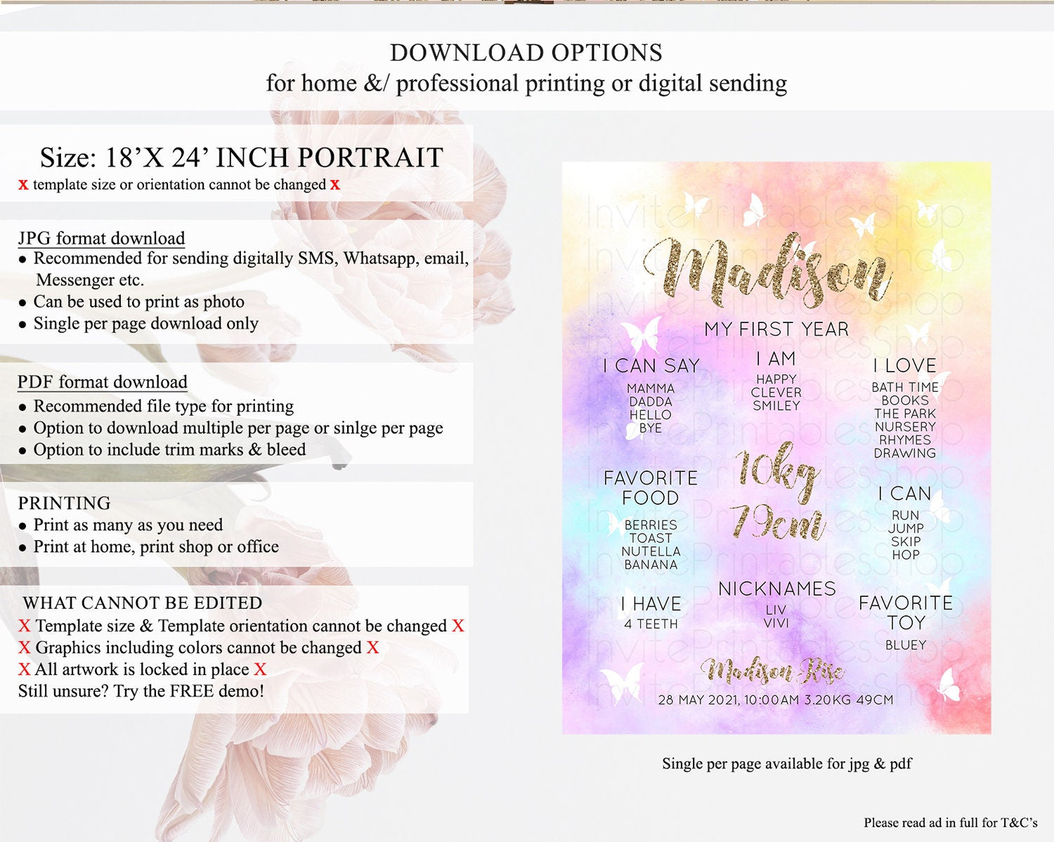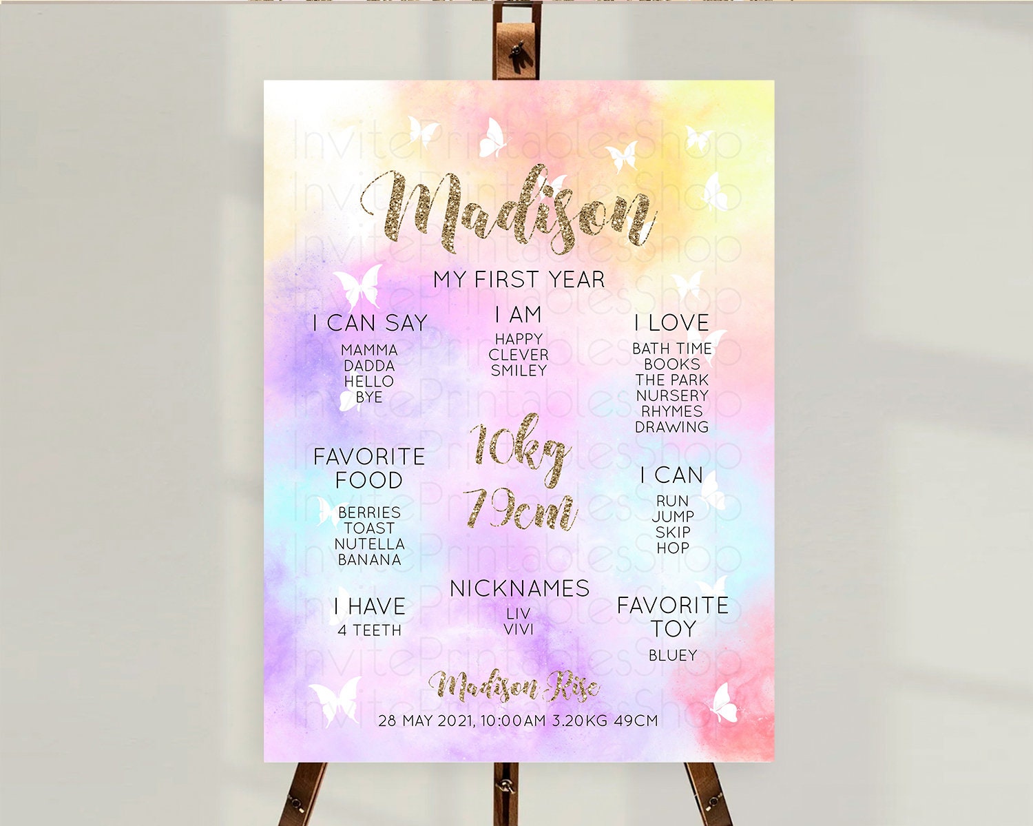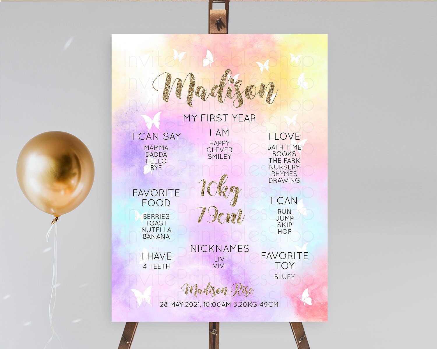 Pastel First Birthday Milestone Board Pastel Rainbow Milestone Poster Colorful Confetti Watercolor Glitter 1st Birthday Welcome Sign D10435