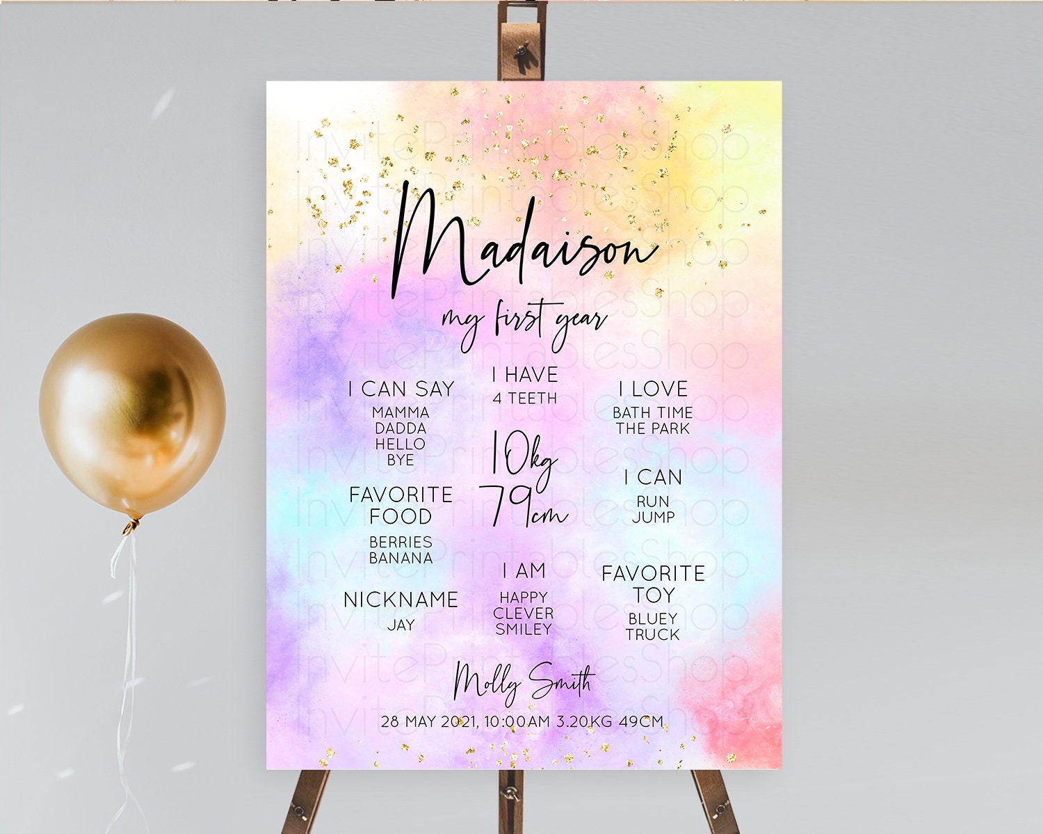 Pastel First Birthday Milestone Board Pastel Rainbow Milestone Poster Colorful Confetti Watercolor Glitter 1st Birthday Welcome Sign D10437
