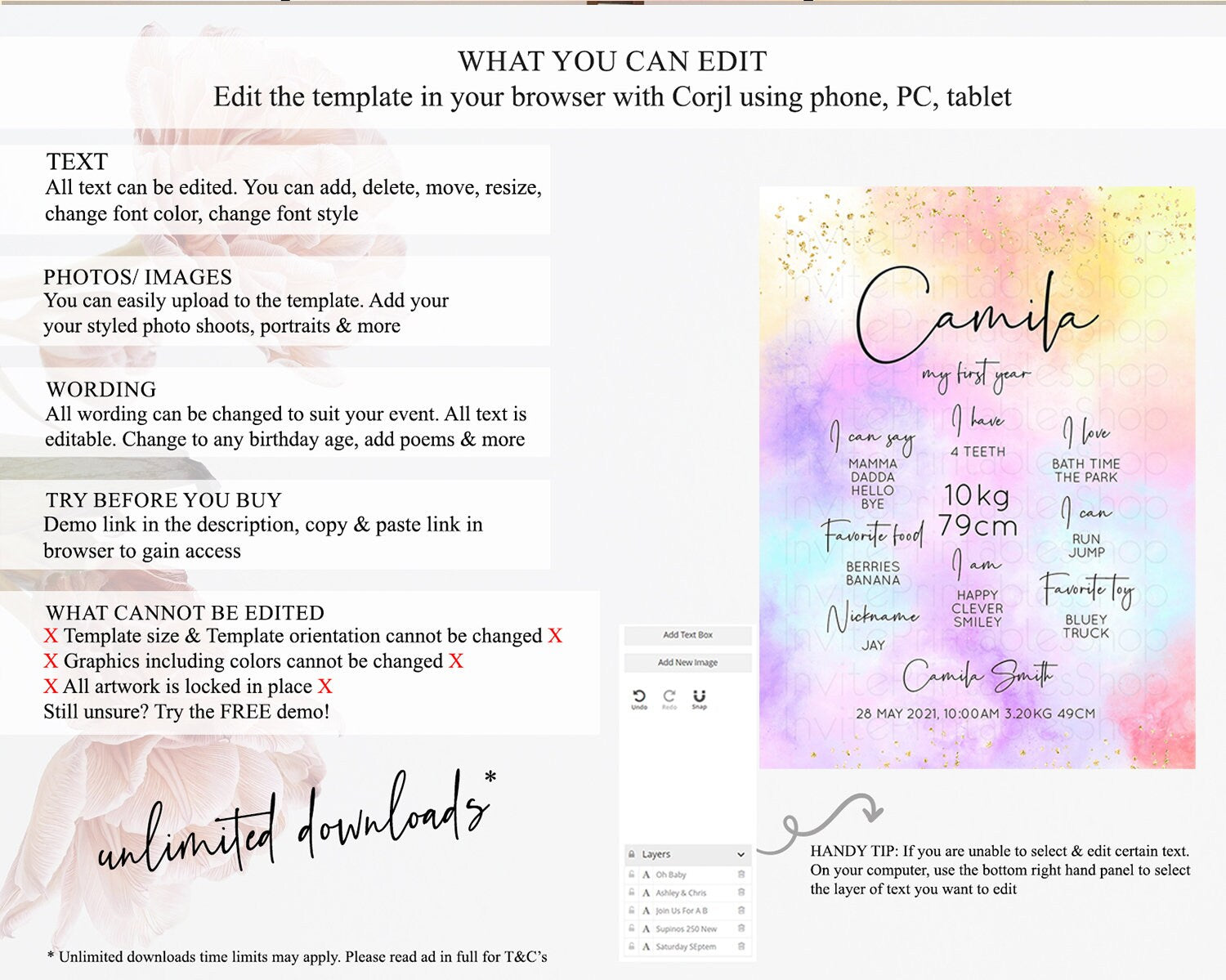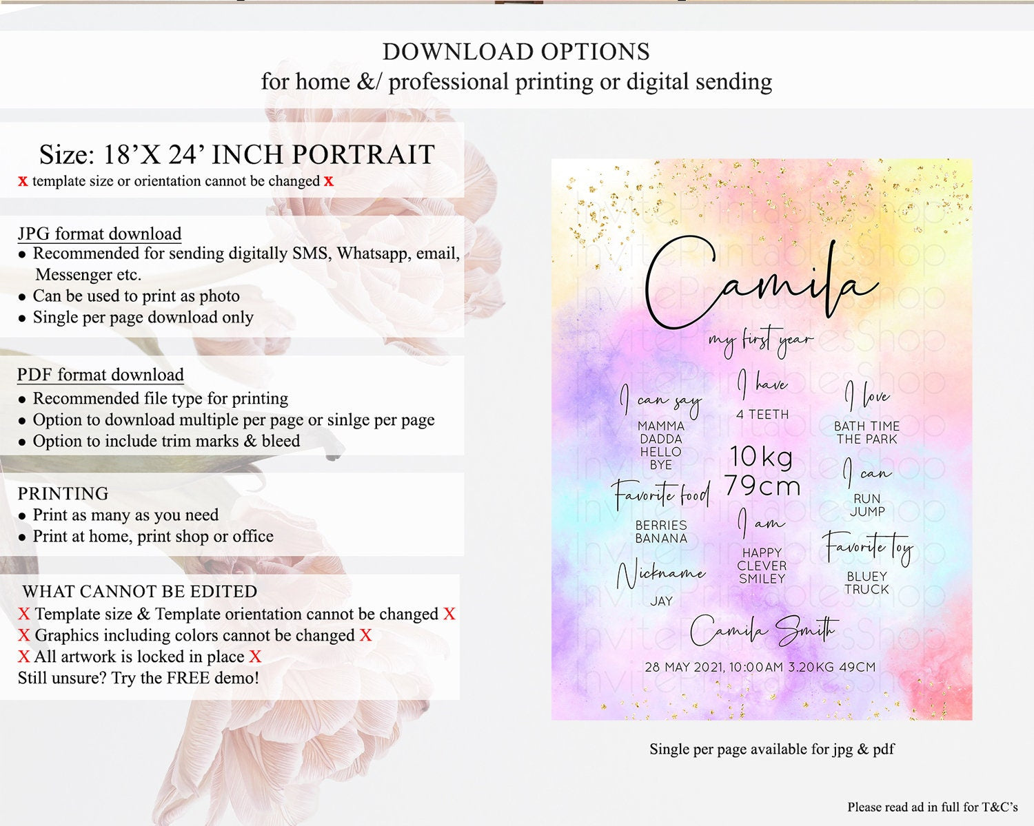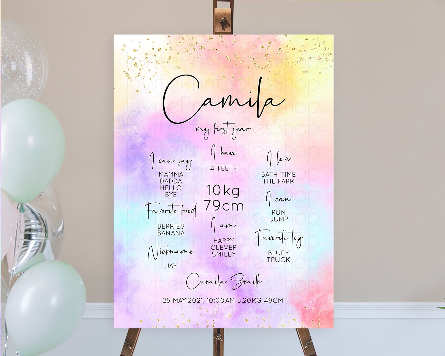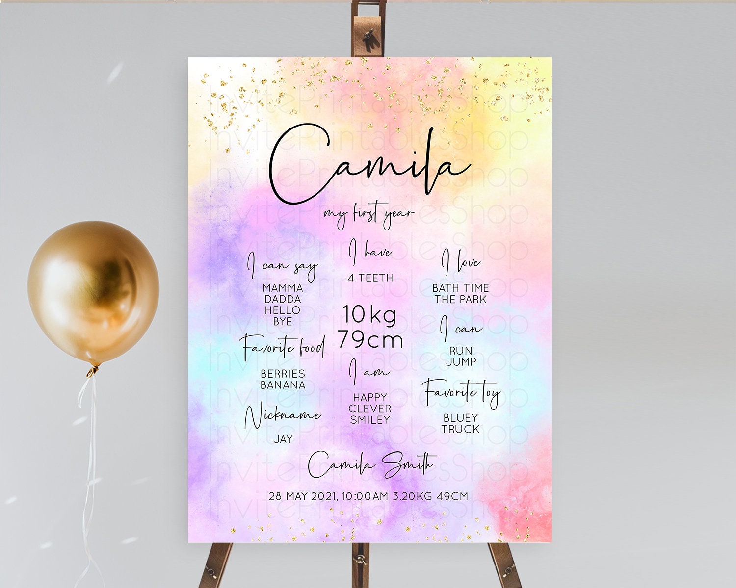 Pastel First Birthday Milestone Board Pastel Rainbow Milestone Poster Colorful Confetti Watercolor Glitter 1st Birthday Welcome Sign D10438