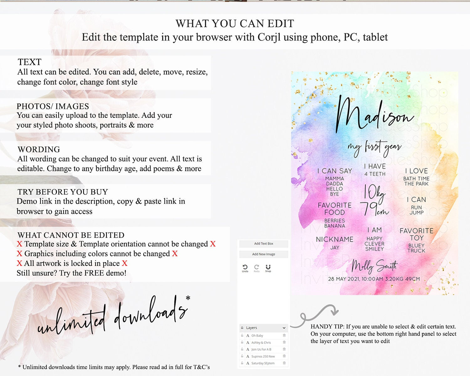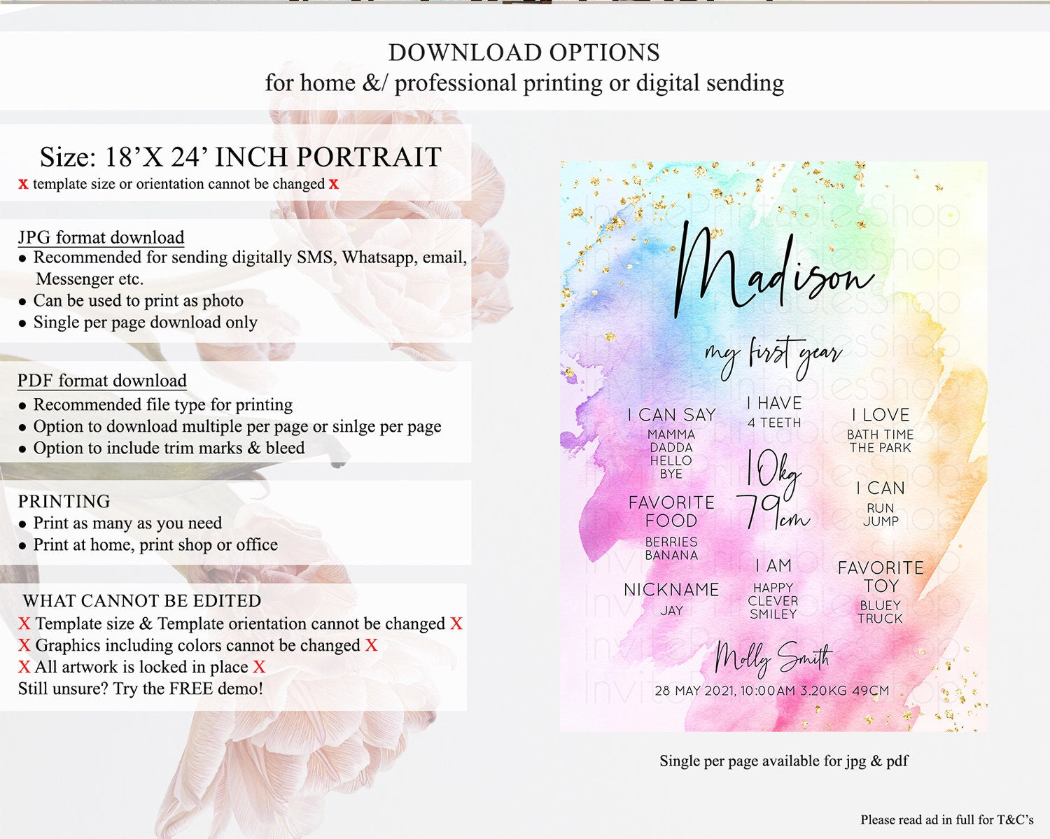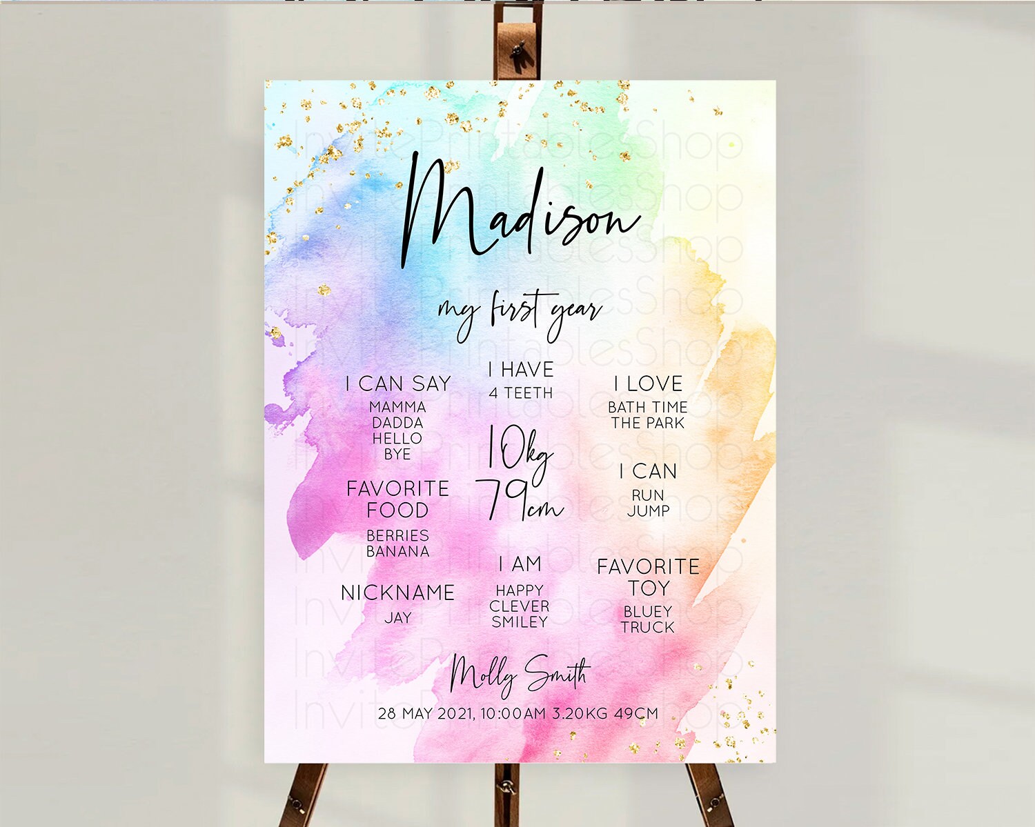 Pastel First Birthday Milestone Board Pastel Rainbow Milestone Poster Colorful Confetti Watercolor Glitter 1st Birthday Welcome Sign D10449