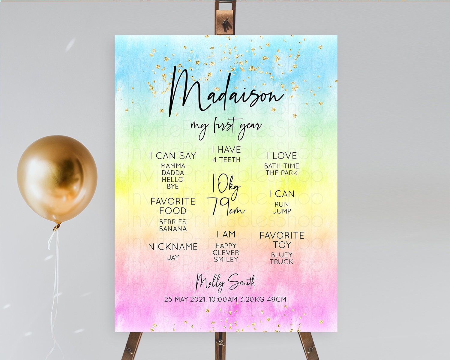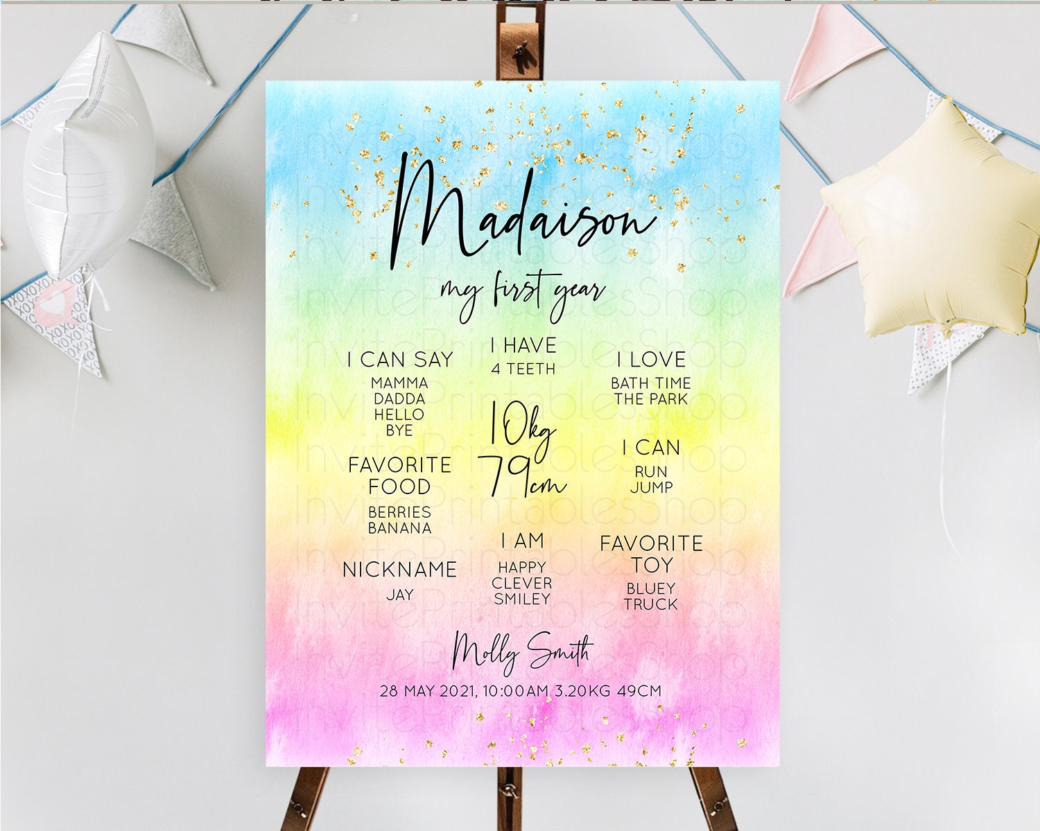 Pastel First Birthday Milestone Board Pastel Rainbow Milestone Poster Colorful Confetti Watercolor Glitter 1st Birthday Welcome Sign D10480