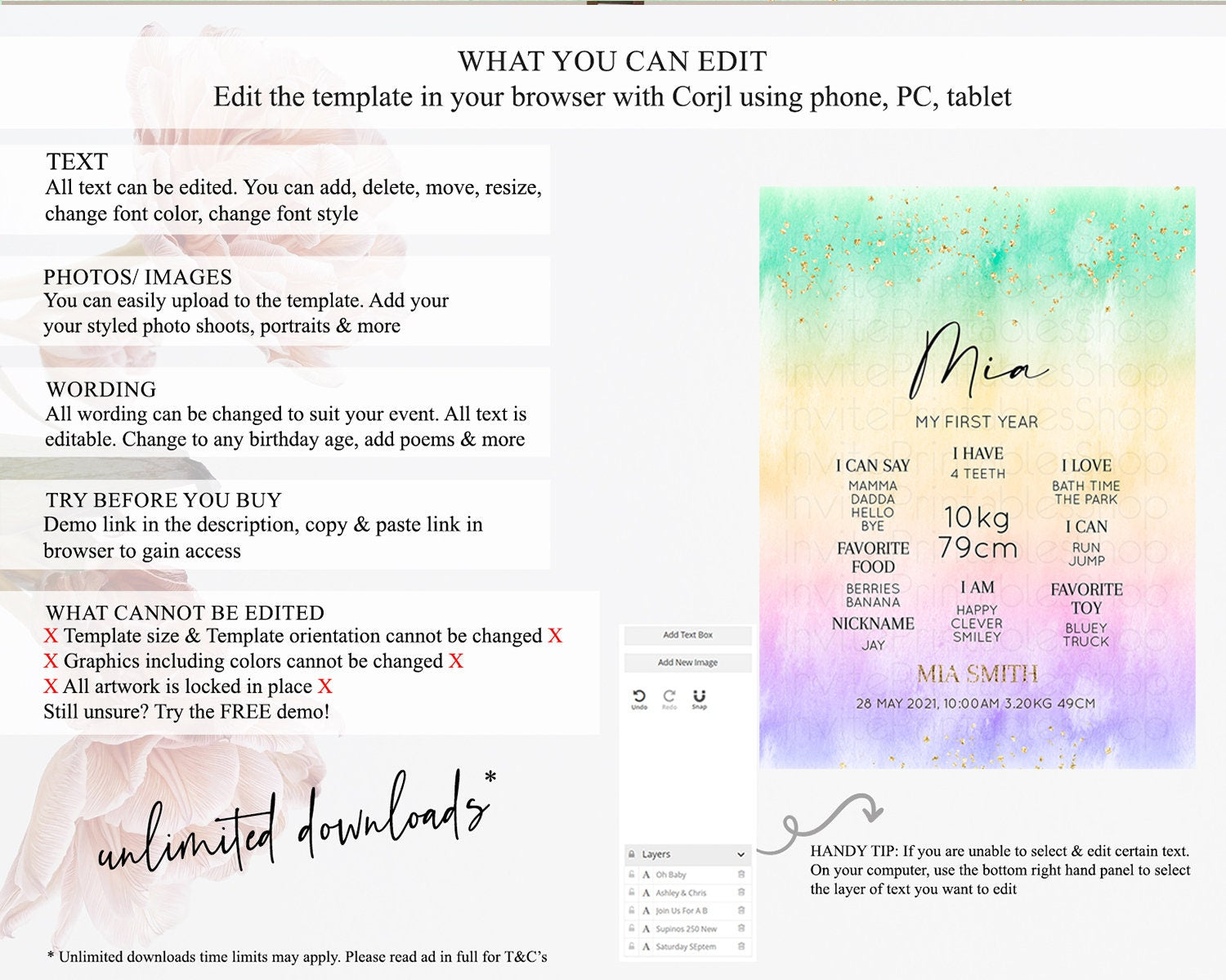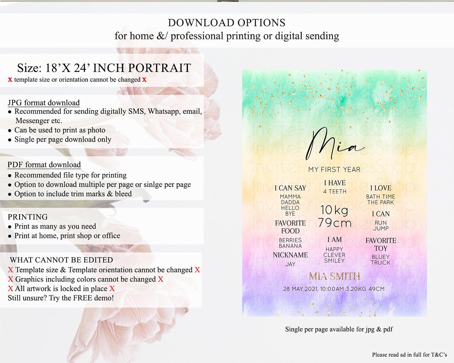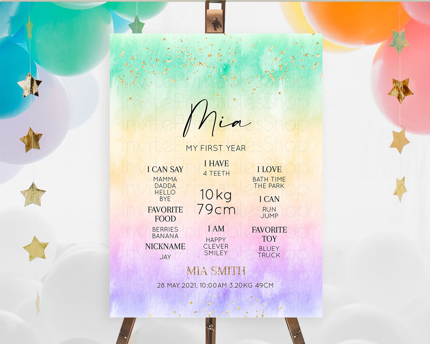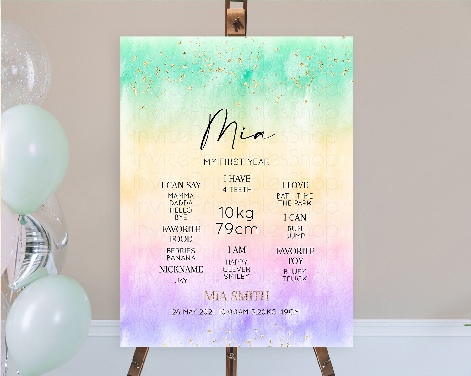 Pastel First Birthday Milestone Board Pastel Rainbow Milestone Poster Colorful Confetti Watercolor Glitter 1st Birthday Welcome Sign D10481