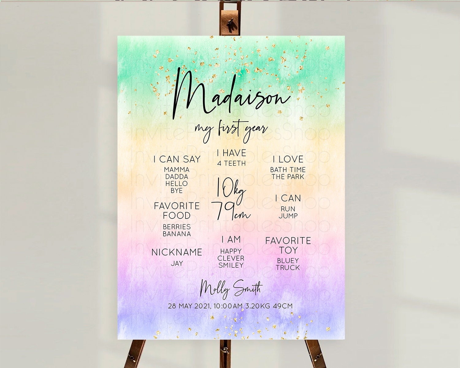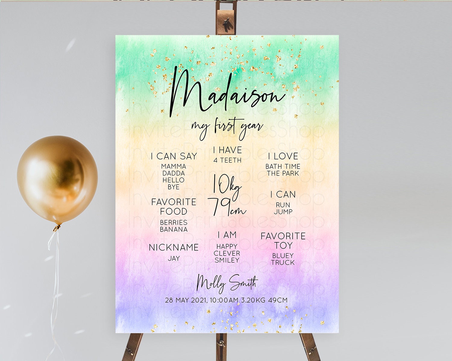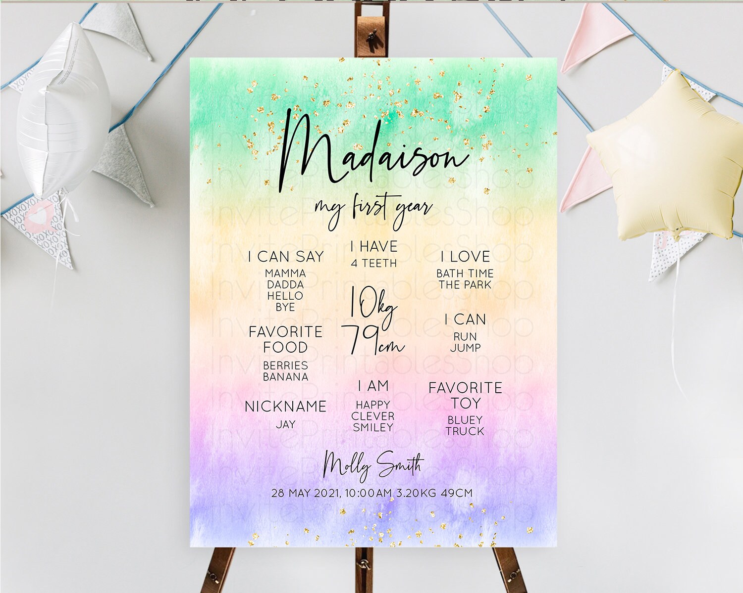 Pastel First Birthday Milestone Board Pastel Rainbow Milestone Poster Colorful Confetti Watercolor Glitter 1st Birthday Welcome Sign D10485