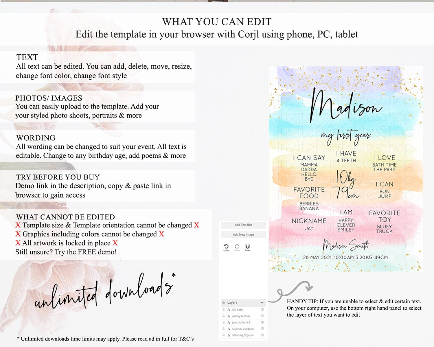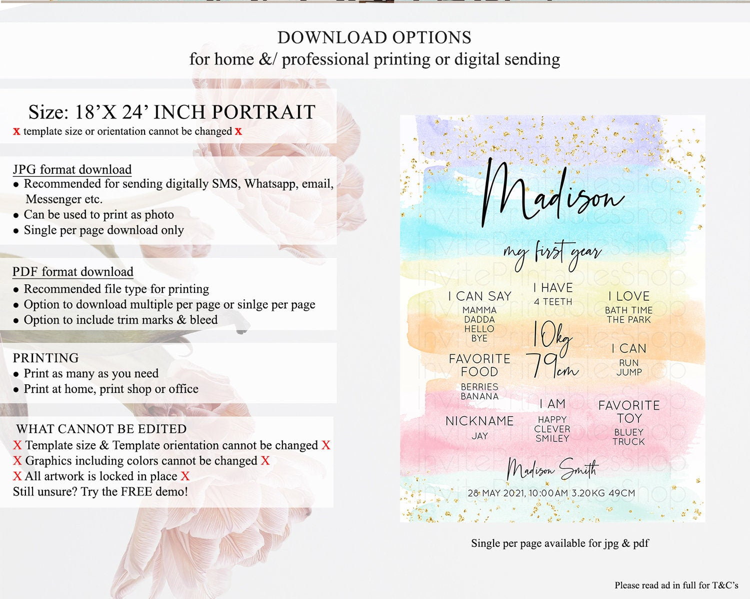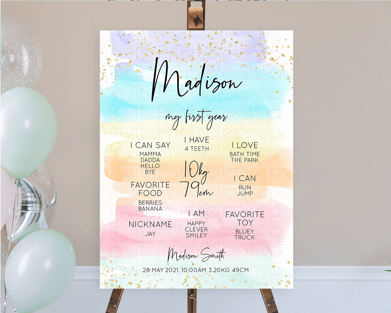 Pastel First Birthday Milestone Board Pastel Rainbow Milestone Poster Colorful Confetti Watercolor Glitter 1st Birthday Welcome Sign D10505