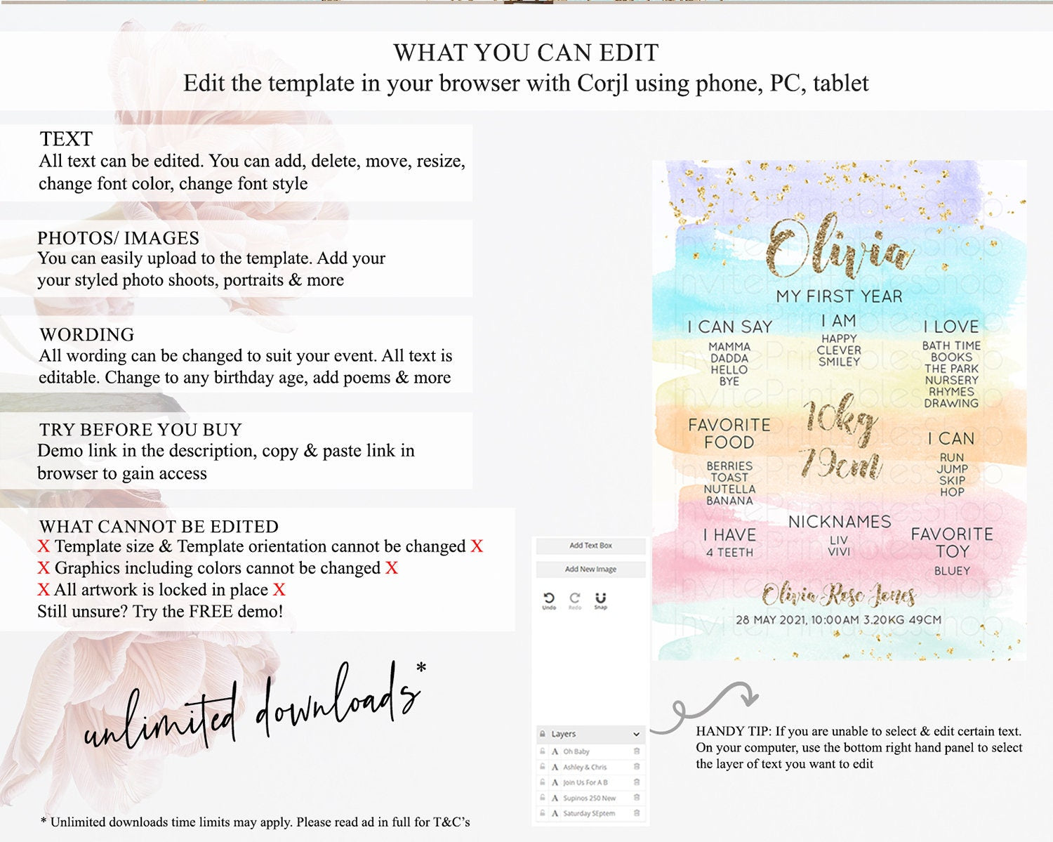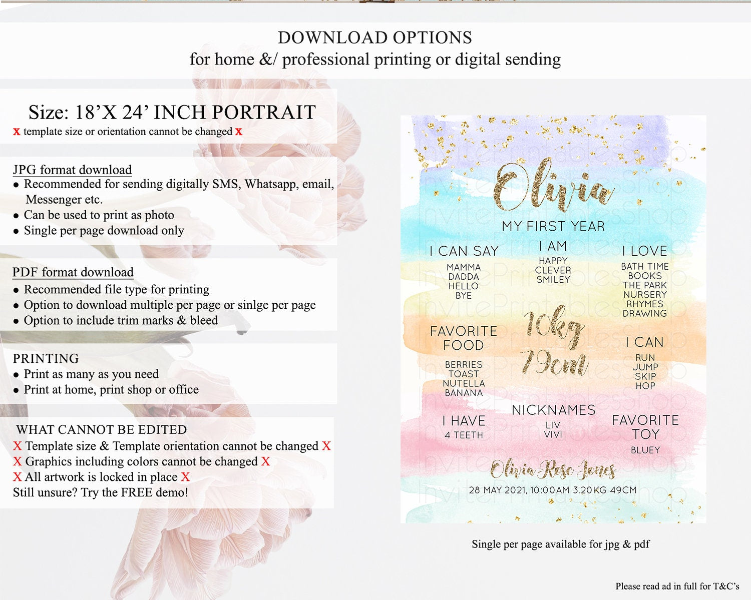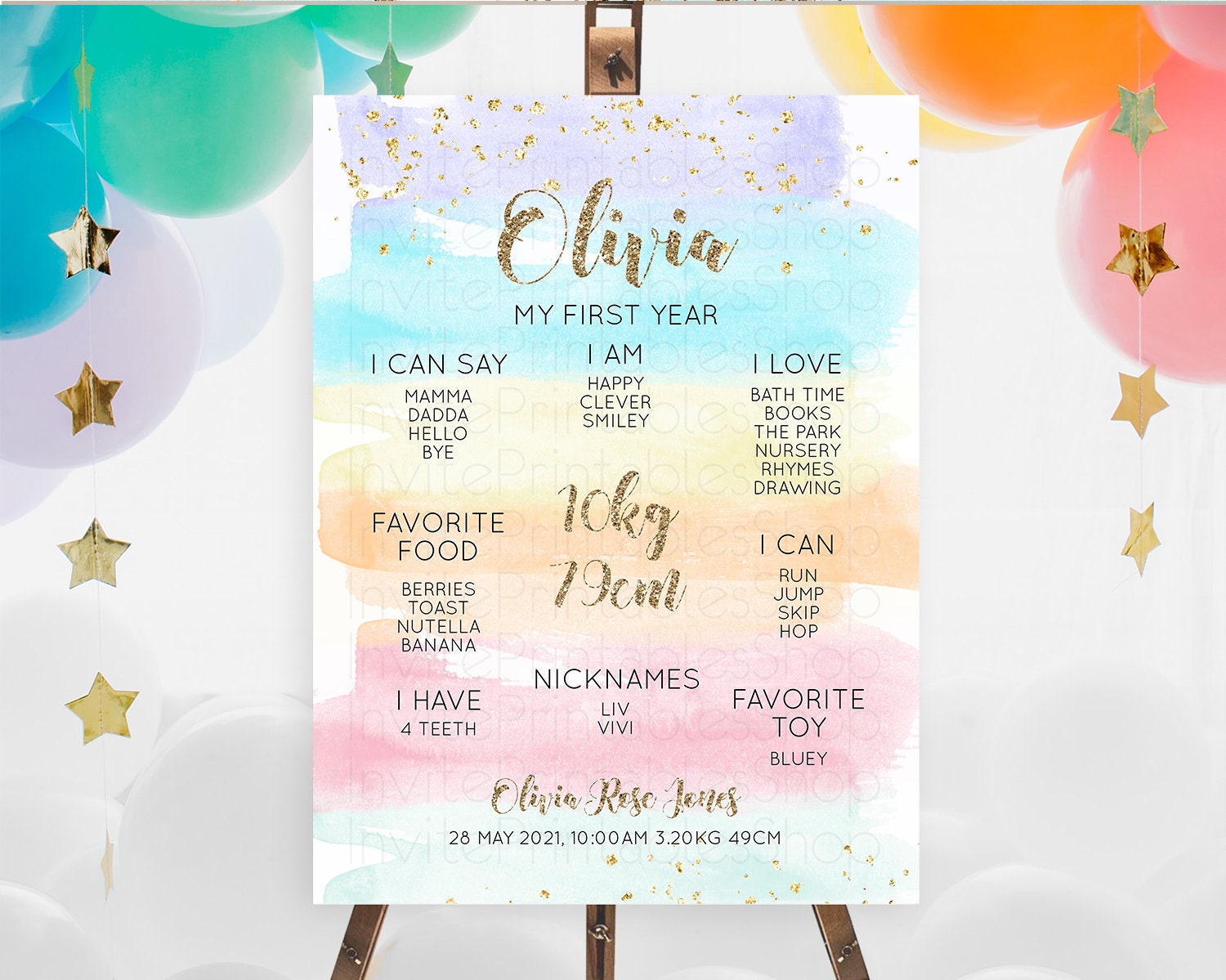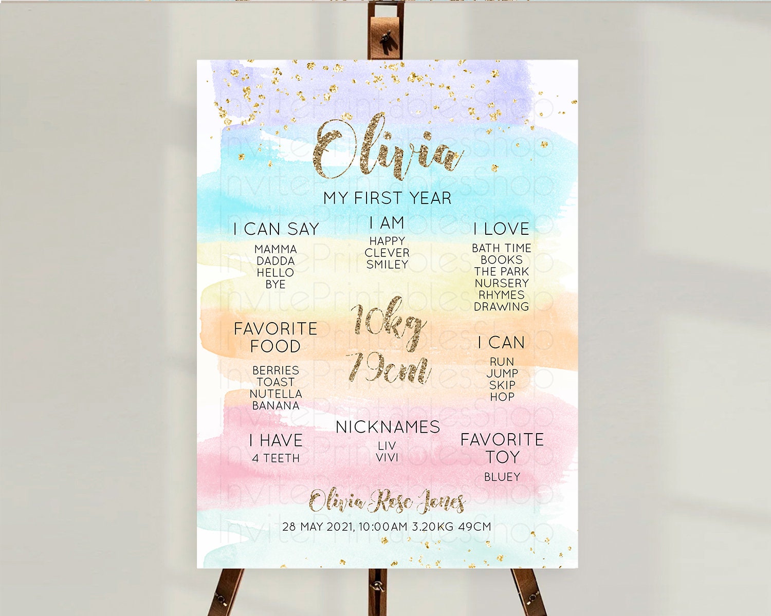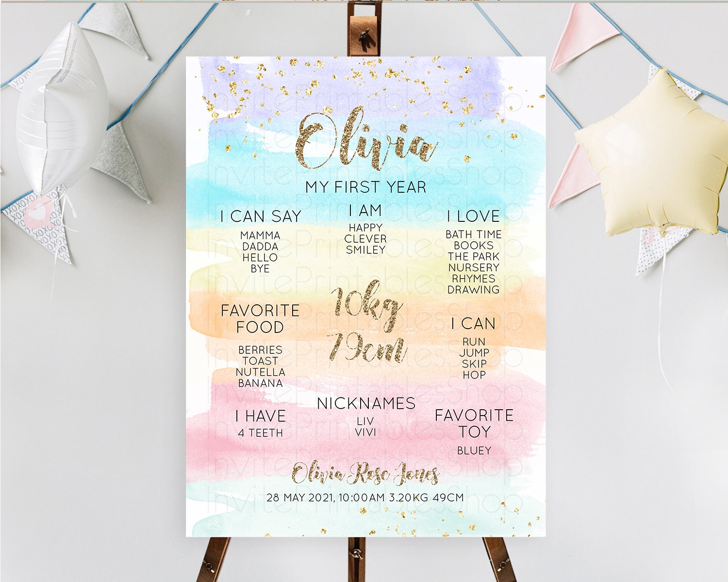 Pastel First Birthday Milestone Board Pastel Rainbow Milestone Poster Colorful Confetti Watercolor Glitter 1st Birthday Welcome Sign D10508