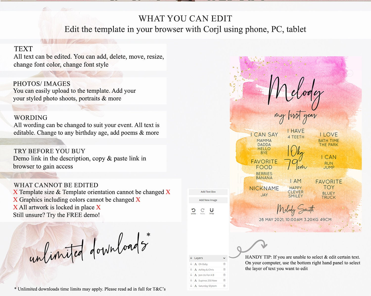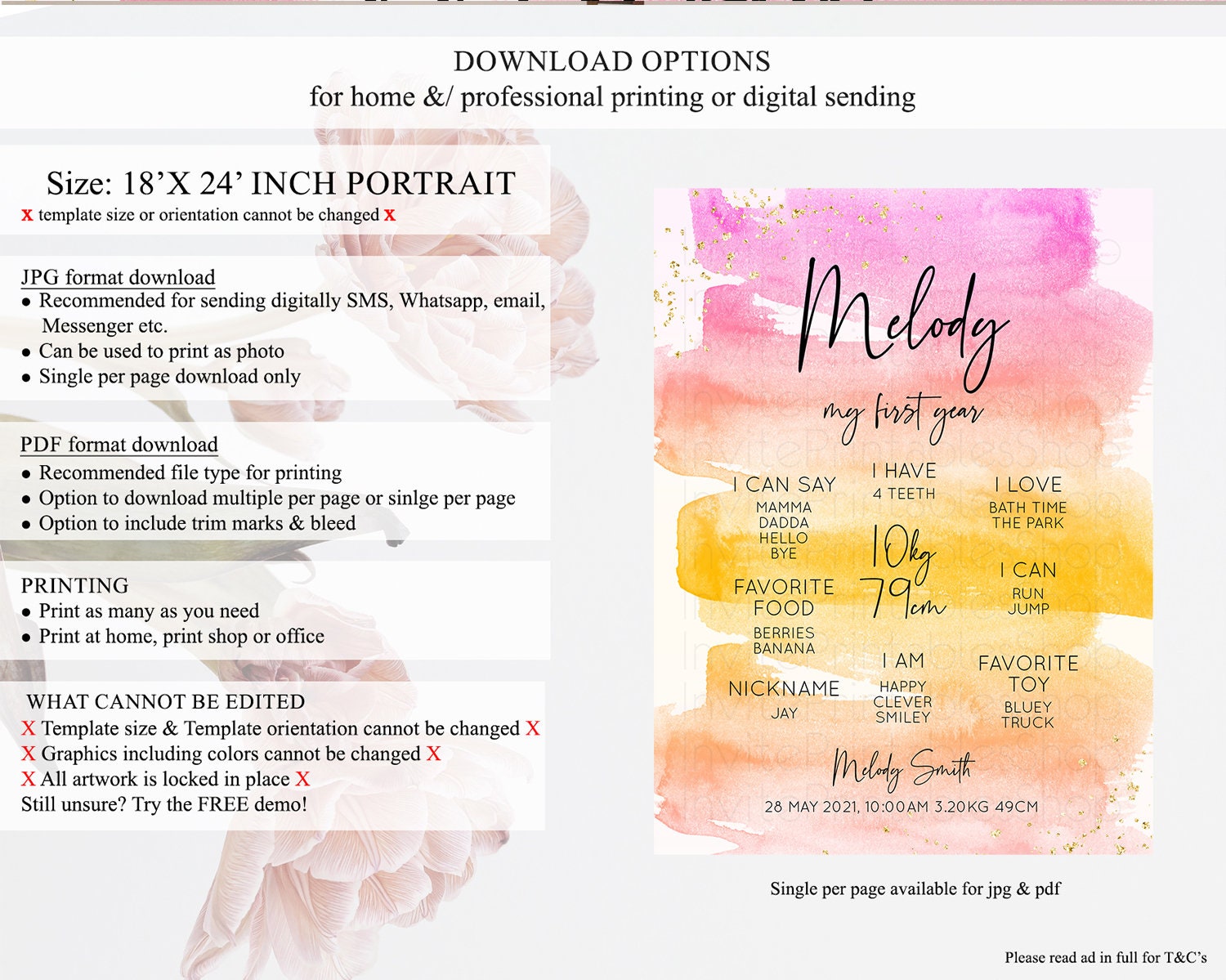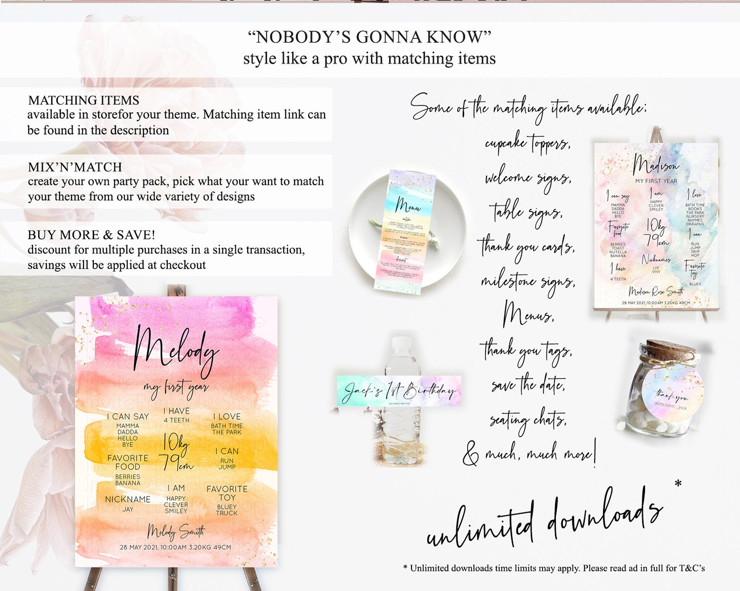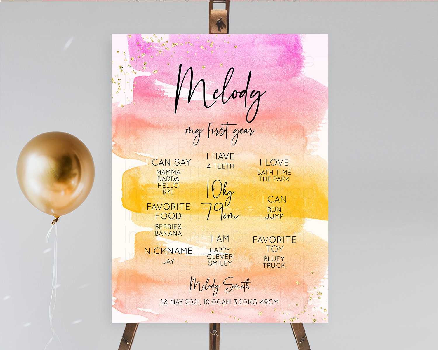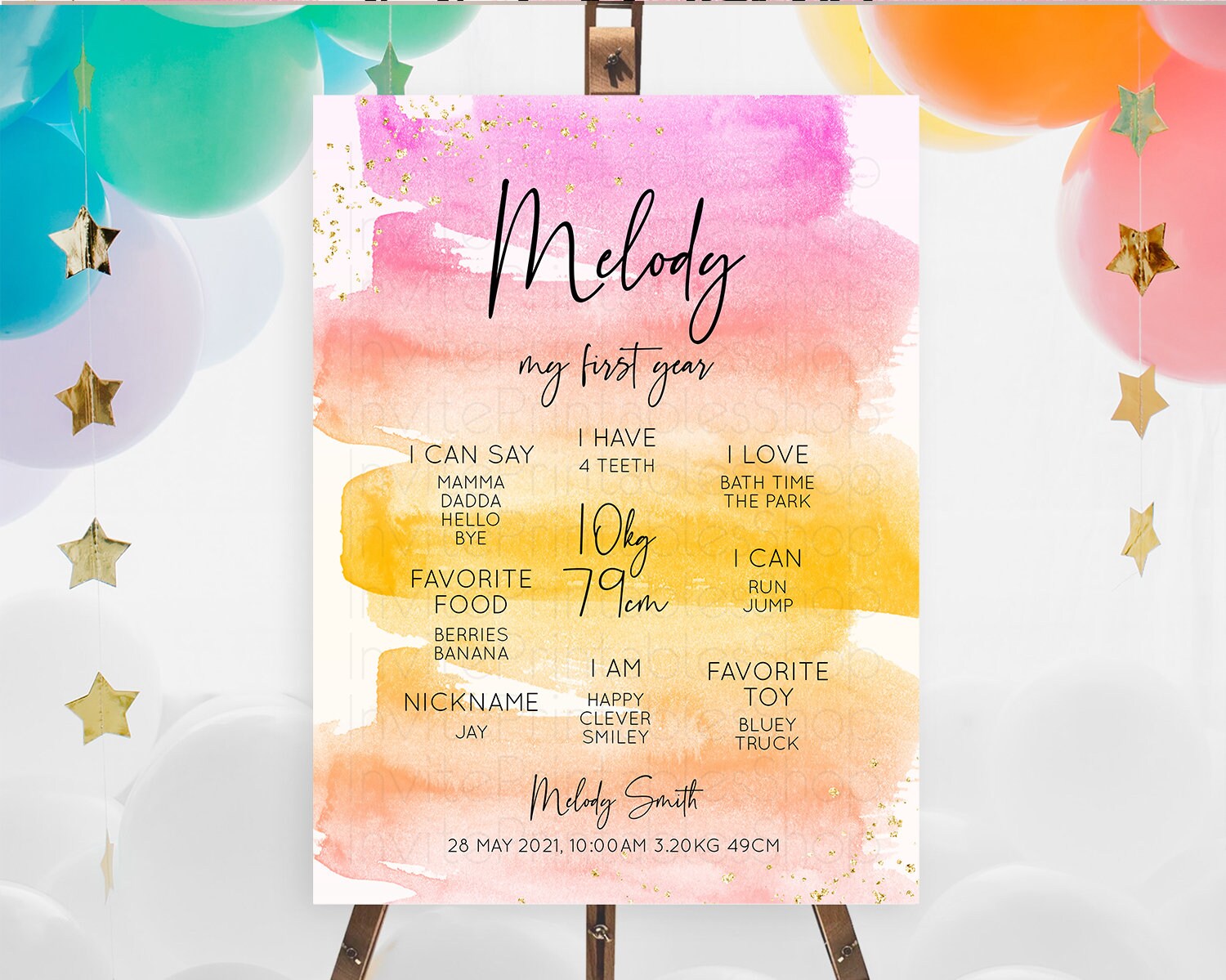 Pastel First Birthday Milestone Board Pastel Rainbow Milestone Poster Colorful Confetti Watercolor Glitter 1st Birthday Welcome Sign D10520