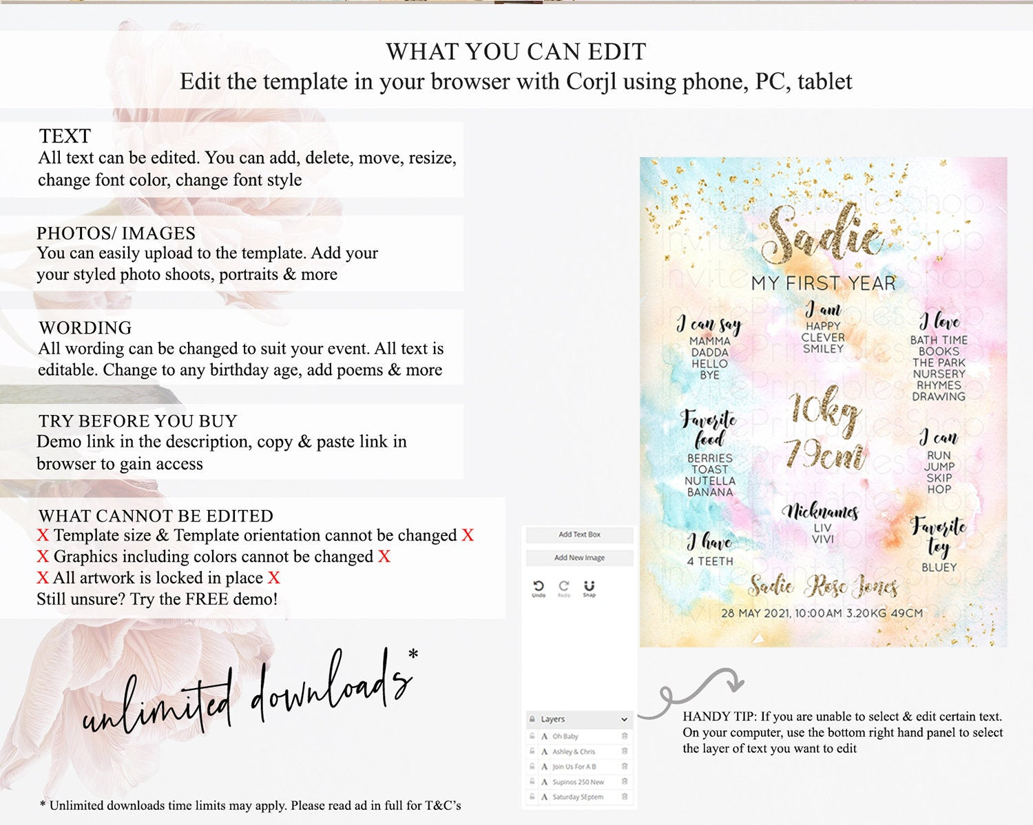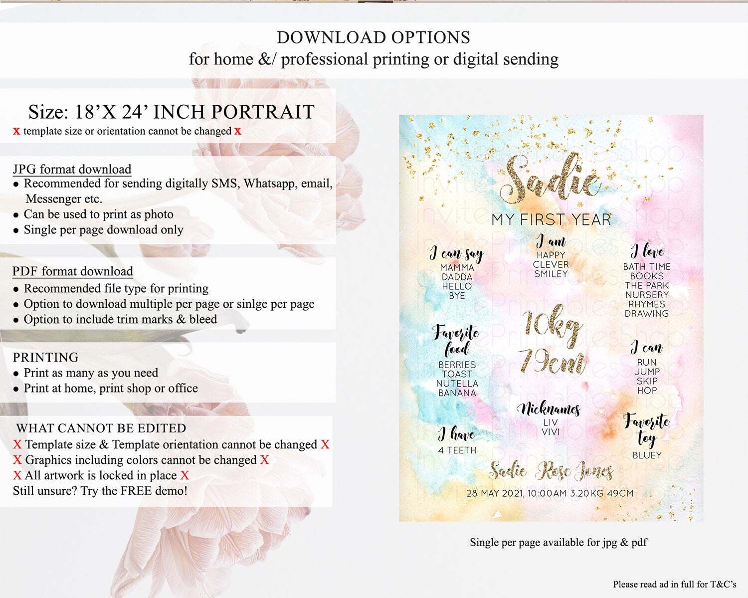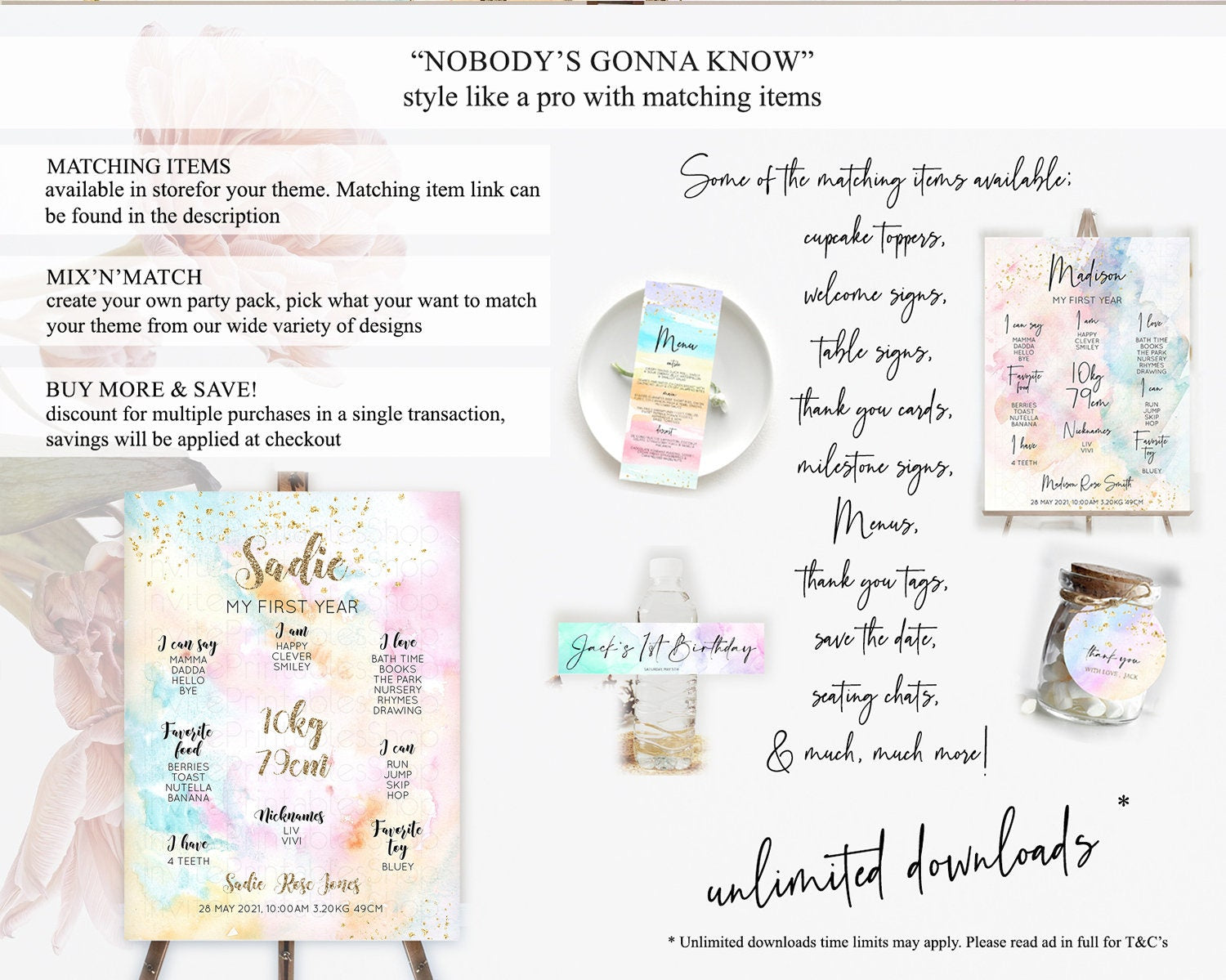 Pastel First Birthday Milestone Board Pastel Rainbow Milestone Poster Colorful Confetti Watercolor Glitter 1st Birthday Welcome Sign D10548