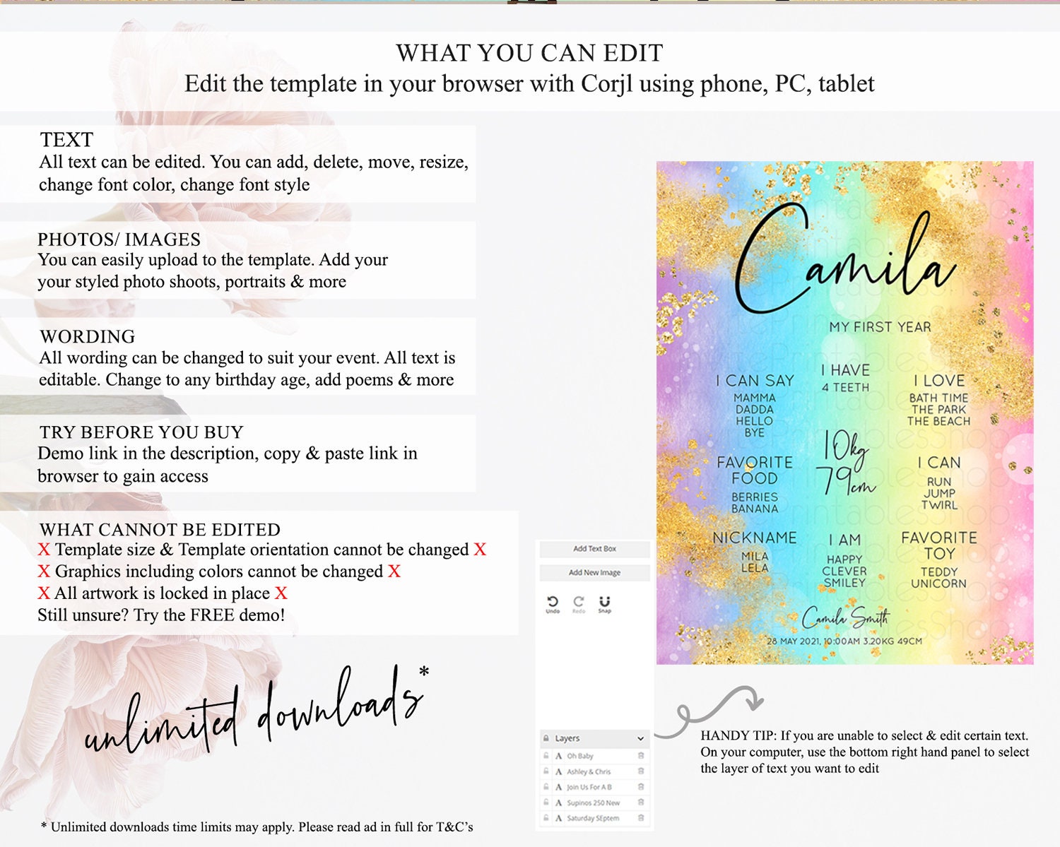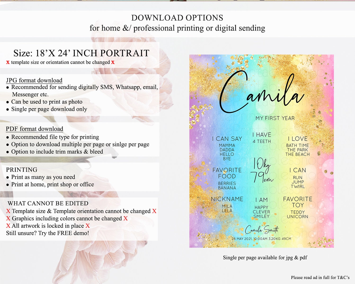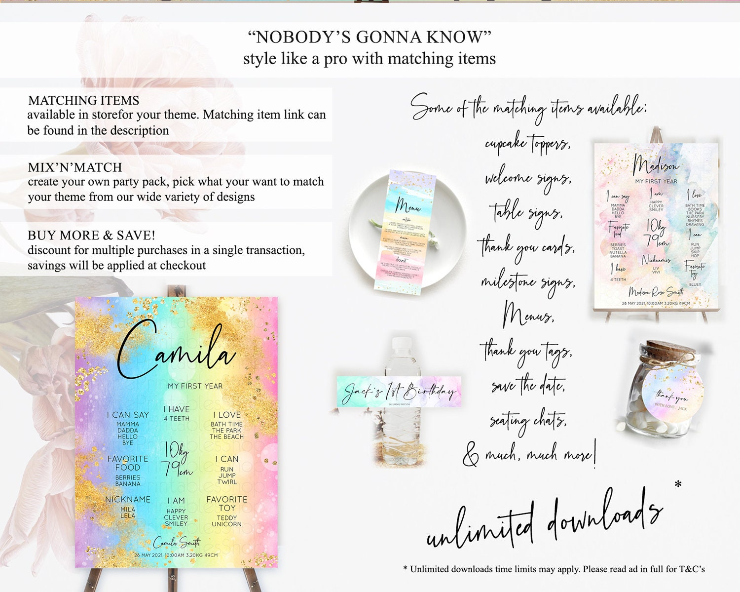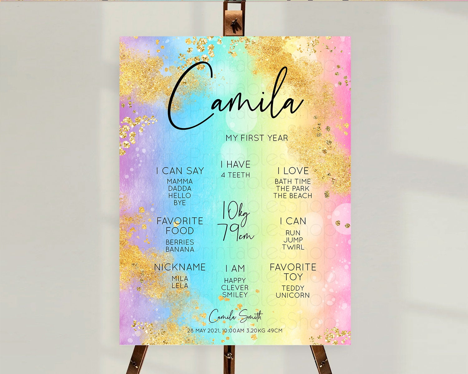 Pastel First Birthday Milestone Board Pastel Rainbow Milestone Poster Colorful Confetti Watercolor Glitter 1st Birthday Welcome Sign D10559