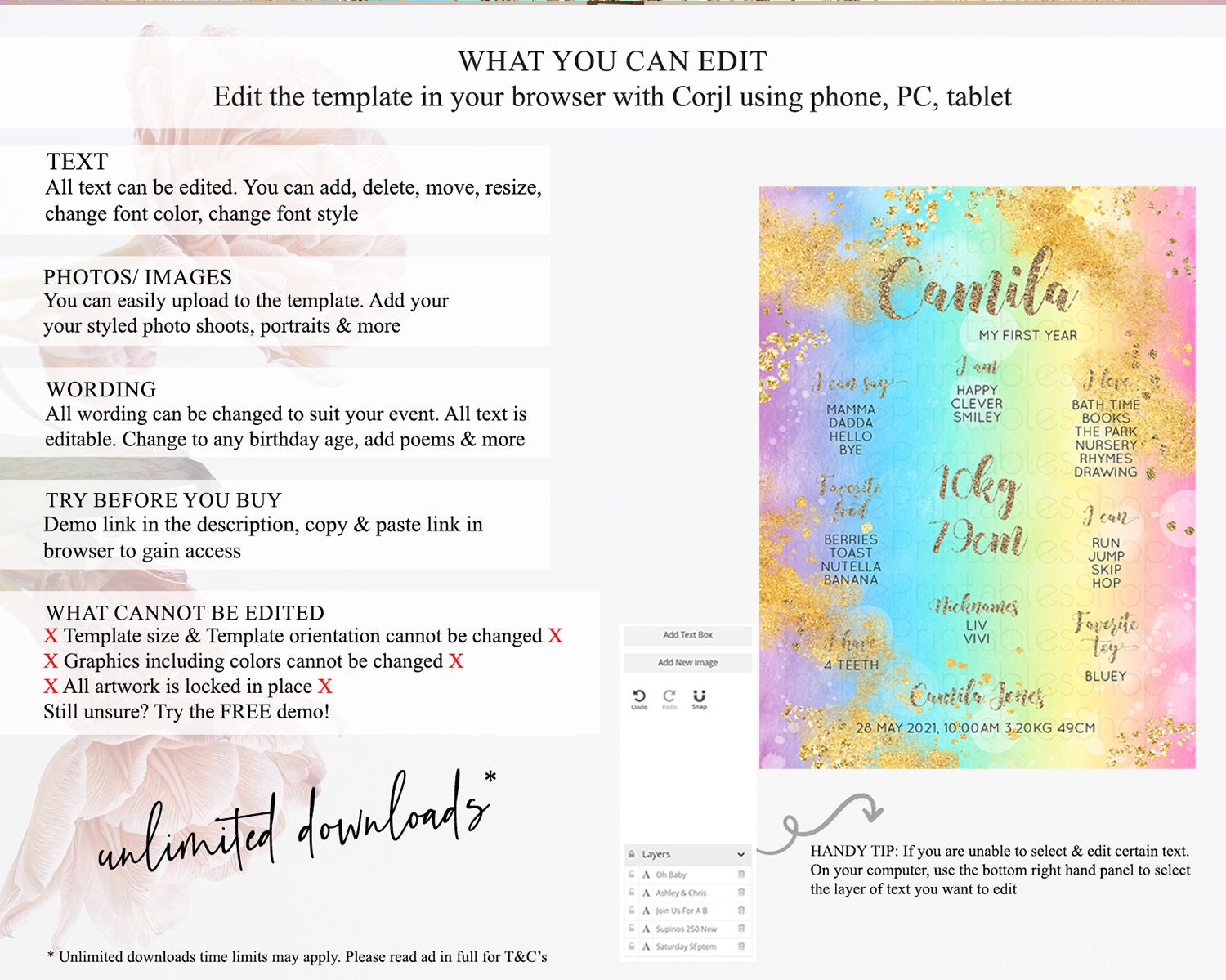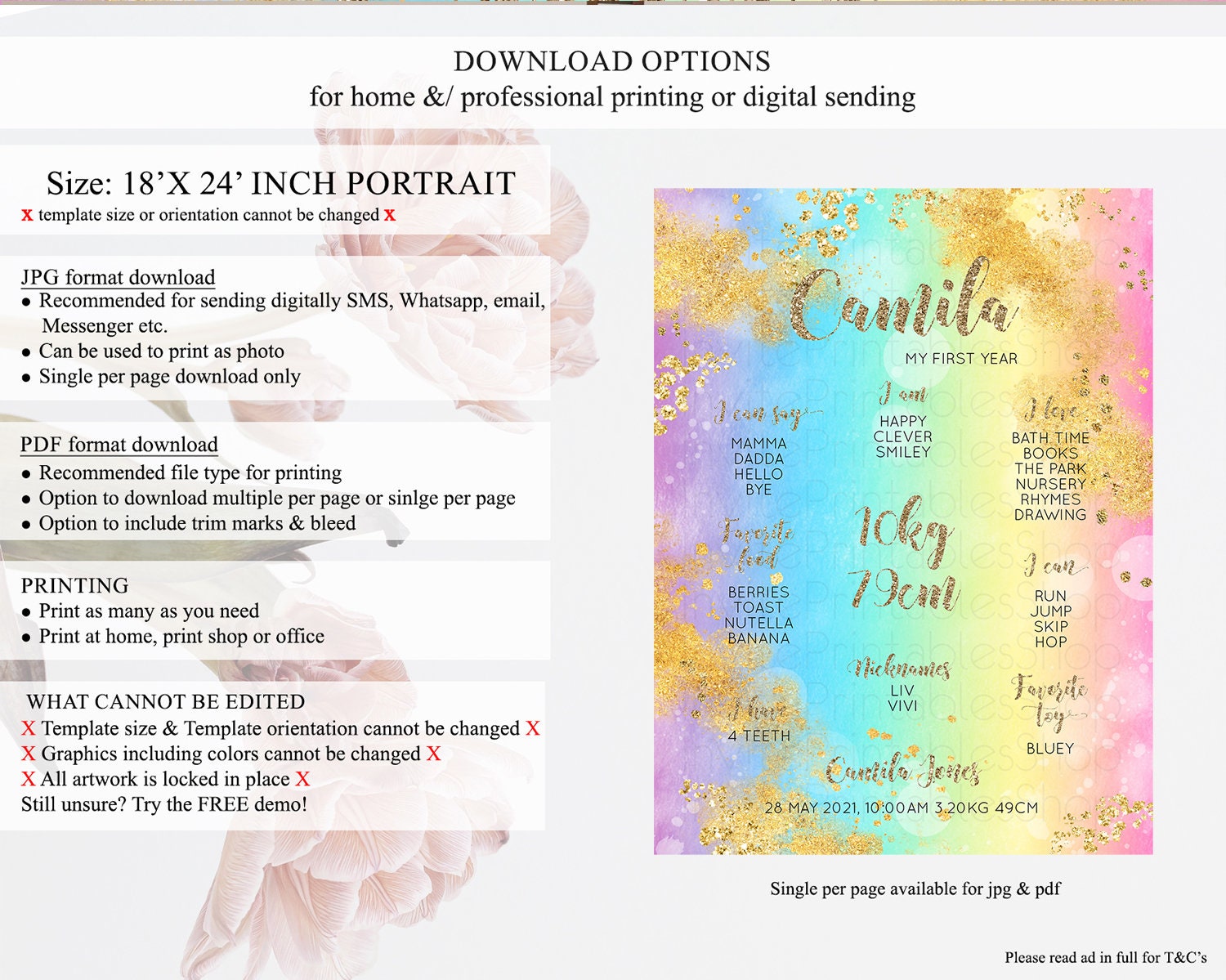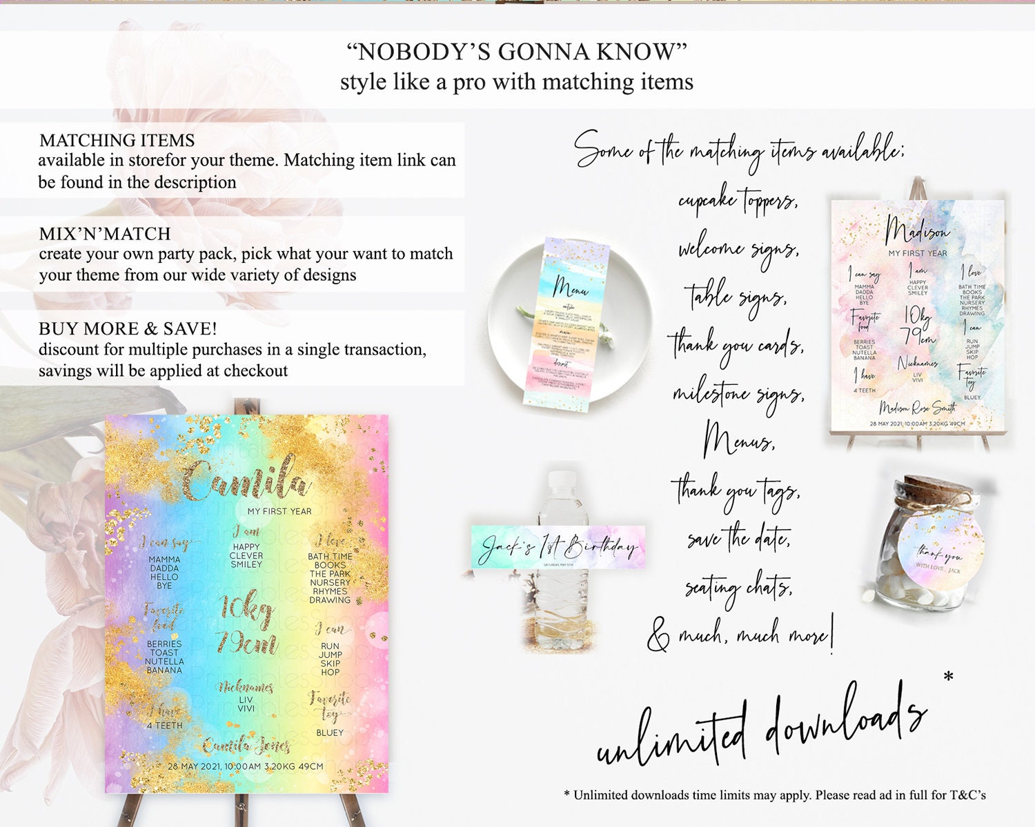Pastel First Birthday Milestone Board Pastel Rainbow Milestone Poster Colorful Confetti Watercolor Glitter 1st Birthday Welcome Sign D10561